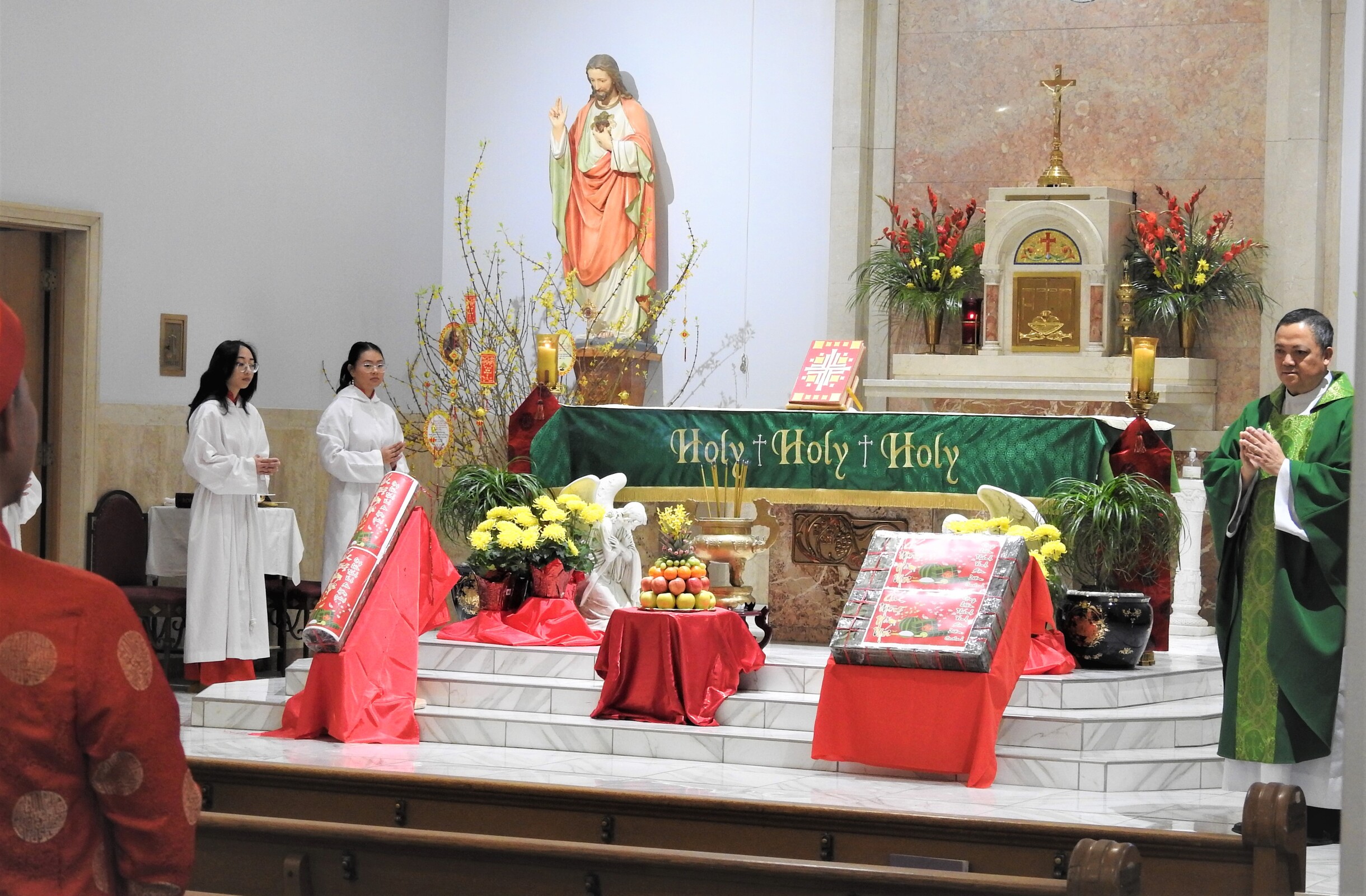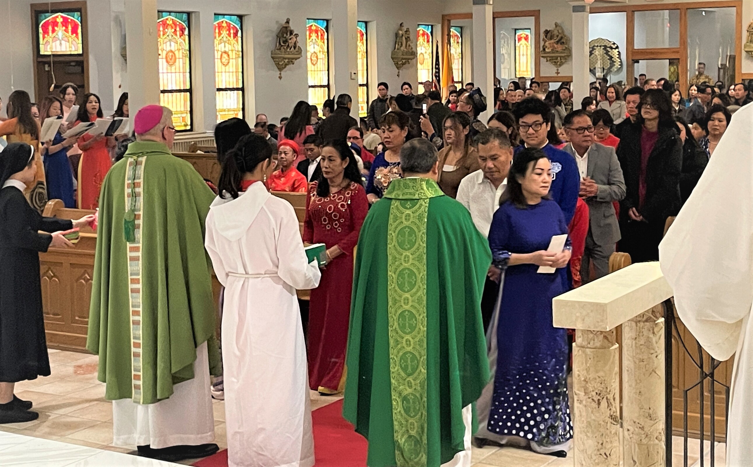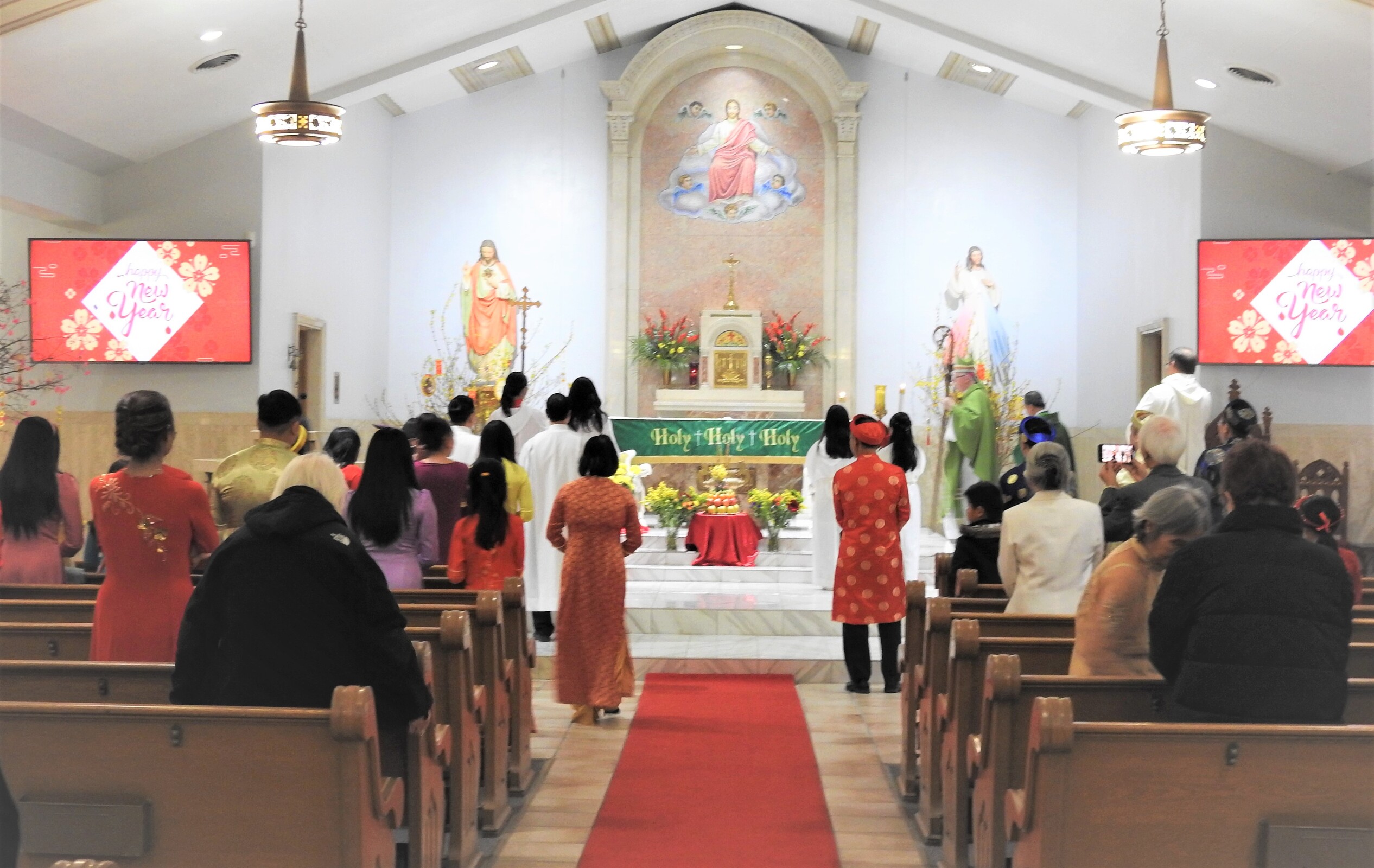 Auxiliary Bishop Michael Woost celebrated Mass for the Vietnamese community. The liturgy was in English and Vietnamese and incorporated some of the Vietnamese traditions, including the use of incense sticks, displays of fruit in front of the altar and cherry blossoms. Members of the congregation also received red envelopes of “lucky money” during the Mass.