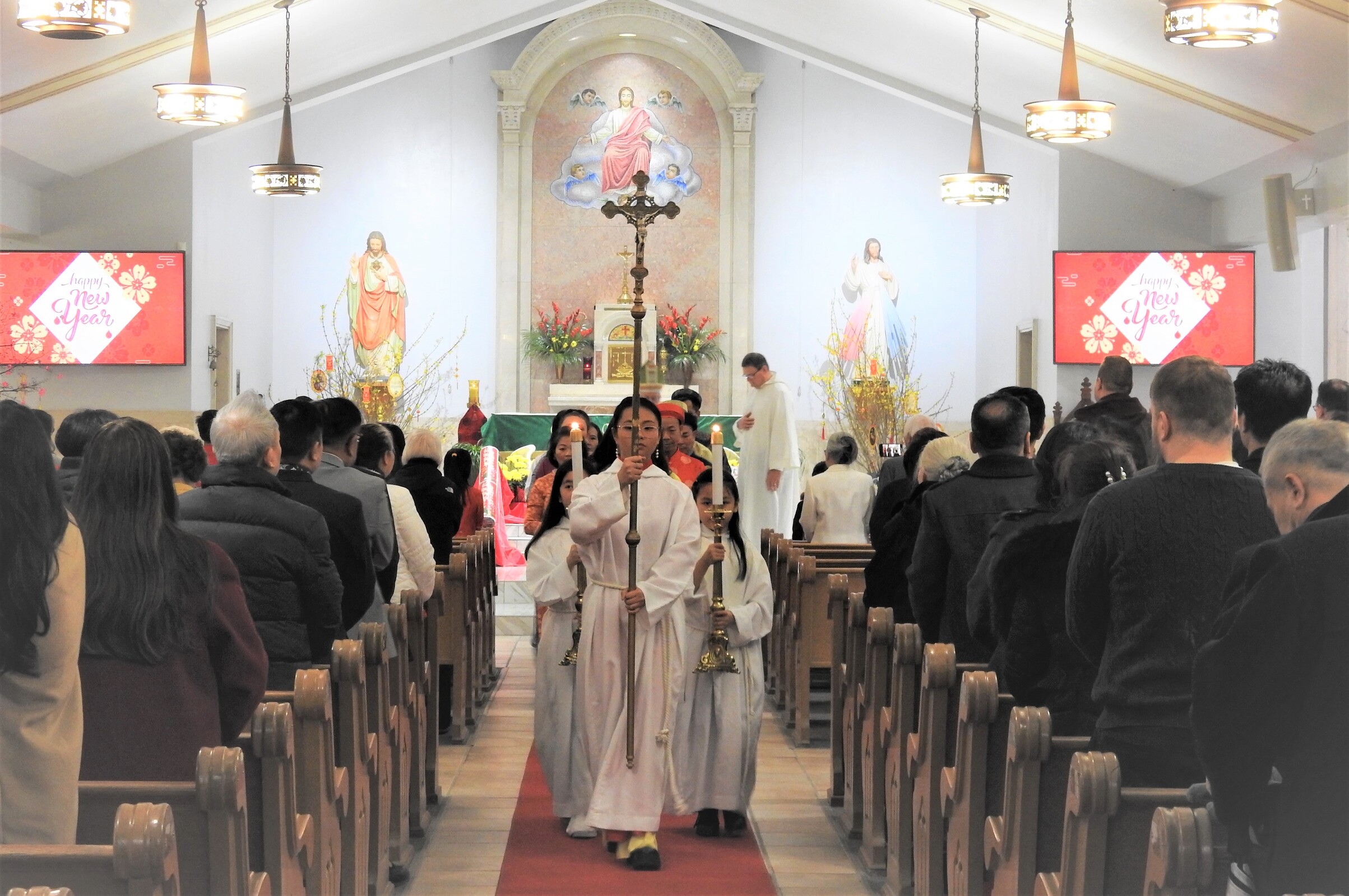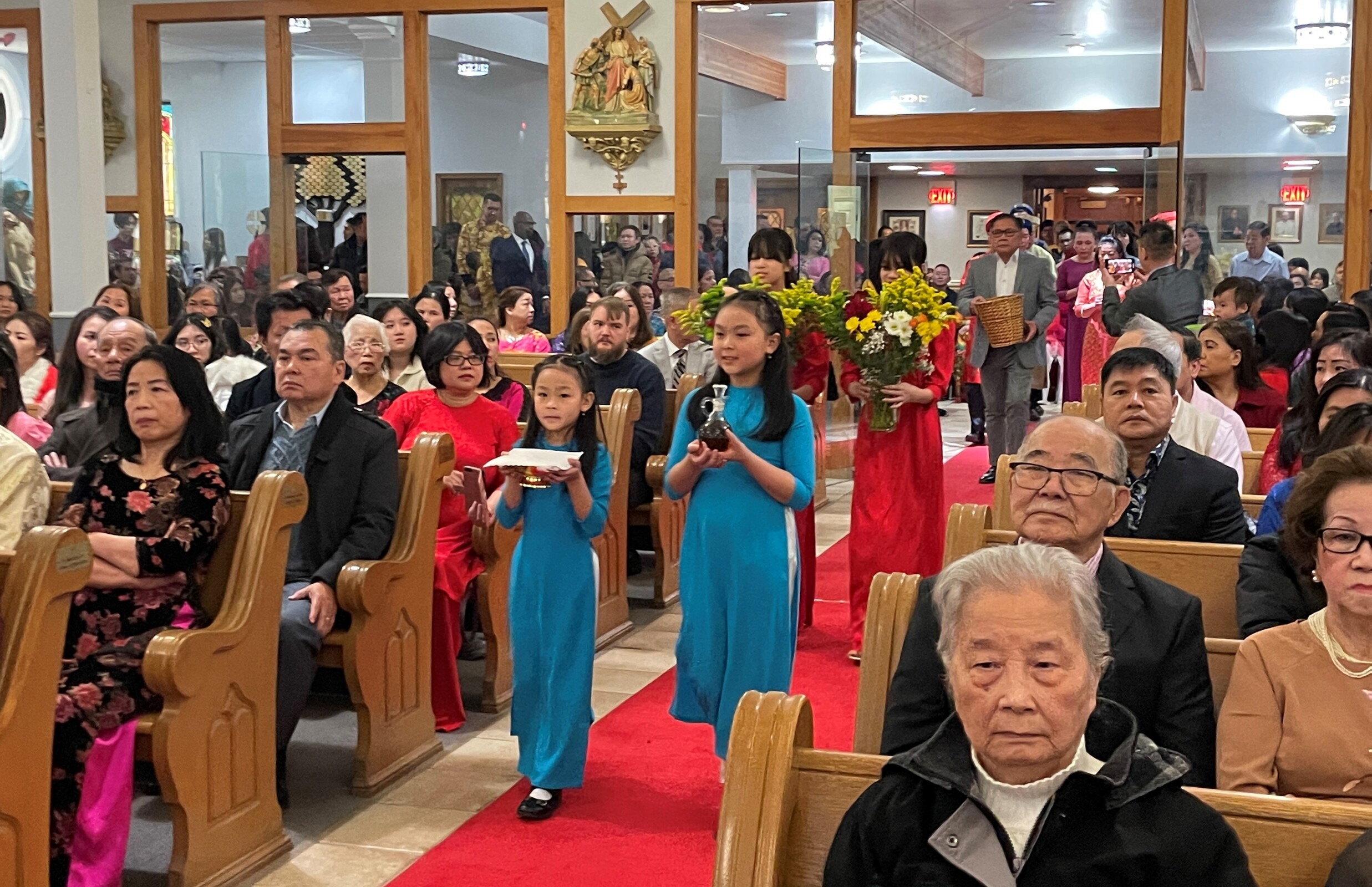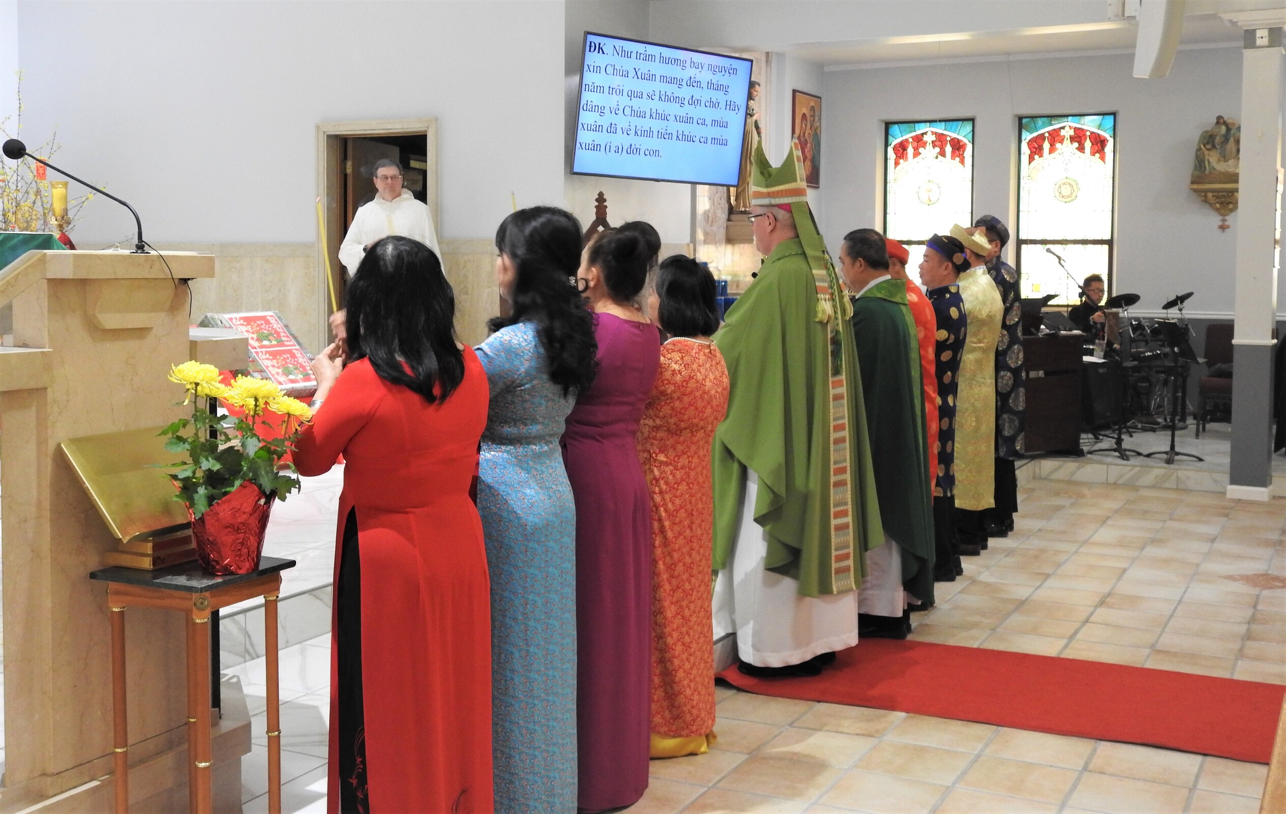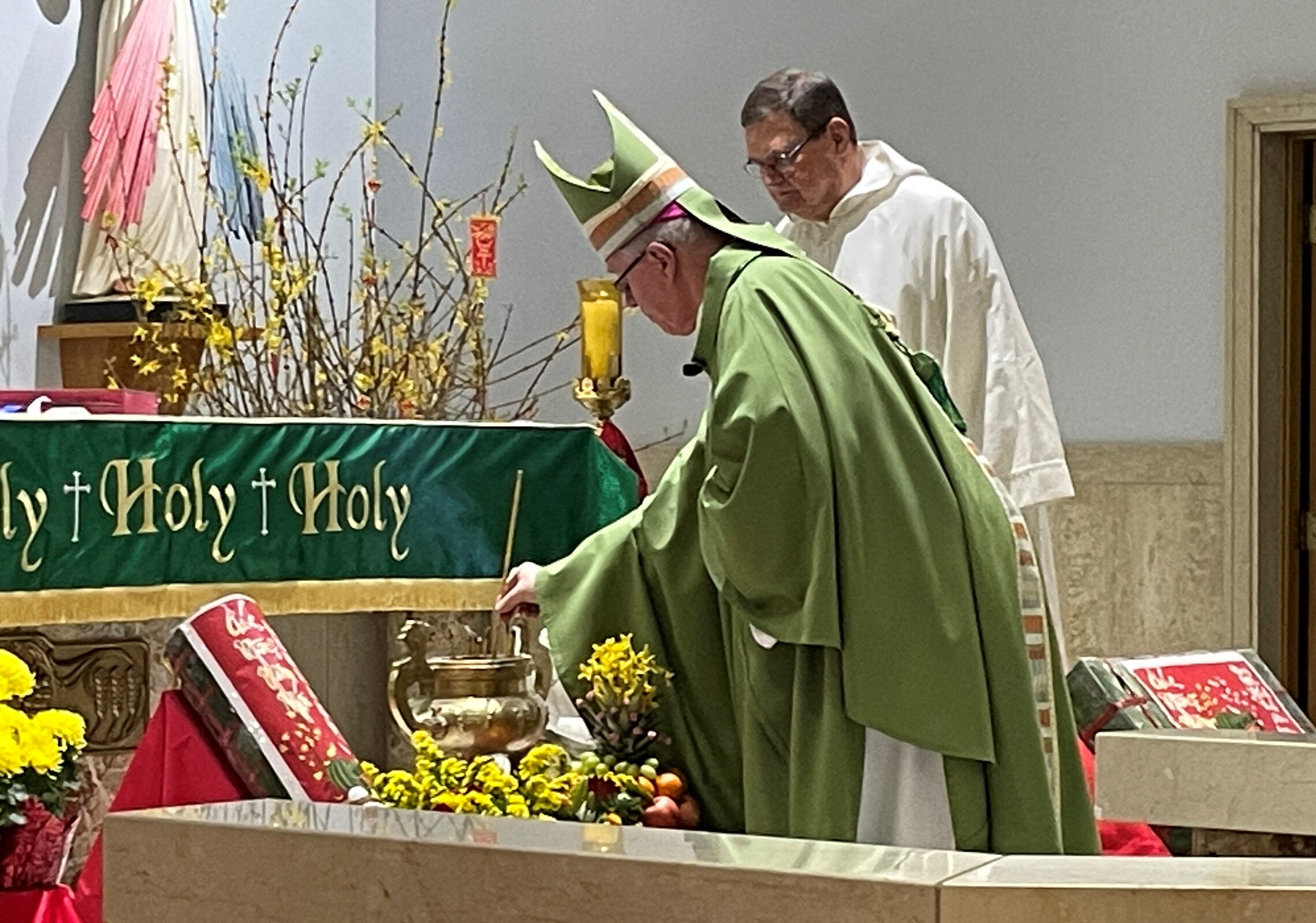 Auxiliary Bishop Michael Woost celebrated Mass for the Vietnamese community. The liturgy was in English and Vietnamese and incorporated some of the Vietnamese traditions, including the use of incense sticks, displays of fruit in front of the altar and cherry blossoms. Members of the congregation also received red envelopes of “lucky money” during the Mass.