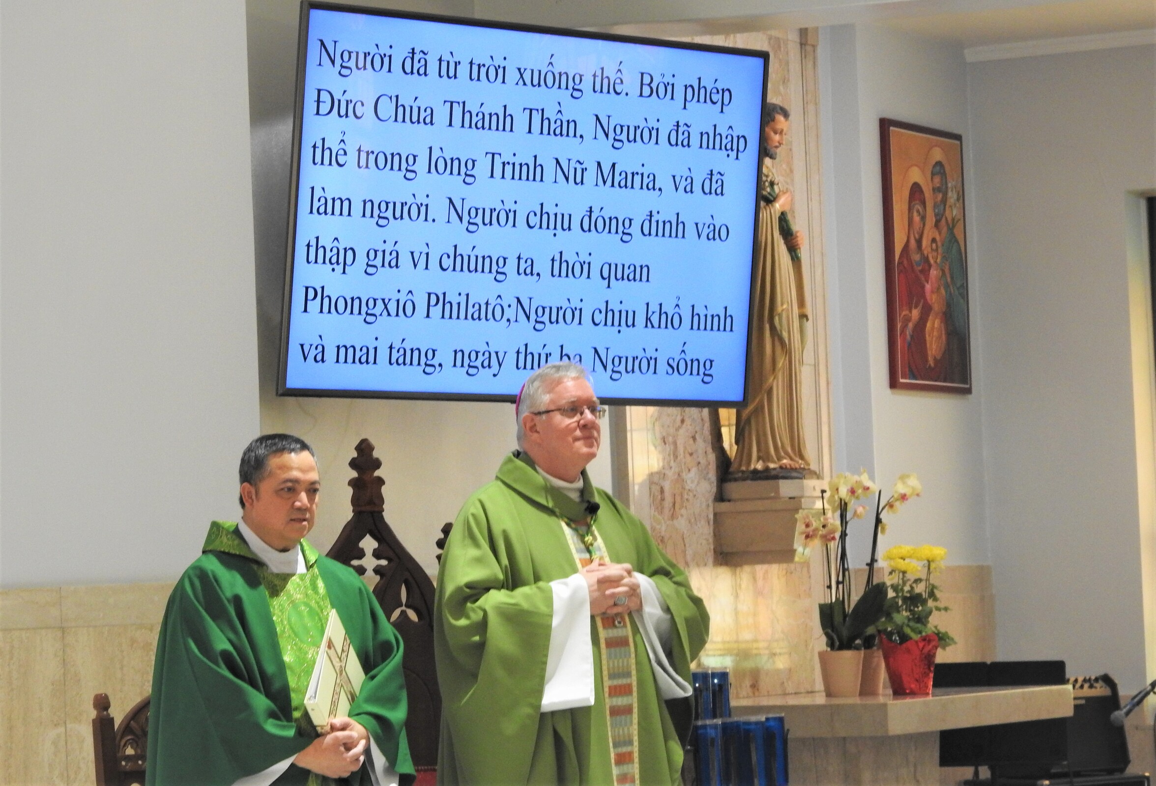 After Mass, the bishop greeted parishioners and posed for photos before heading to the school hall to enjoy a traditional Vietnamese meal and entertainment.