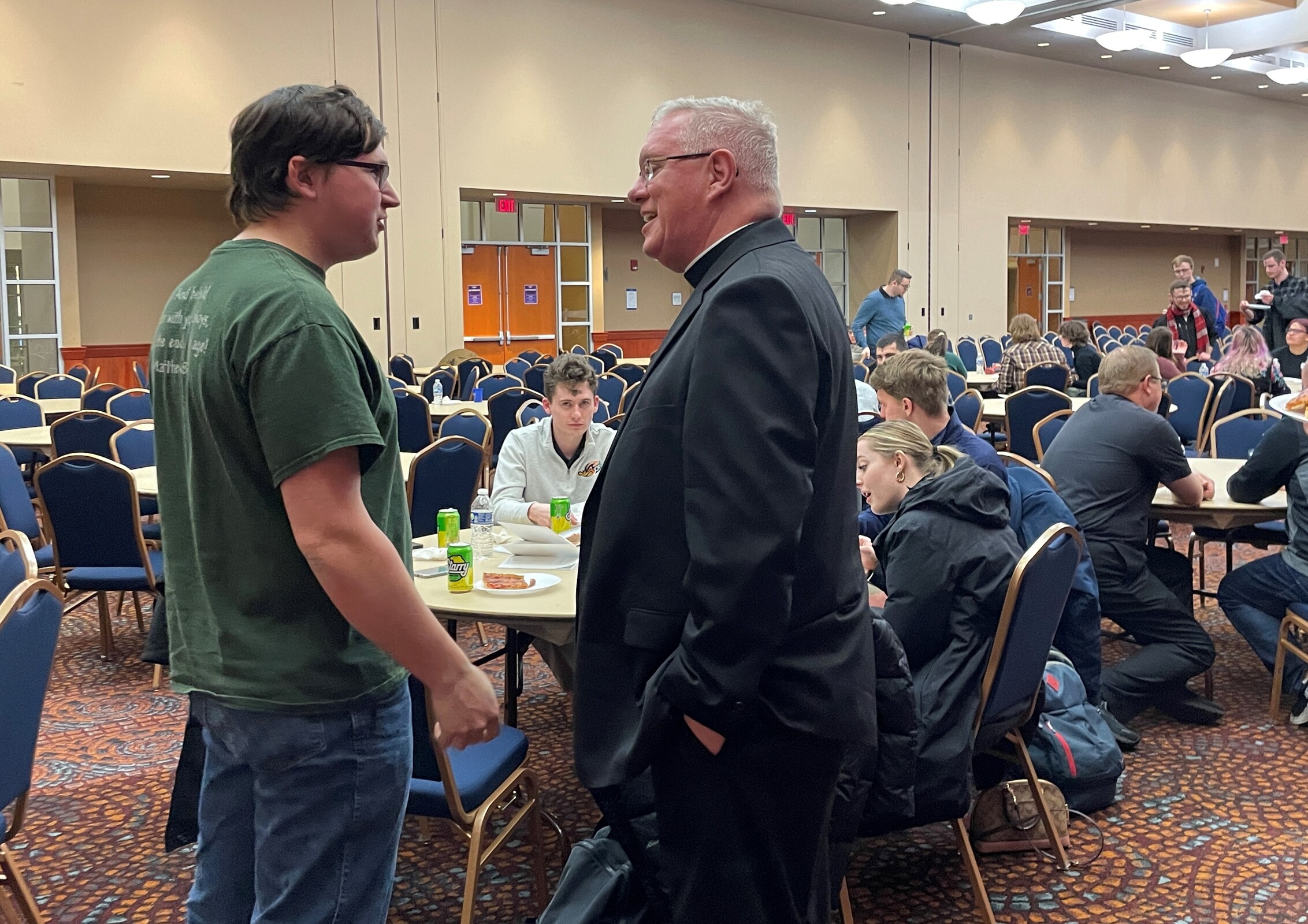 Bishop Woost spent a few minutes chatting with the students, including one who helped with the readings at Mass. The bishop learned that the young man was baptized Catholic but not raised in the faith. After discerning for a few years, he found his way to the Catholic faith and has been involved with the Rite of Christian Initiation of Adults, also called RCIA. He will come into communion with the Church – receiving his first Communion and being confirmed – during the Easter Vigil at St. Bernard Church.