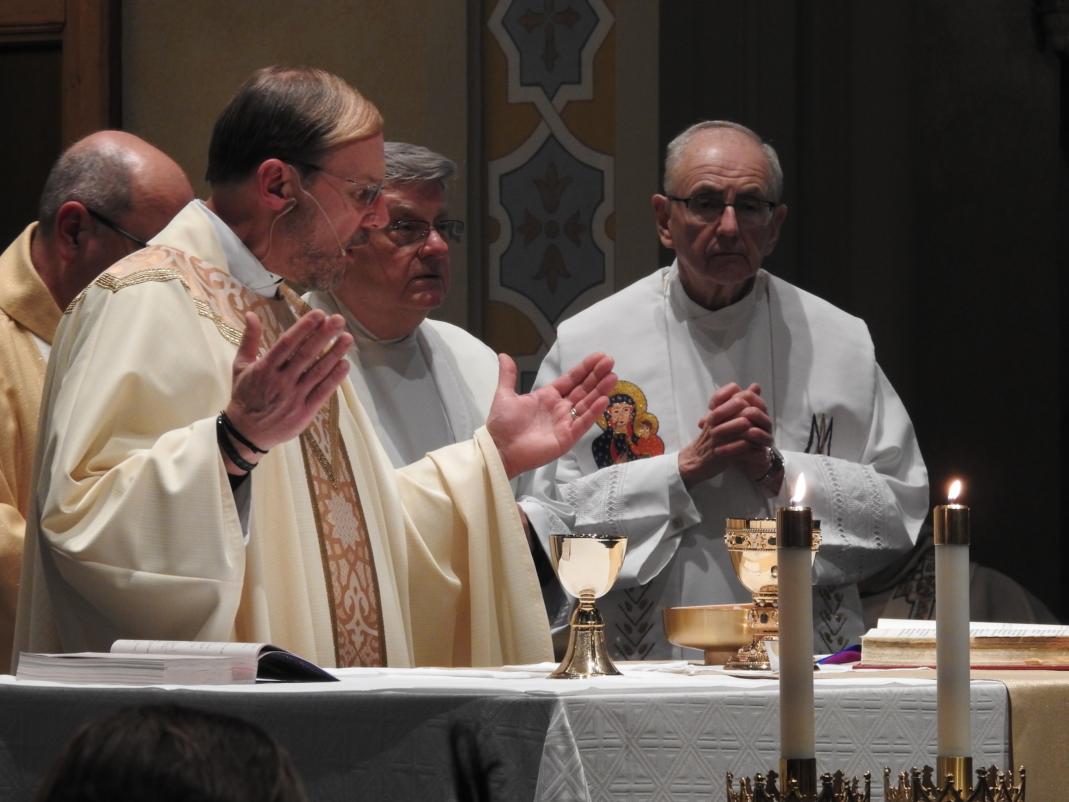 In the sacristy prior to Mass, Father Hovanec and the bishop signed the papers making his position as pastor official. He had been parish administrator since the retirement and death last summer of the previous pastor, Father Robert Glepko, who was remembered fondly at the Mass. Father Glepko’s chalice, which was bequeathed to the parish by his family, was used for the Mass.