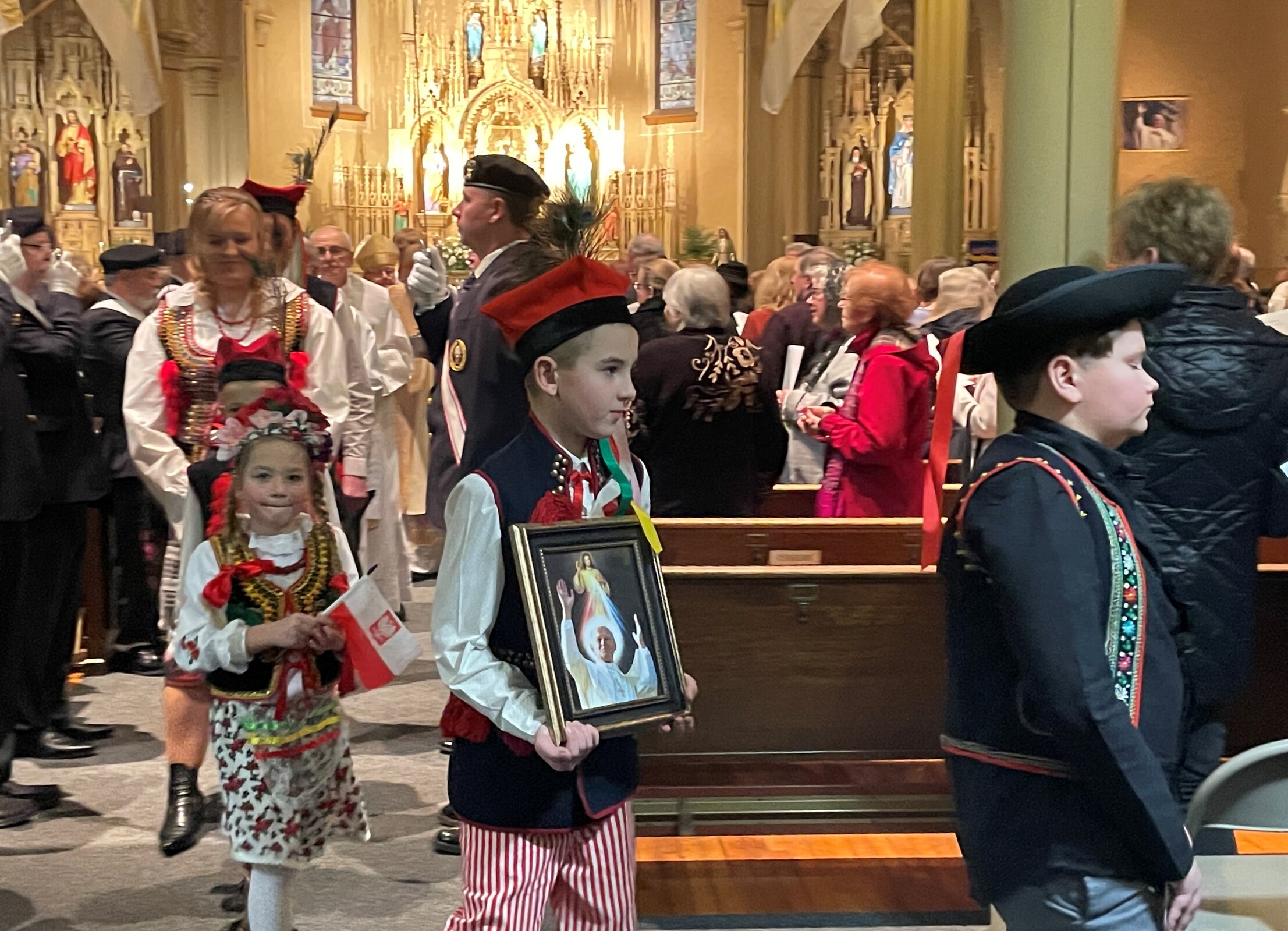 The parish’s Polish heritage was evident as representatives of the ethnic community processed into the church wearing their native garb. The bishop was presented with a loaf of bread and some salt, a traditional Polish welcome.