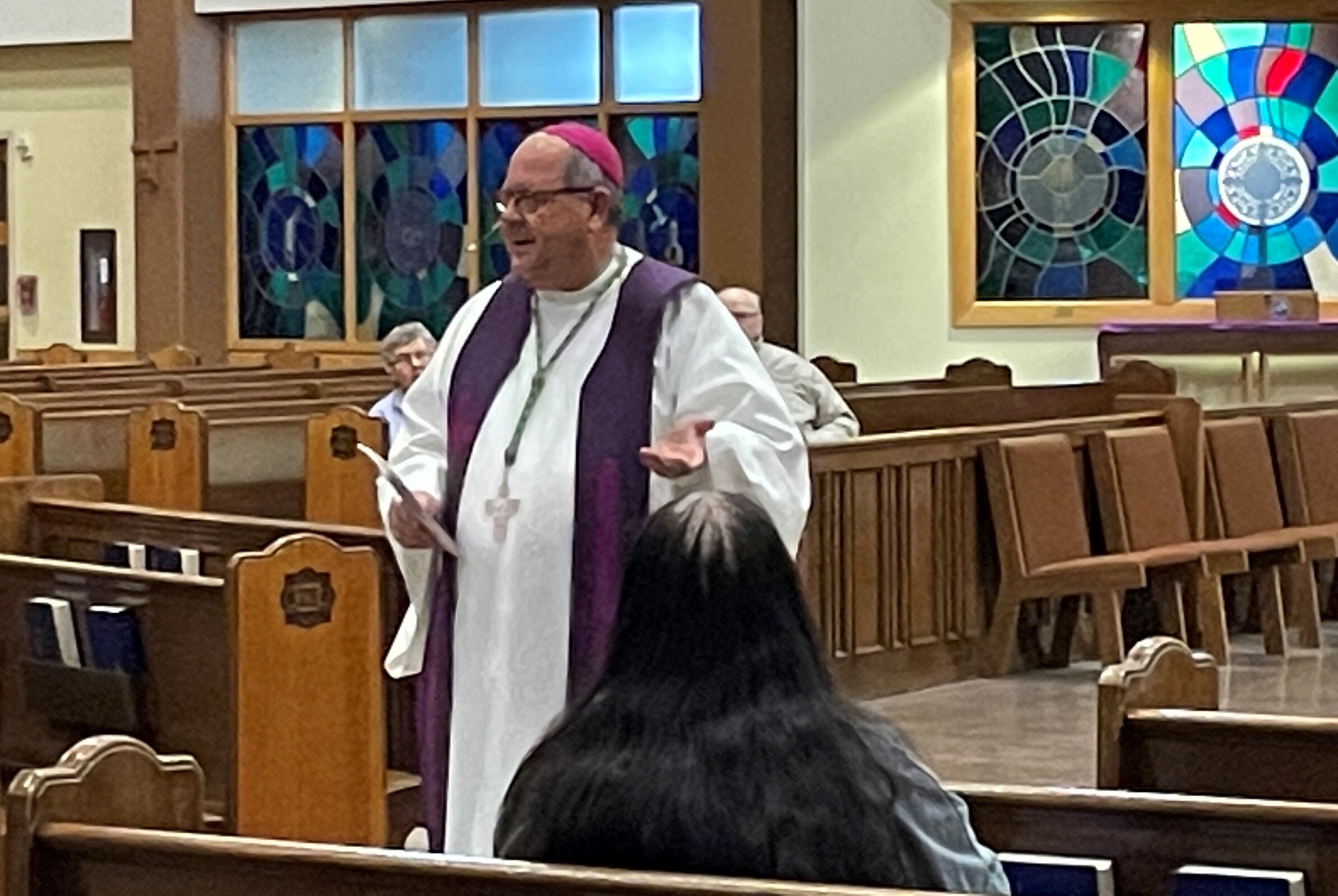 The bishop spent time on Feb. 24 resuming a Lenten tradition by visiting with parishioners, enjoying a fish fry and praying Stations of the Cross in the church.