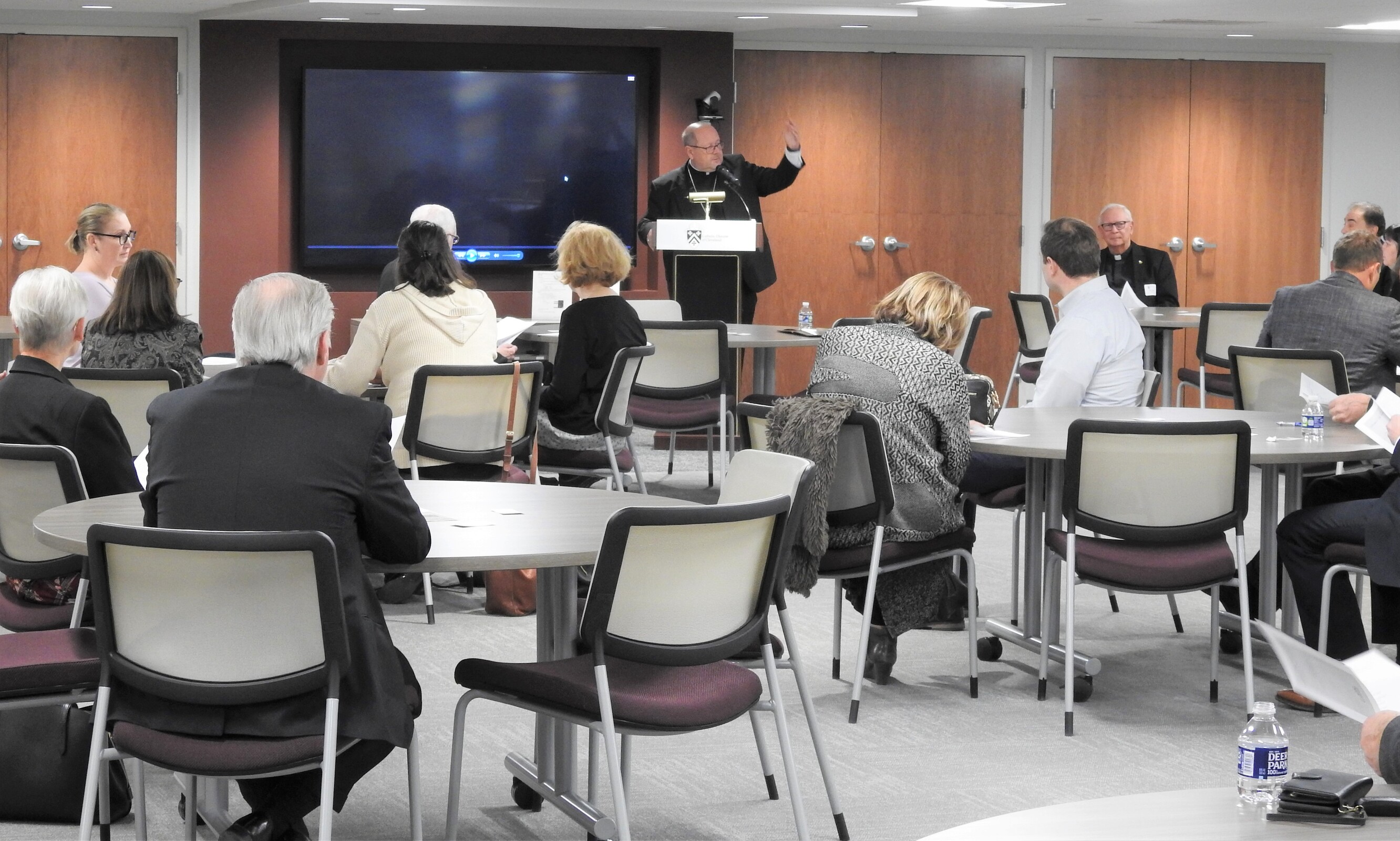 Members of the Lawyer’s Guild of the Catholic Diocese of Cleveland spent about two hours on March 20 socializing, praying evening prayer, enjoying a simple soup, salad and sandwich meal and listening to a Lenten reflection from Bishop Edward Malesic. The group gathered in the diocesan Cathedral Square Plaza offices.