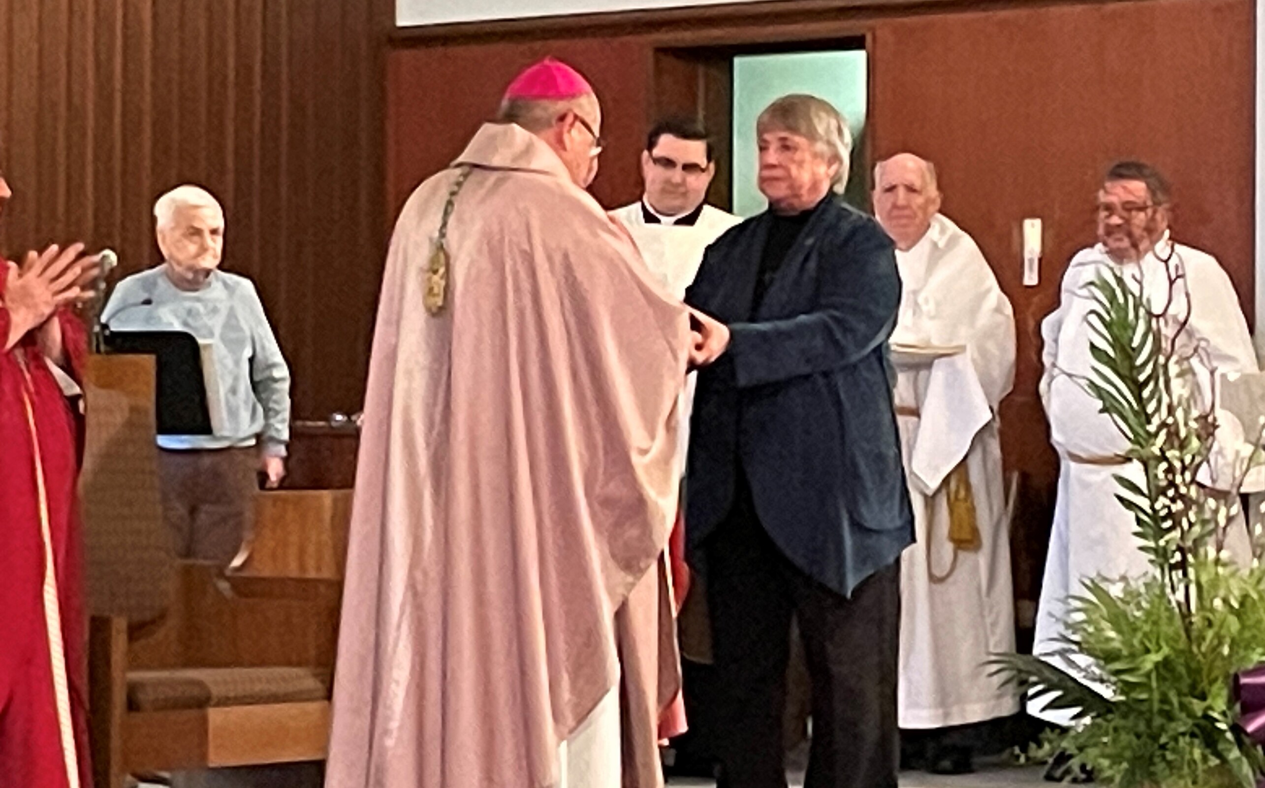 At the beginning of Mass, Parish Life Coordinator Melissa Keegan presented the bishop with a centennial memento.