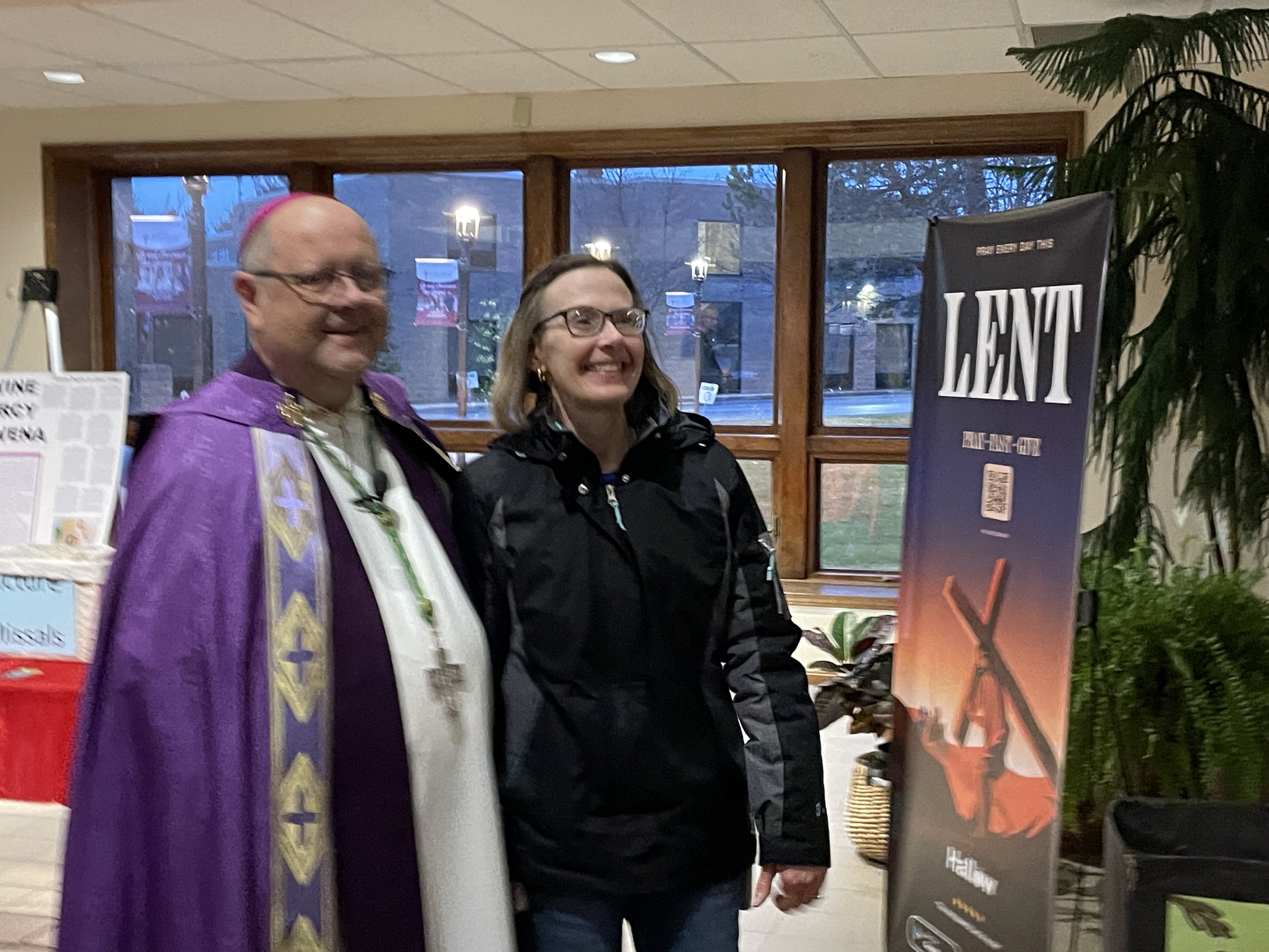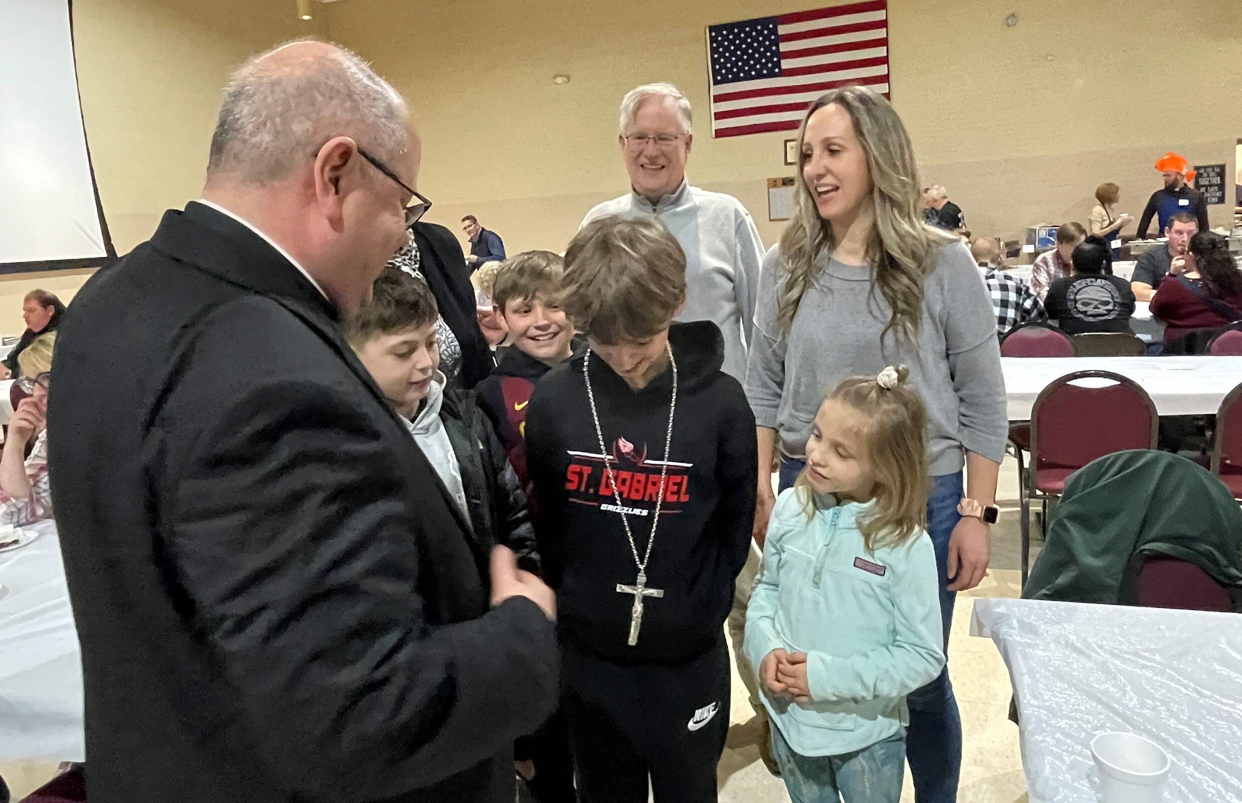 With Lent drawing to a close. Bishop Edward Malesic traveled to St. Gabriel Parish in Concord Township for a fish fry and to pray Stations of the Cross on March 31. He was welcomed by Father Fred Pausche, pastor; Father David Stavarz, parochial vicar; parish staff, fish fry volunteers and others.