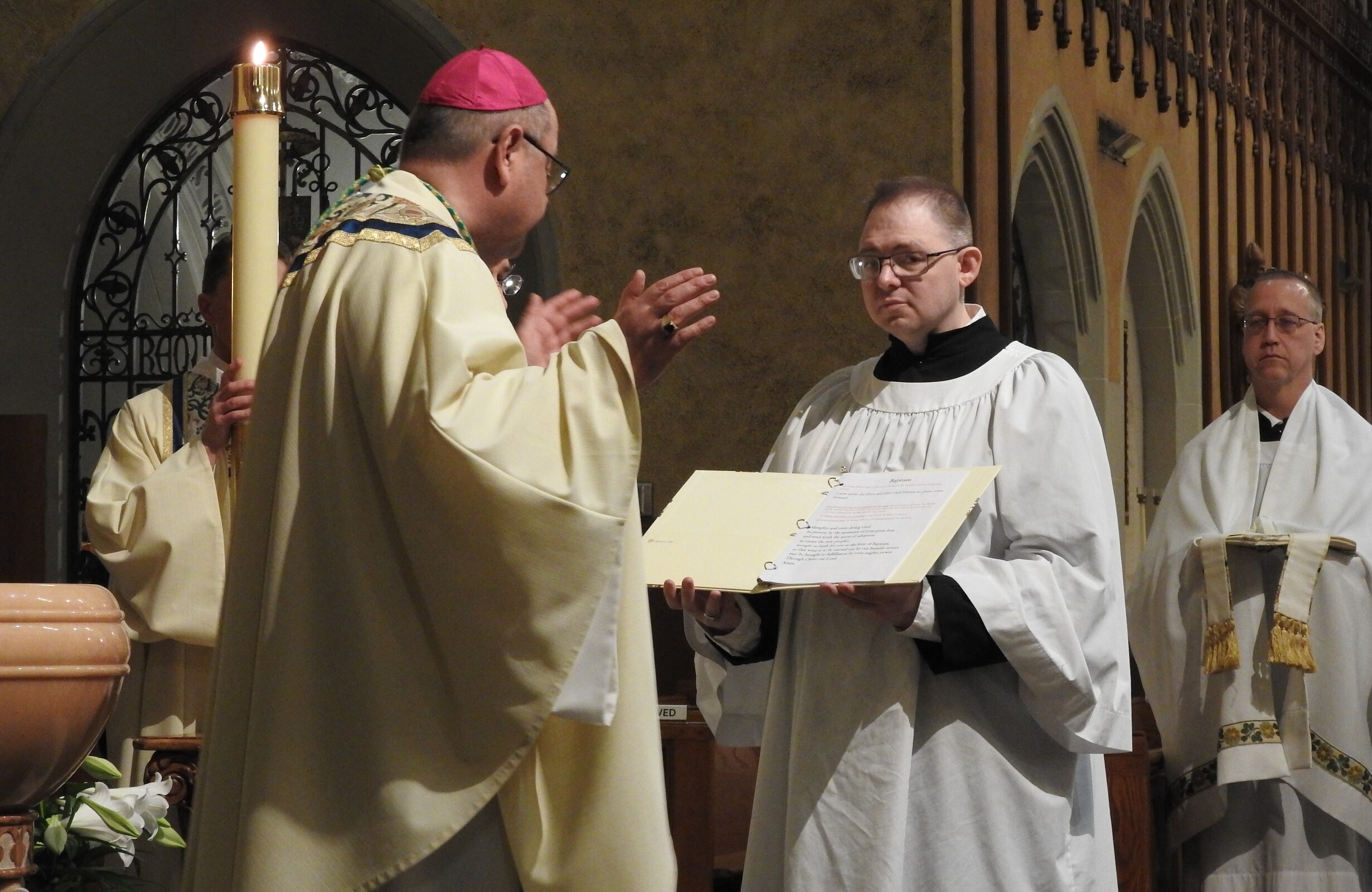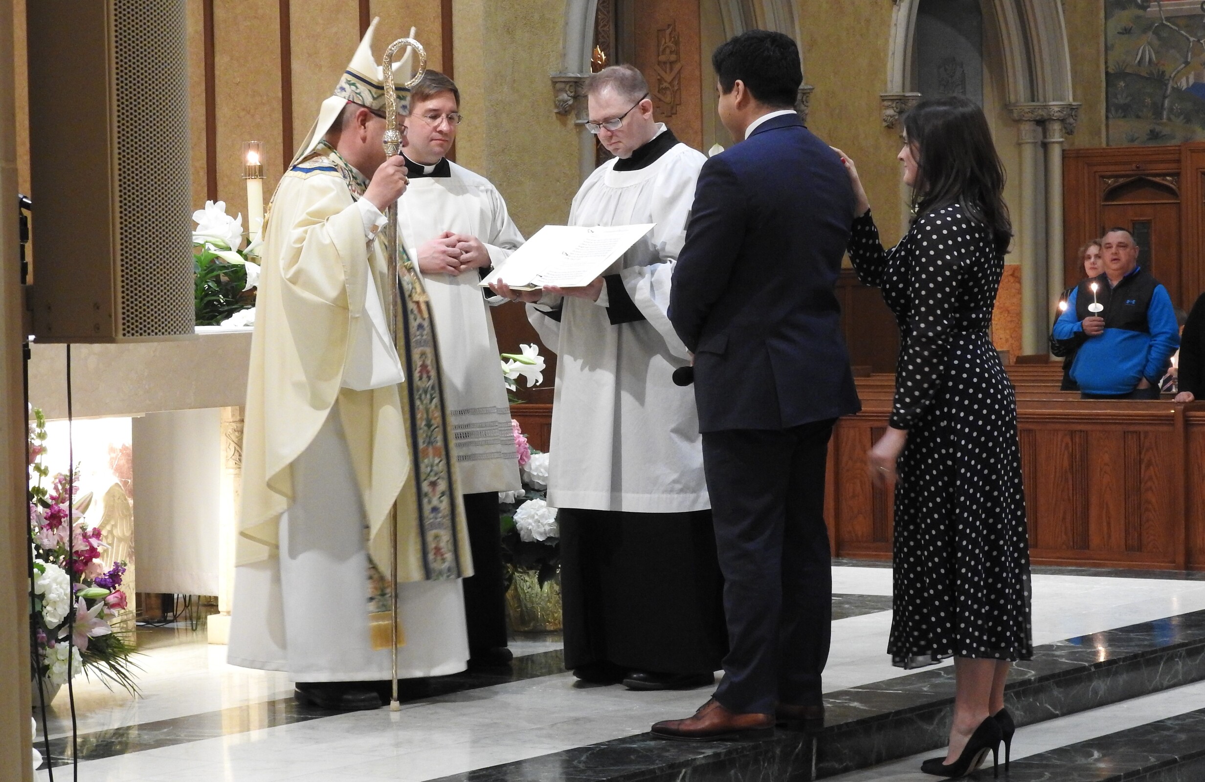 Bishop Malesic, the concelebrants, deacon, altar servers, catechumens and candidate processed to the front of the cathedral where the paschal candle was placed in its holder and the lights in the church were turned on.