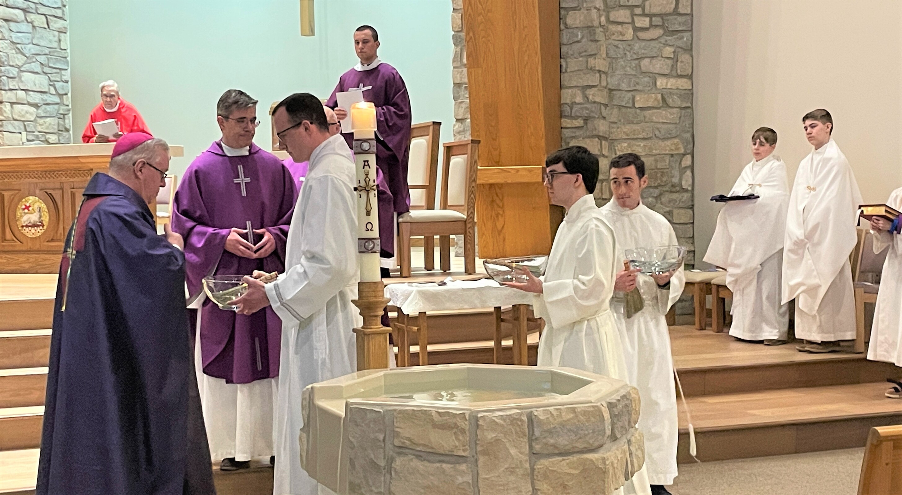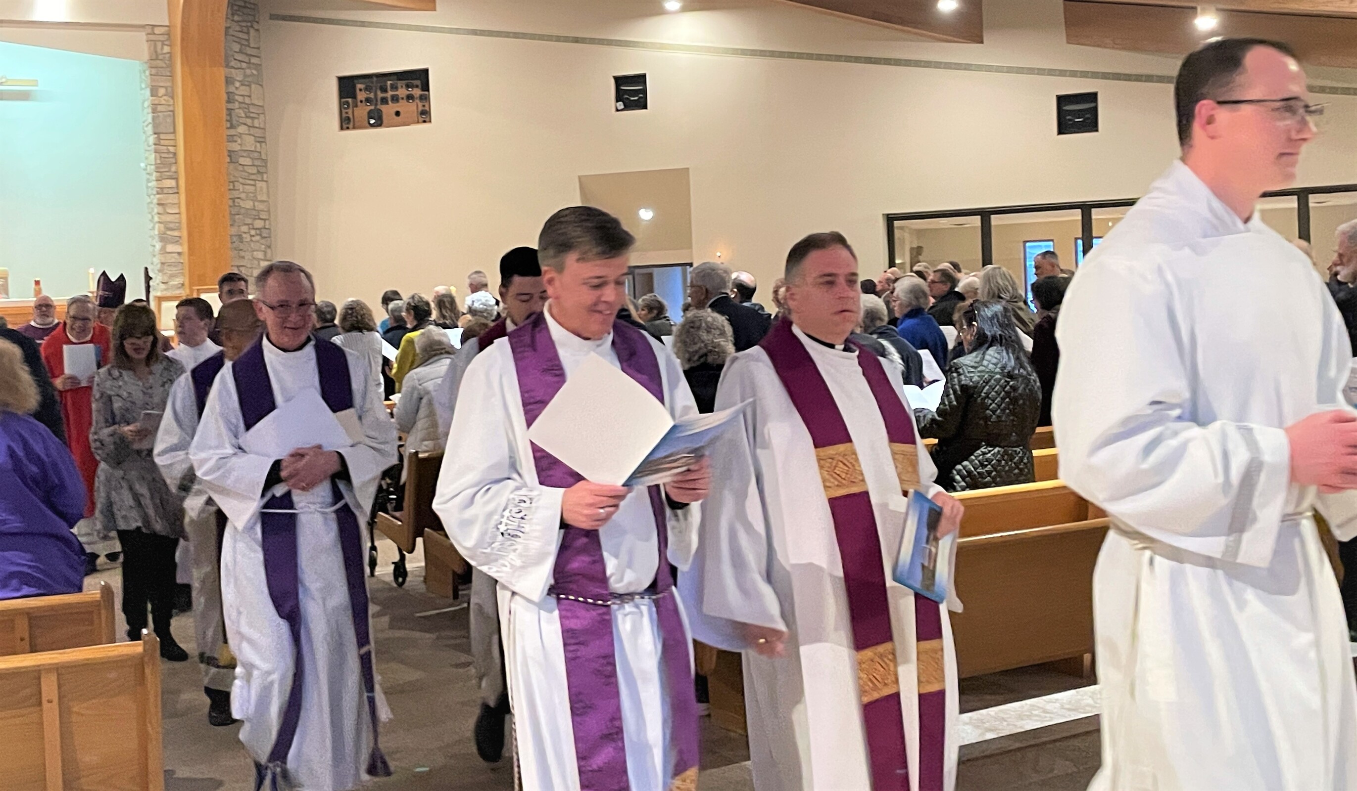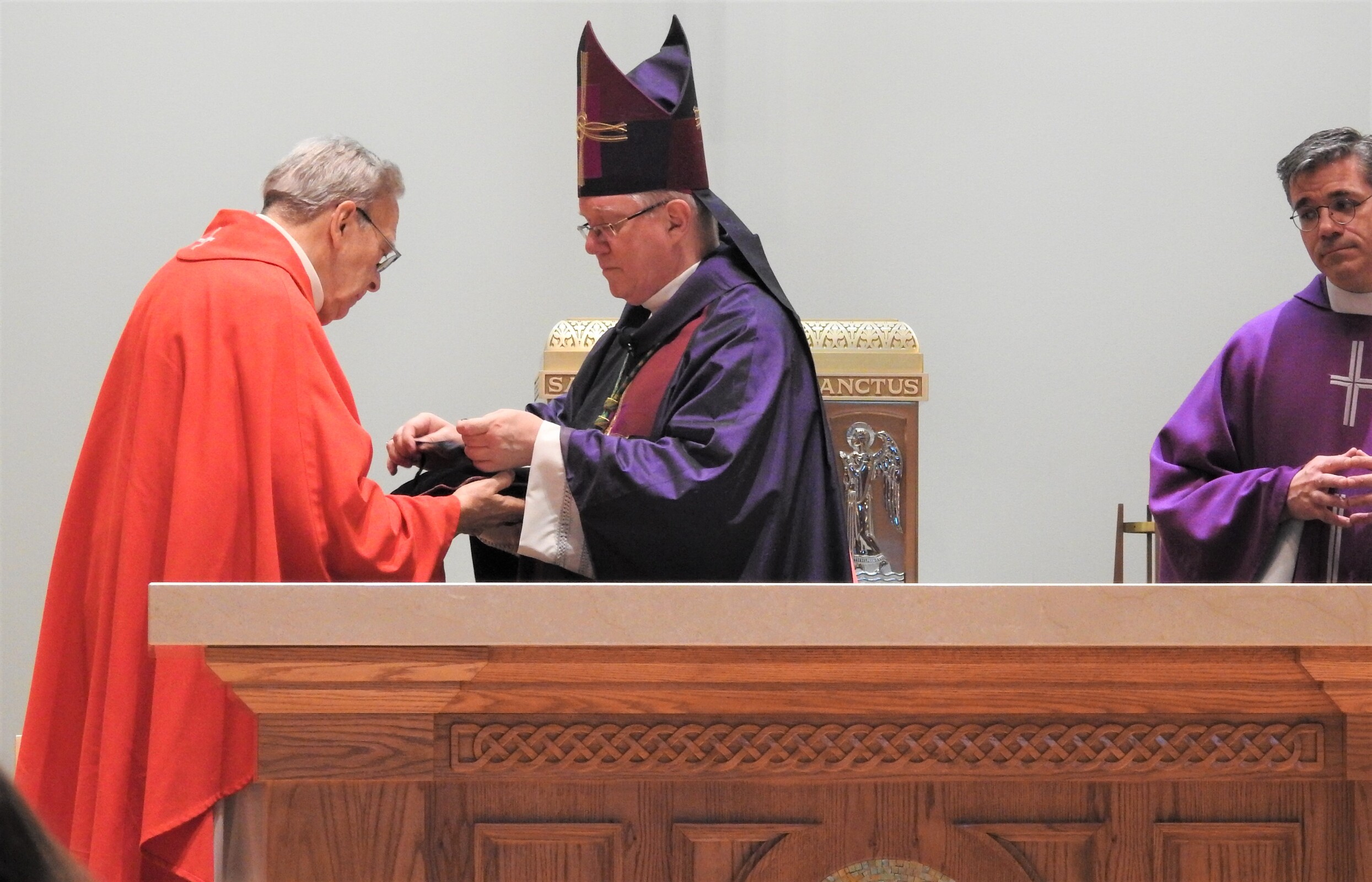 As the altar dedication proceeded, Father Mark Hollis presented the bishop with three saints’ relics to be inserted in the altar. Father Hollis began his priestly ministry 51 years ago at St. Brendan. Relics of Saints Thomas Beckett, Bernadette of Soubirous and John Vianney were inserted in the altar by Bishop Woost. Other relics were placed in the altar previously. The bishop explained that Father Hollis wore red vestments because he was carrying the relics of a martyr. The bishop, concelebrants and deacons were vested in the traditional Lenten purple.