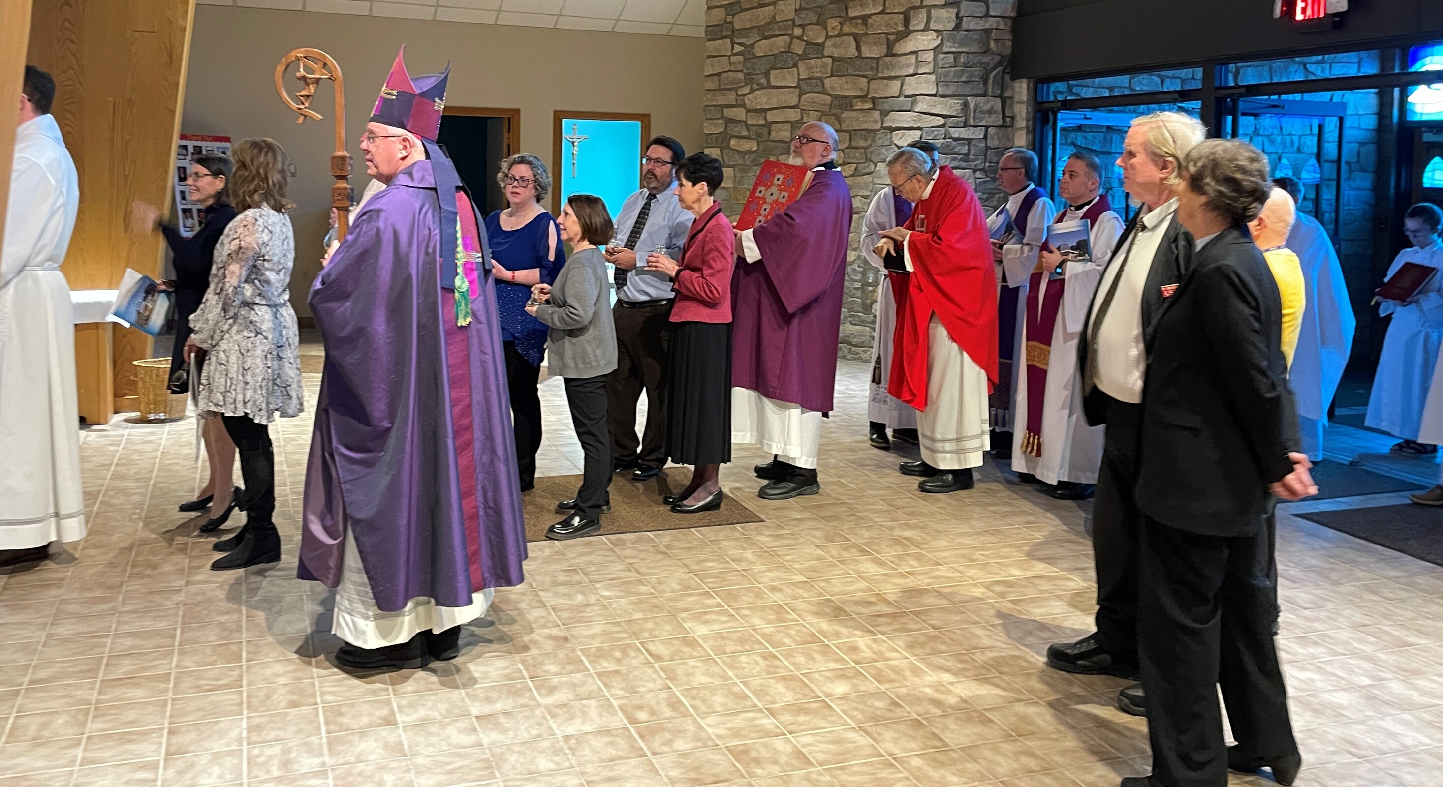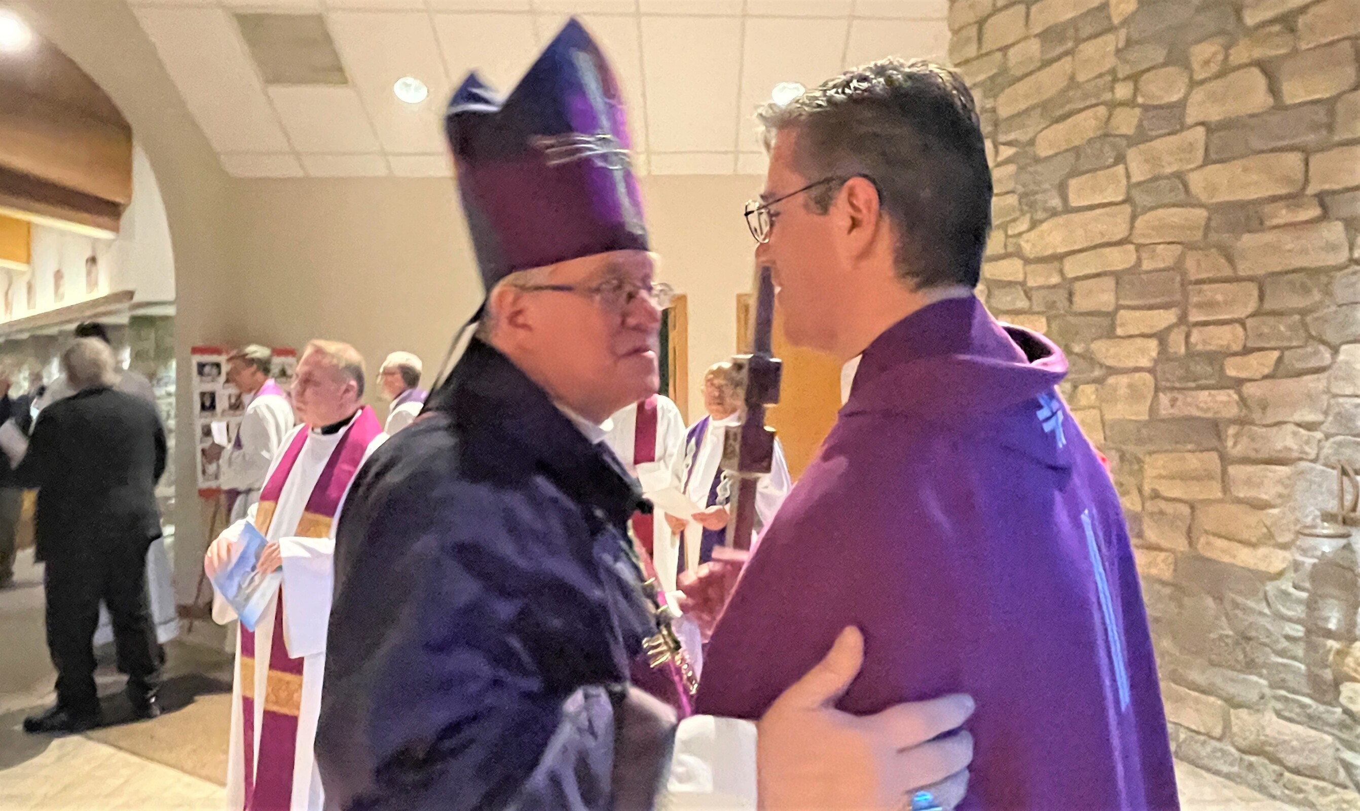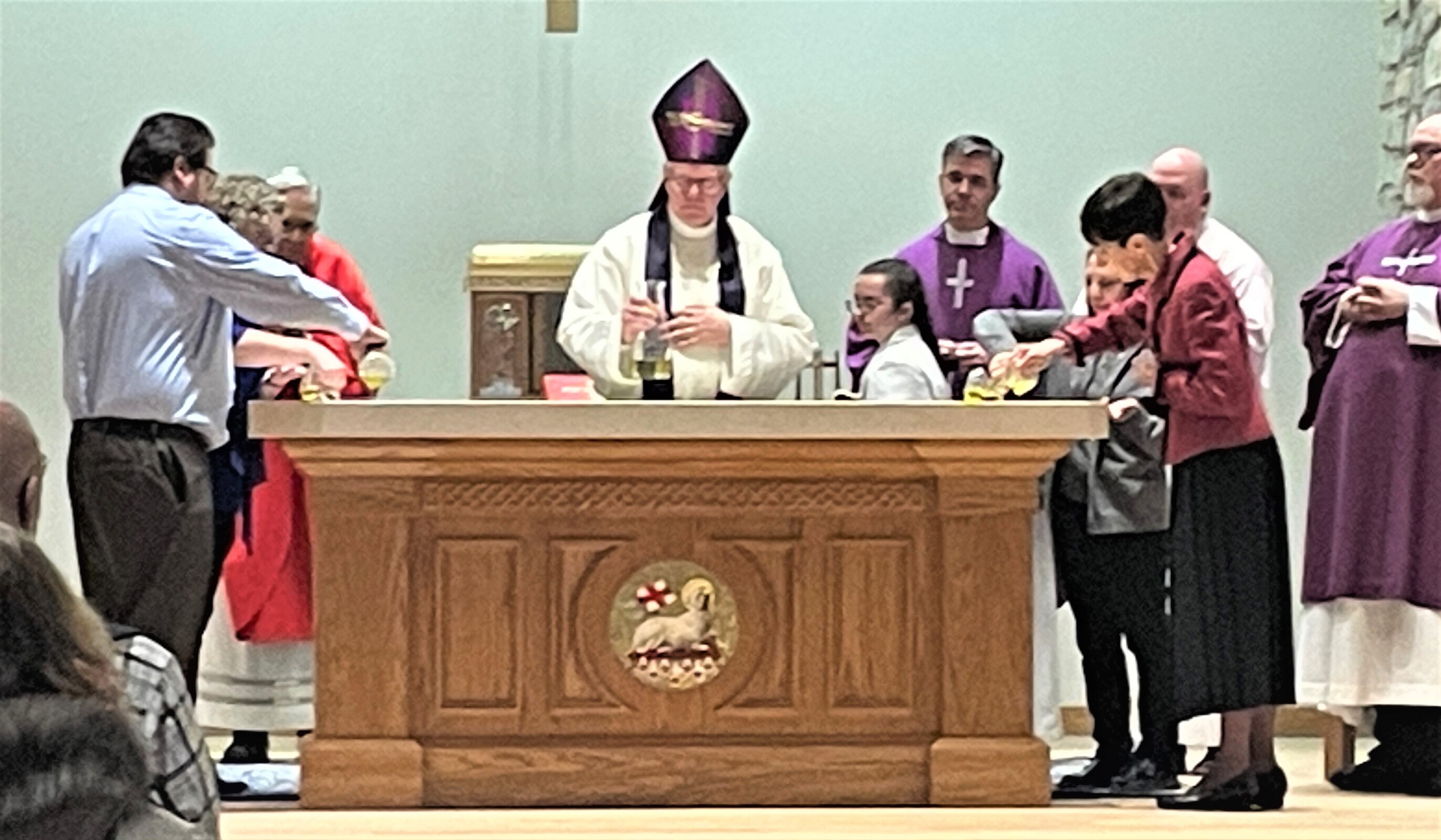 As the altar dedication proceeded, Father Mark Hollis presented the bishop with three saints’ relics to be inserted in the altar. Father Hollis began his priestly ministry 51 years ago at St. Brendan. Relics of Saints Thomas Beckett, Bernadette of Soubirous and John Vianney were inserted in the altar by Bishop Woost. Other relics were placed in the altar previously. The bishop explained that Father Hollis wore red vestments because he was carrying the relics of a martyr. The bishop, concelebrants and deacons were vested in the traditional Lenten purple.