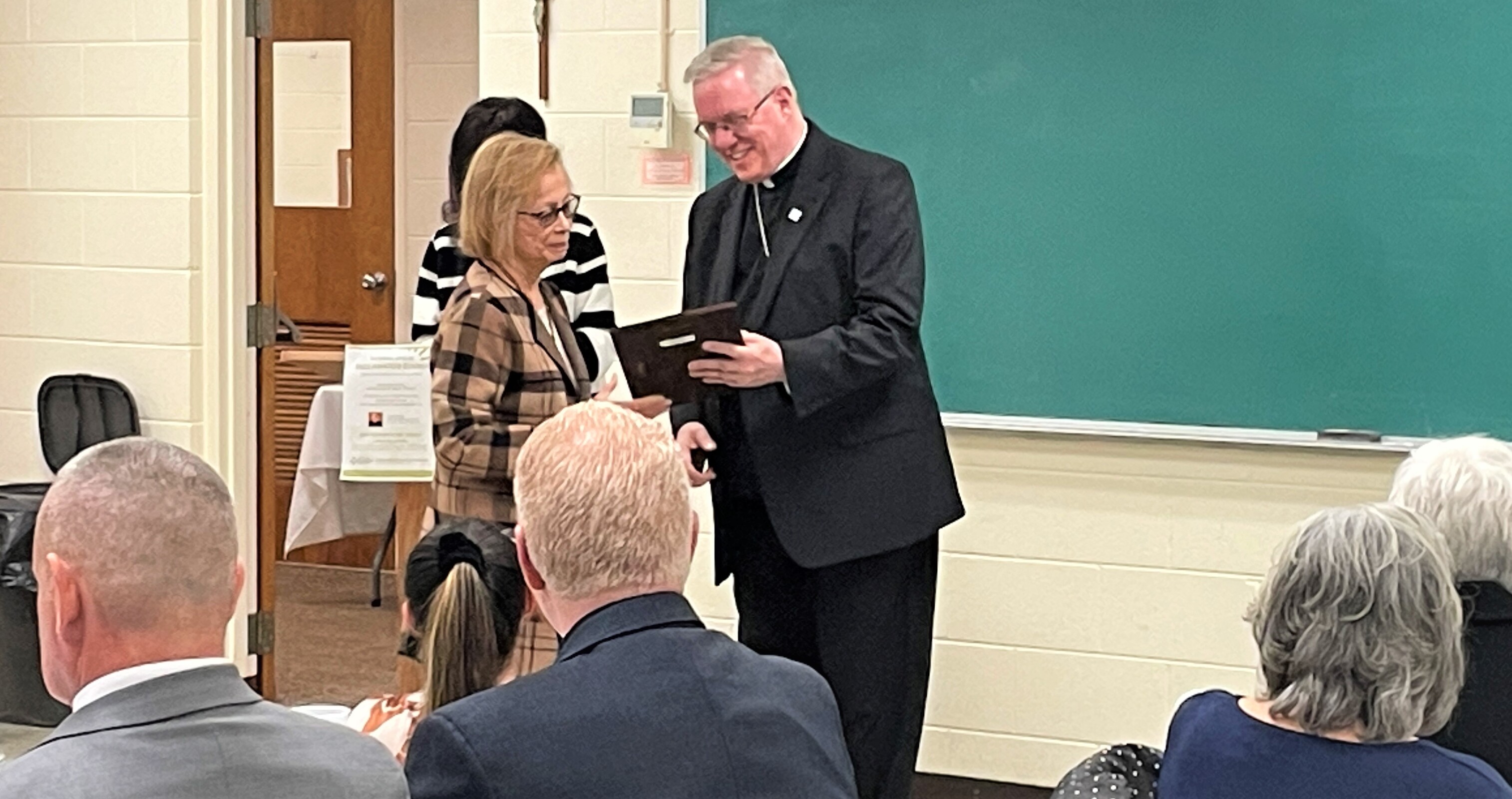 Sharon Kleppel, Lorain Catholic Commission board secretary, presented the Gert Wirscham Faithful Servant Award to the Sacred Heart Peace and Justice Committee. Wirscham, who died in 2015, was a longtime member of St. Mary Parish in Elyria and was devoted to social action and justice causes. She was a founding member and served many years on the Catholic Commission of Lorain County.