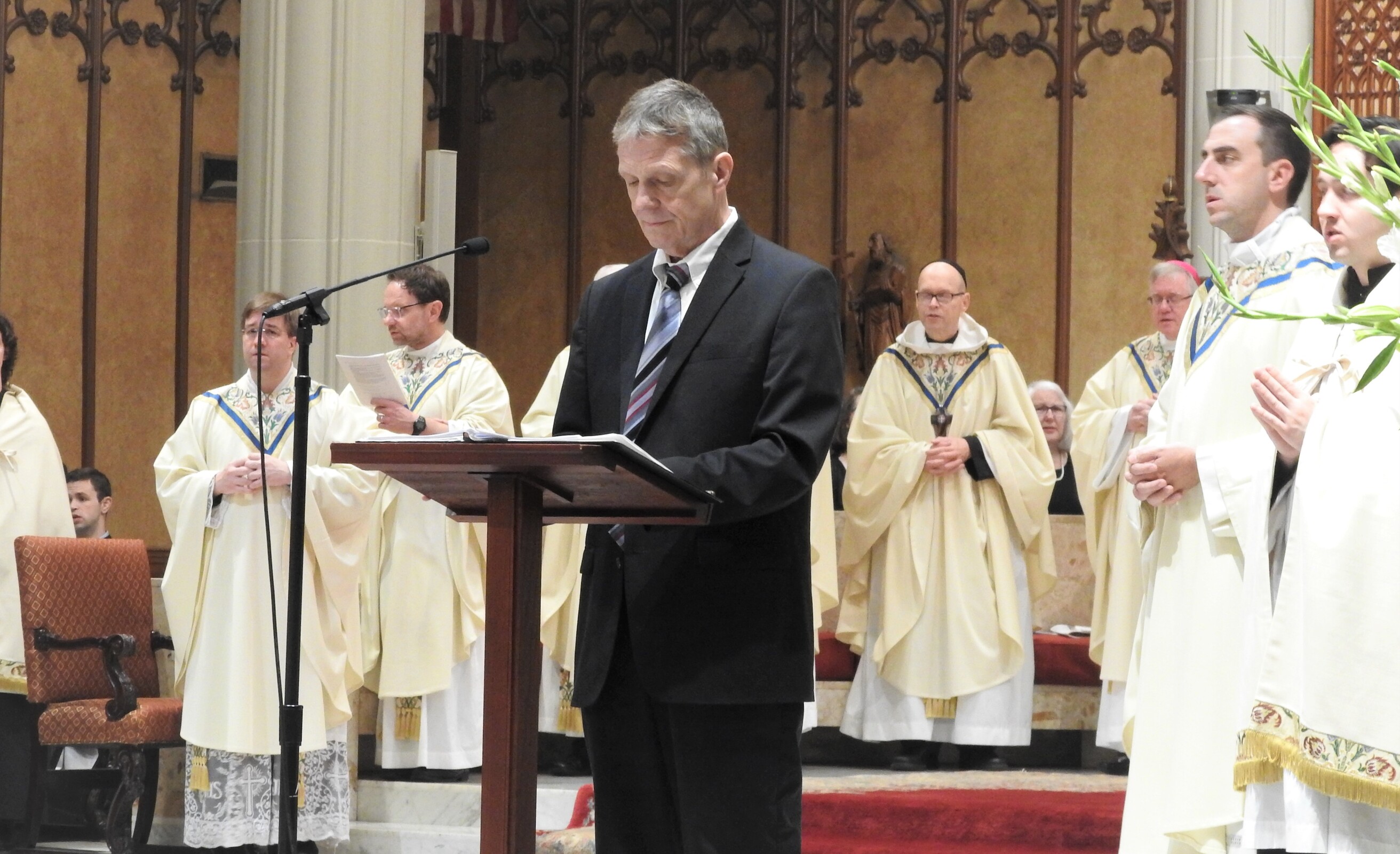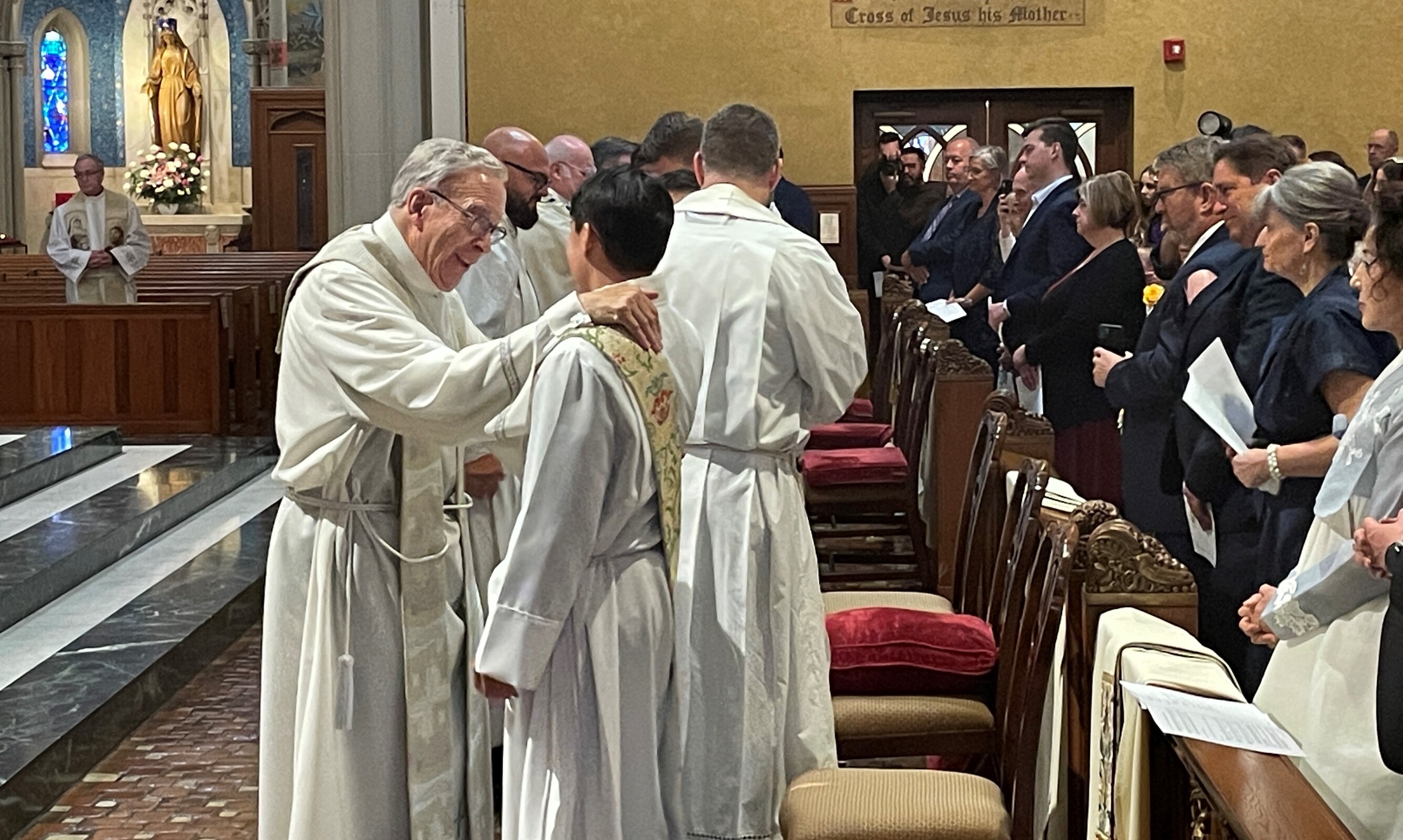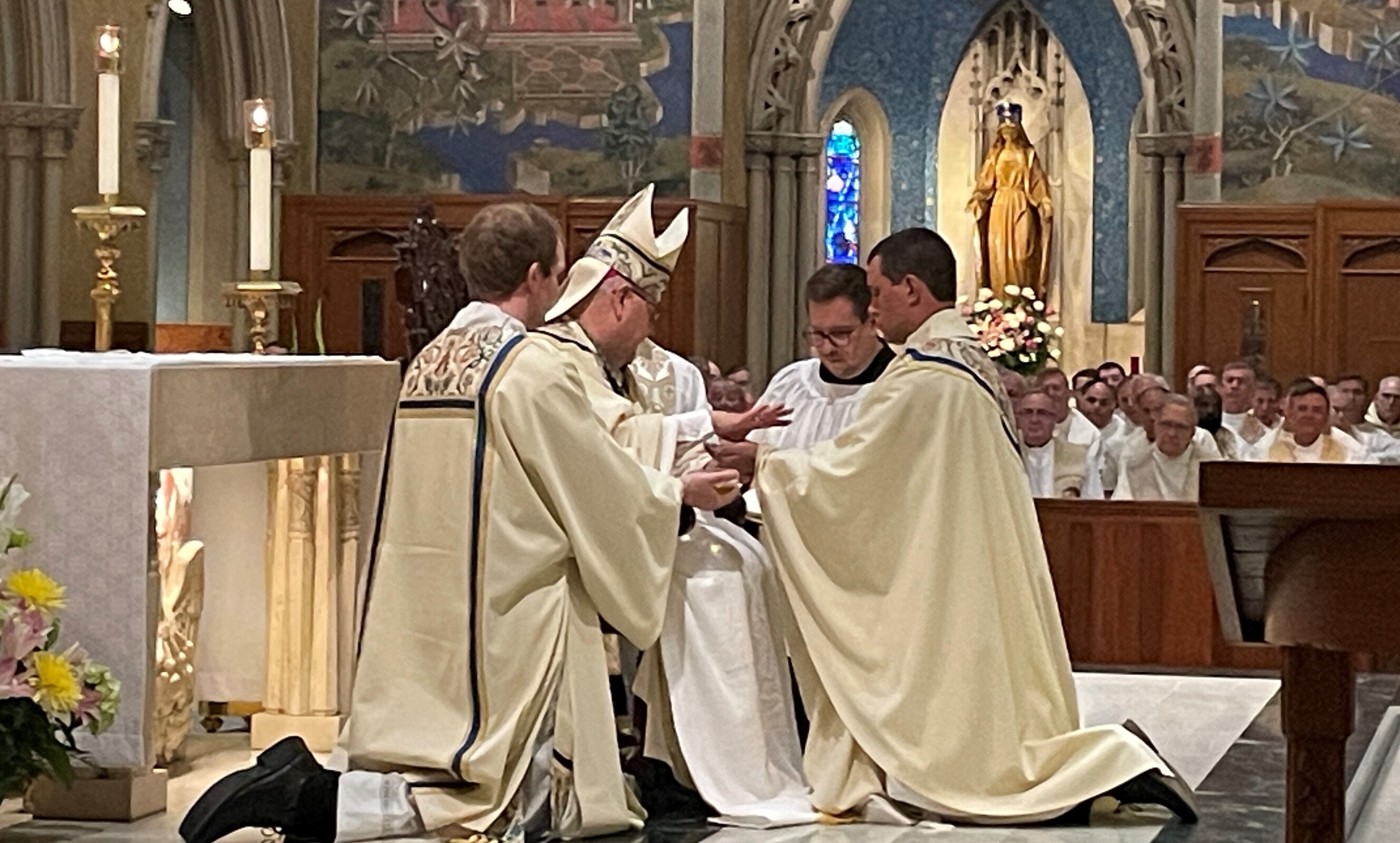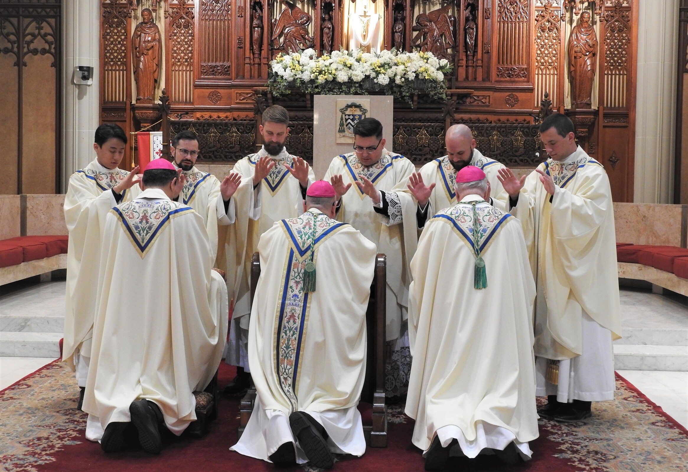The rite of ordination included election of the candidates, promise of the elect, the litany of supplication – during which the six men lay on the cathedral floor – laying on of hands, prayer of ordination, investiture with stole and chasuble, anointing of hands with sacred chrism and the fraternal kiss during which other priests at the Mass embrace each of the newly ordained.