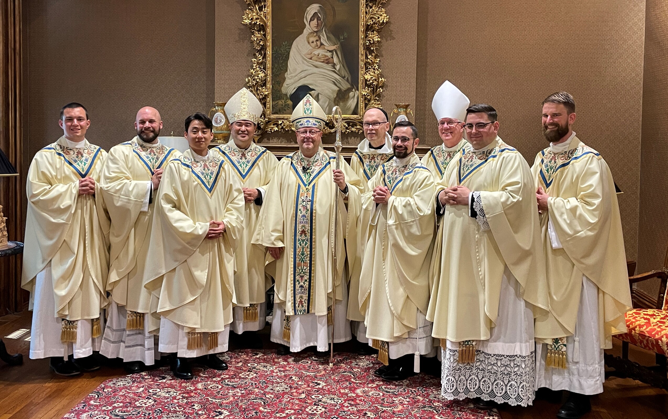 The bishop reminded the newly ordained that they were chosen by Christ to love him and his Church as priests. But he also cautioned them that like new fathers, there is much to learn. He encouraged them to seek help from experienced pastors, brother priests, deacons, staff, knowledgeable laypersons and women. “Of course, the best mother to listen to is Mary, who is the mother of priests,” he said, noting they should seek her advice and intercessory help, especially under her title of Mary, undoer of knots. “Try not to make too many knots of your own for her to untie. She’ll appreciate it,” he added.