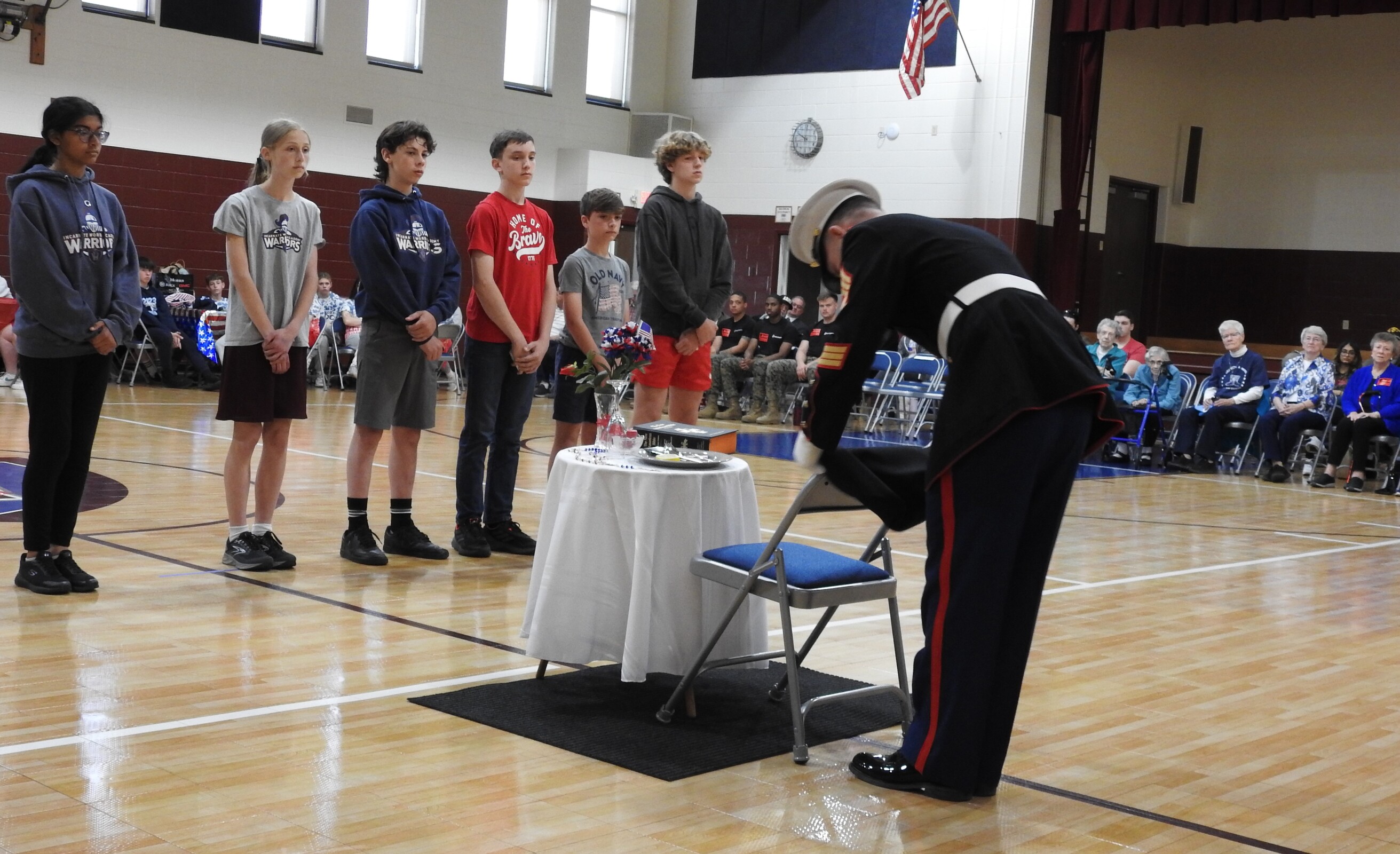 The second ceremony was the POW/MIA table – an empty table that is set in honor of the missing, prisoners of war and those missing in action. The small table is set with a series of symbolic items such as a rose, lemon slice, Bible, inverted glass and an empty chair on which a POW/MIA covering was placed.