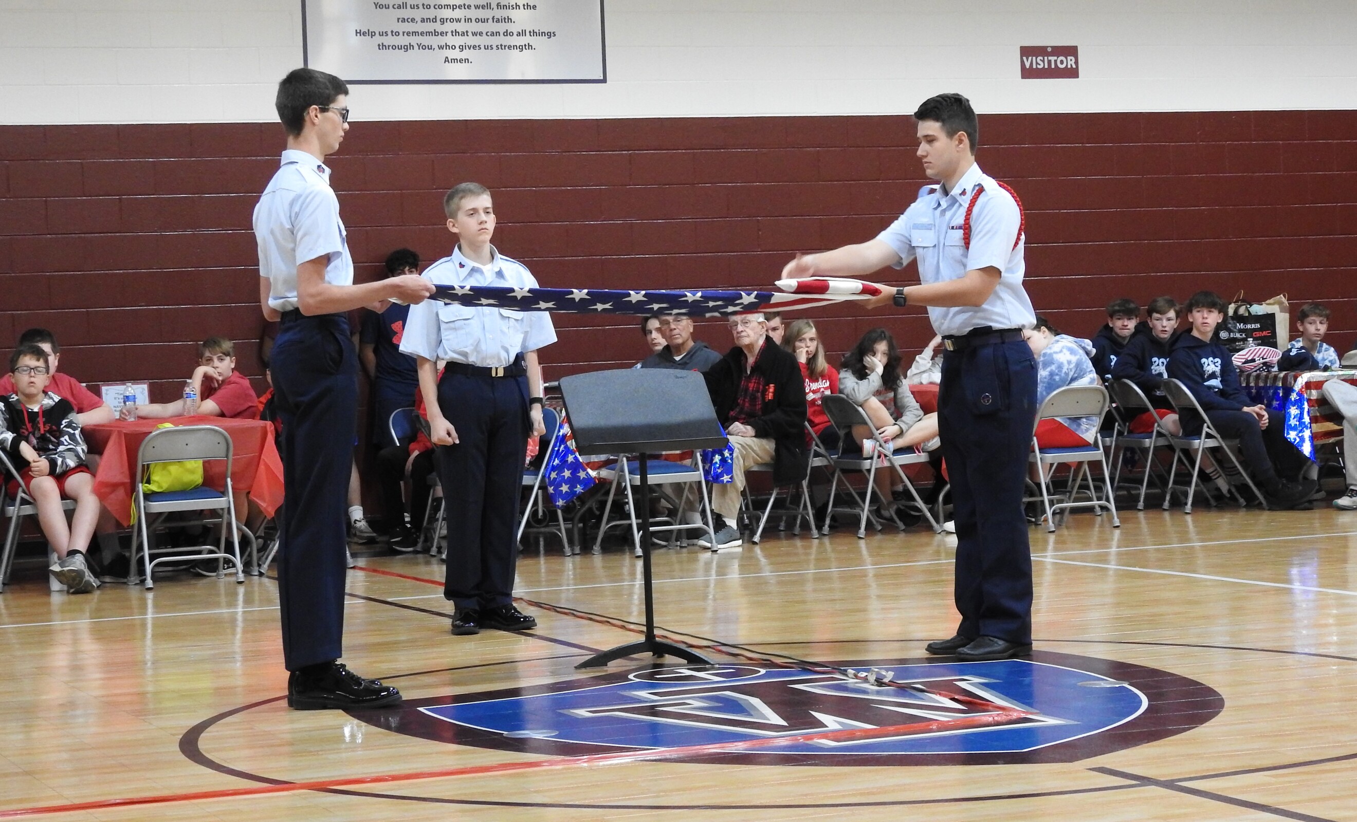 Student members of the Civil Air Patrol explained the 13-fold flag ceremony which takes place at military funerals. Three members of the group demonstrated the ceremony while a fourth explained each step. When finished, the flag resembles a tri-corner hat, which reminds us of those who first fought for our freedoms.