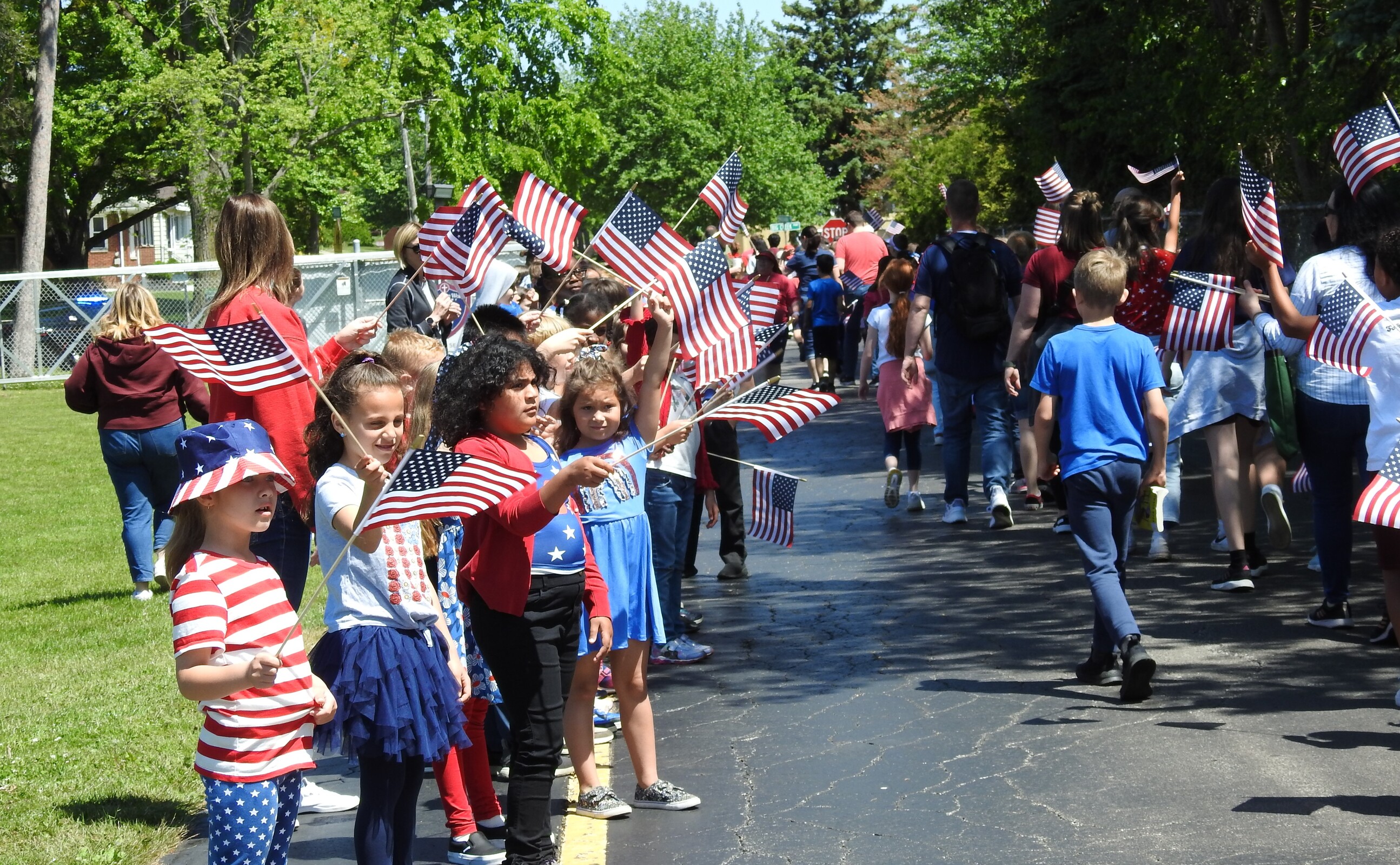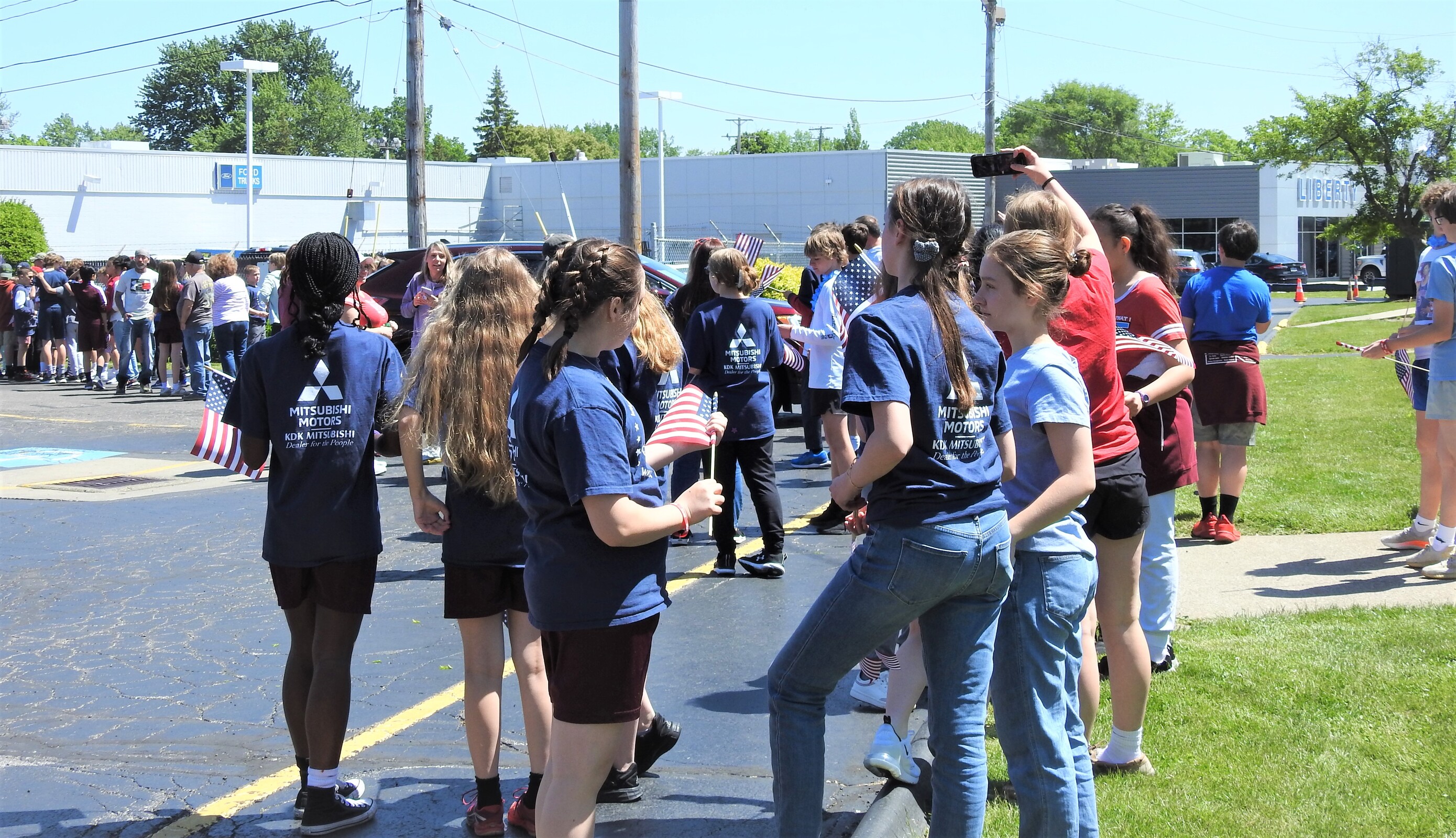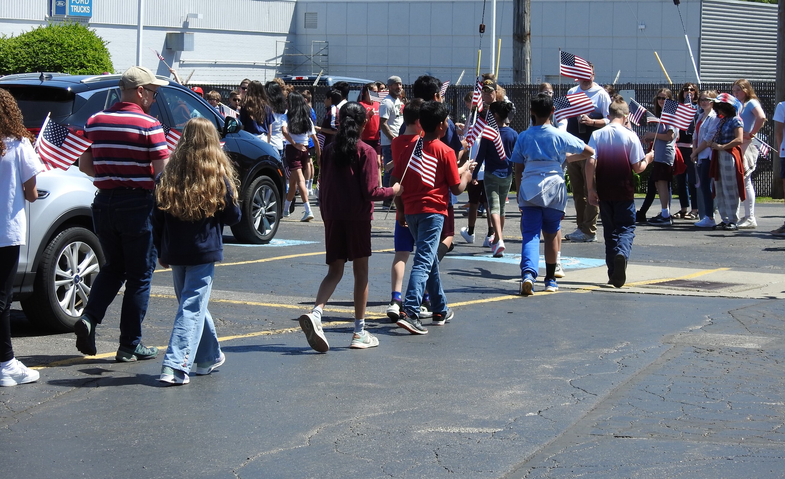 After lunch, they gathered in the parking lot and began a 5-mile walk through Parma Heights. The younger IWA students gathered along the driveway holding small American flags and cheered on the walkers as they began their hike along Big Creek Parkway. A Parma Heights police officer accompanied the group.