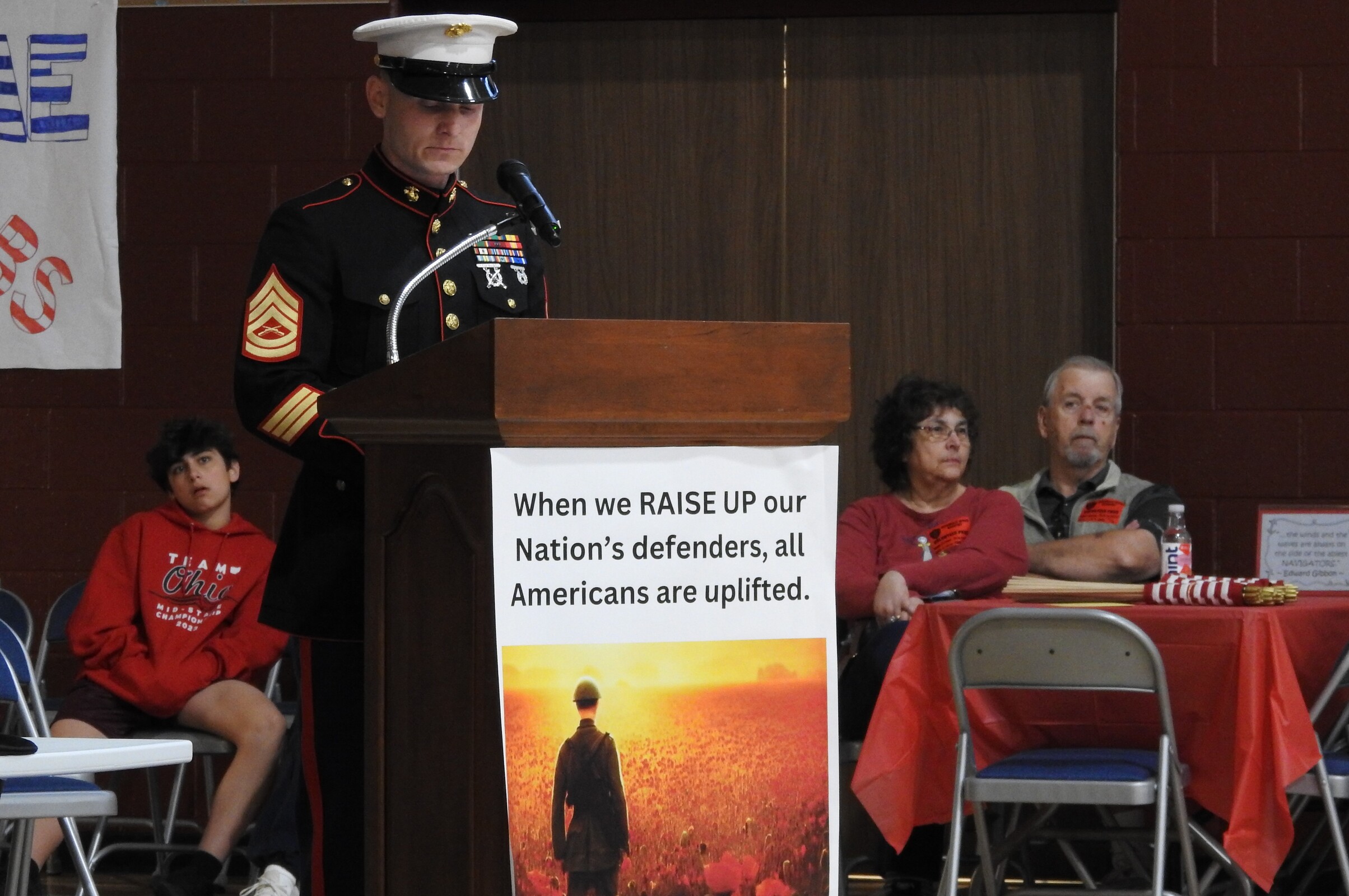 Sgt. Mike LaRoche of the 3rd Battalion, 25th Marine Corps Reserve Unit based in Brook Park, addressed the group and shared the story of a Marine who lost his life during World War II when he jumped on a grenade in order to help prevent his fellow soldiers from serious injury or death. He received the Congressional Medal of Honor.