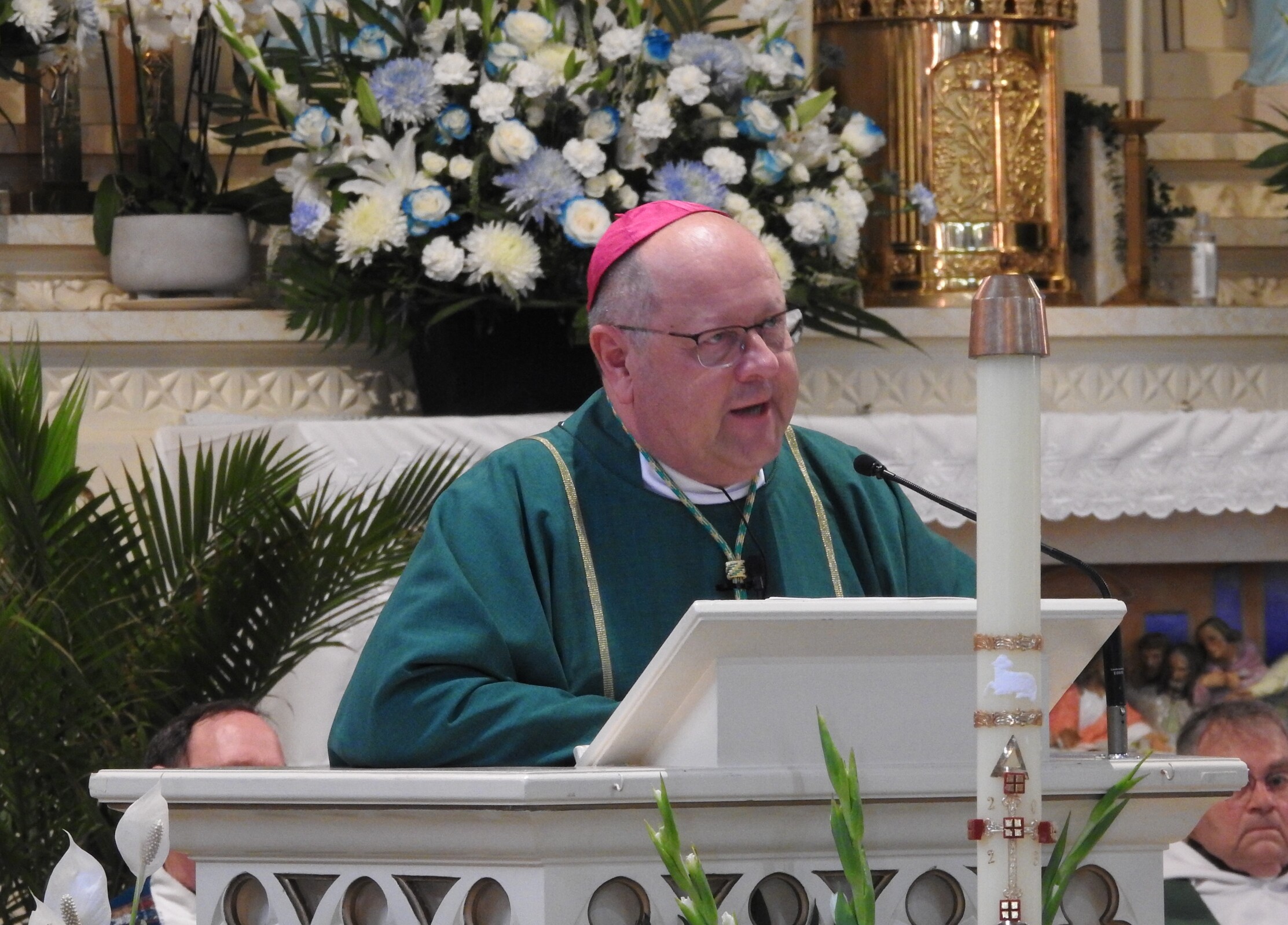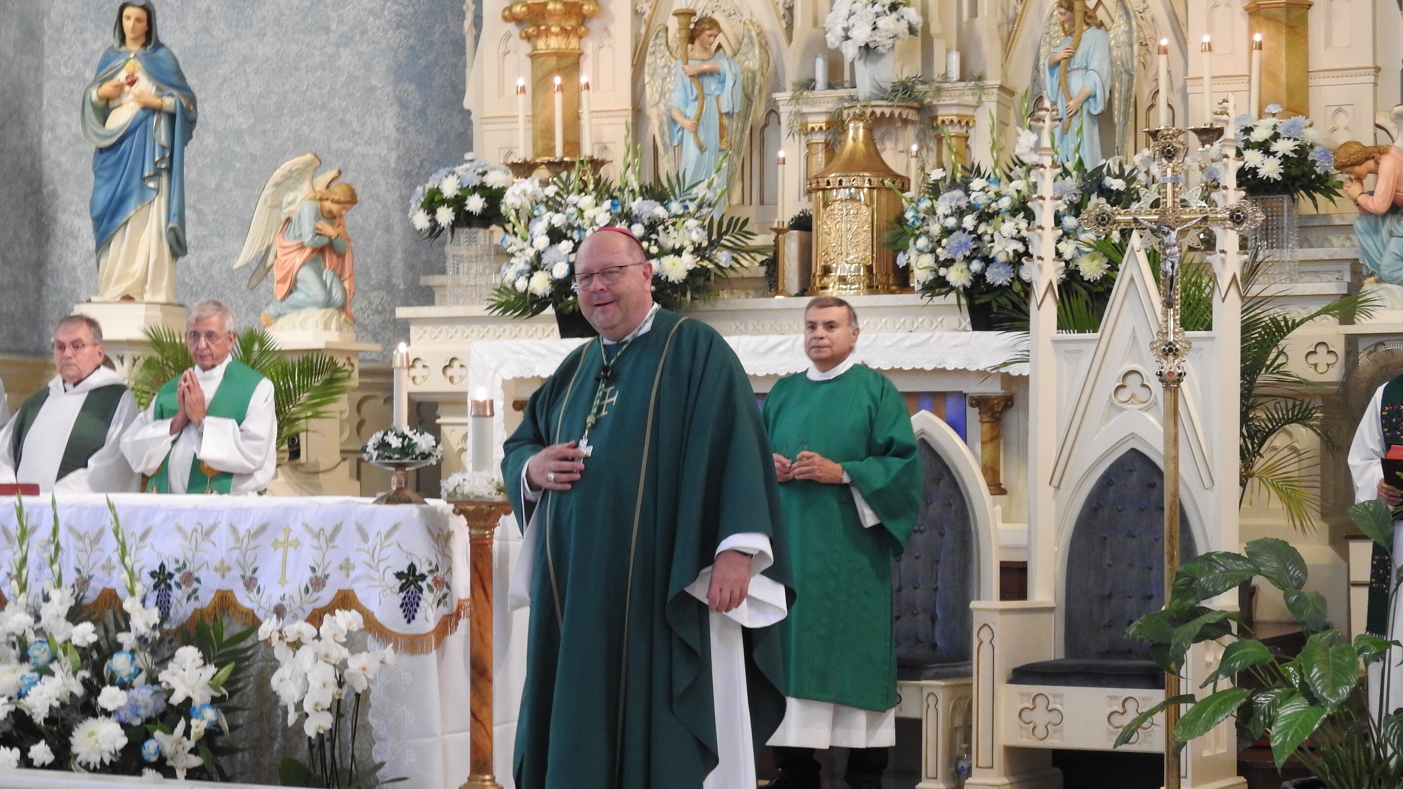 The bishop pointed out the beauty of the church, which is filled with many statues and other pieces of religious art.