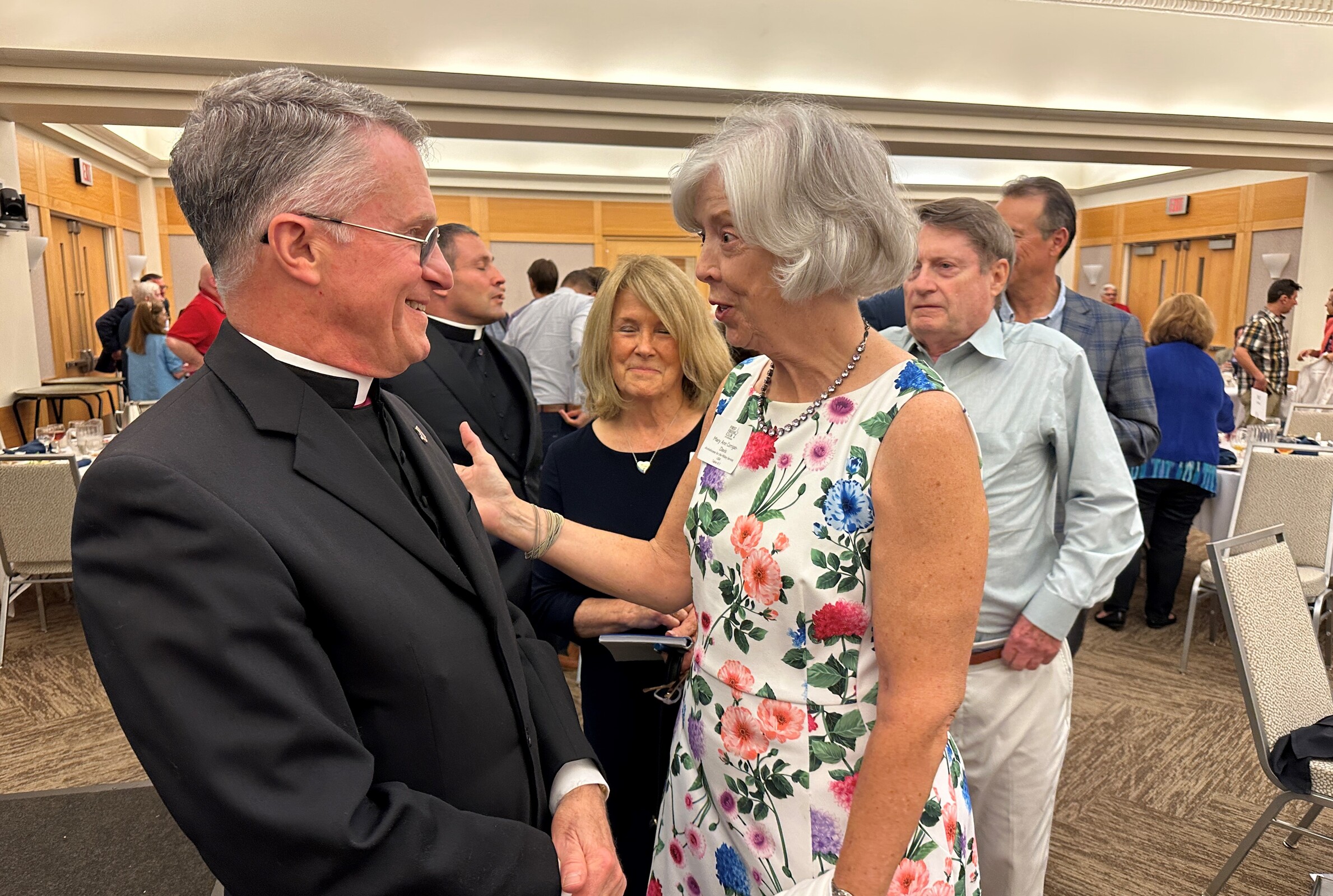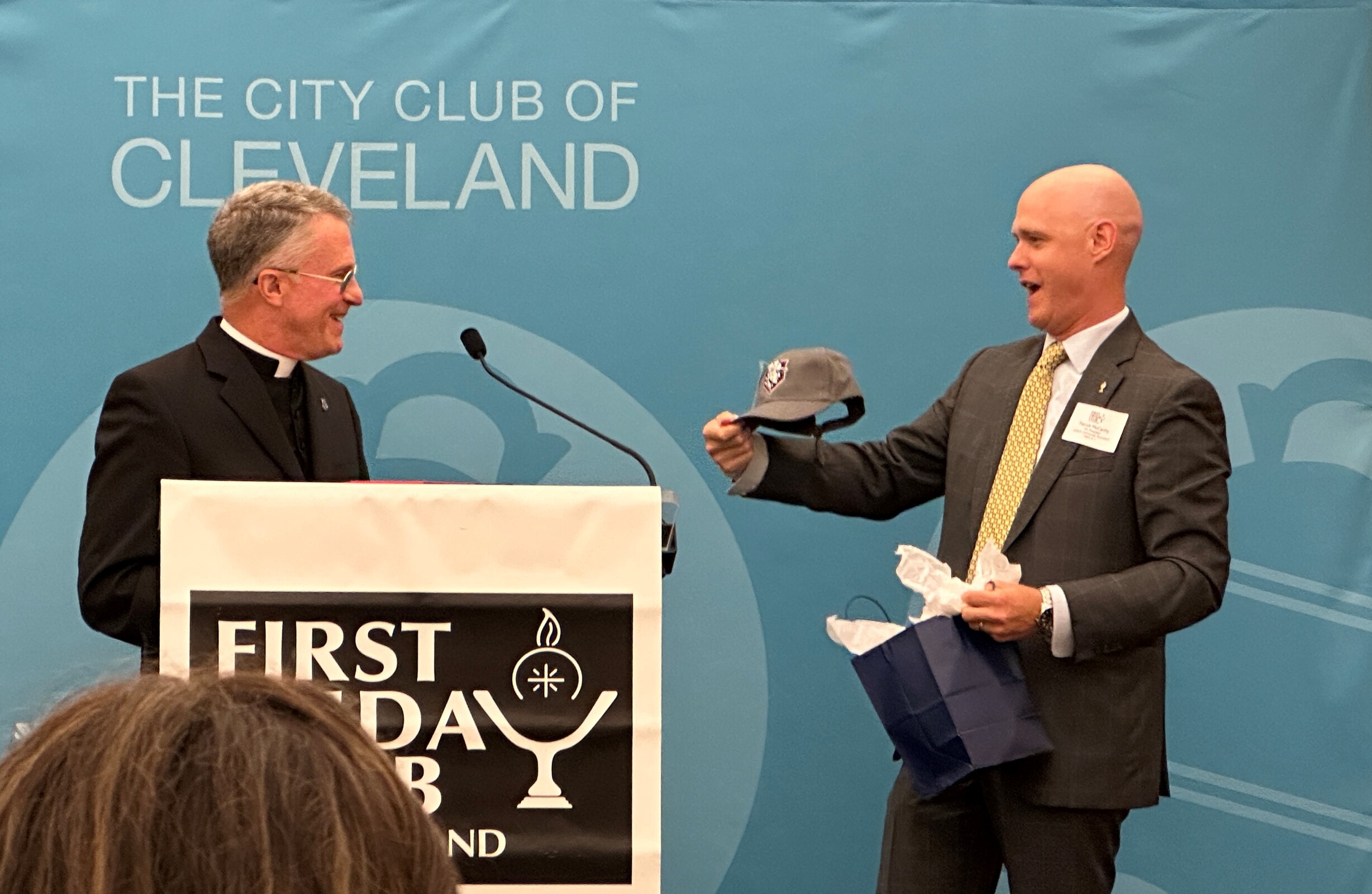 Patrick McCarthy, First Friday Club president, presented the archbishop with a reminder of home – a Cleveland Guardians baseball cap and a water bottle donated by Catholic Charities, Diocese of Cleveland.