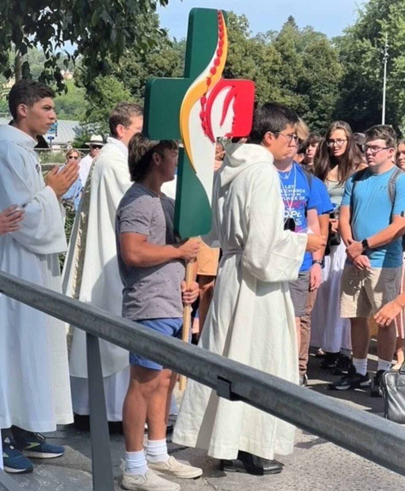 Liam Hatgas, a St. Charles parishioner, carried the WYD cross in a procession at an international Mass at the Lourdes grotto. Celebrant for the liturgy was Bishop Evelio Menjivar-Ayala, auxiliary bishop for the Archdiocese of Washington, D.C.
