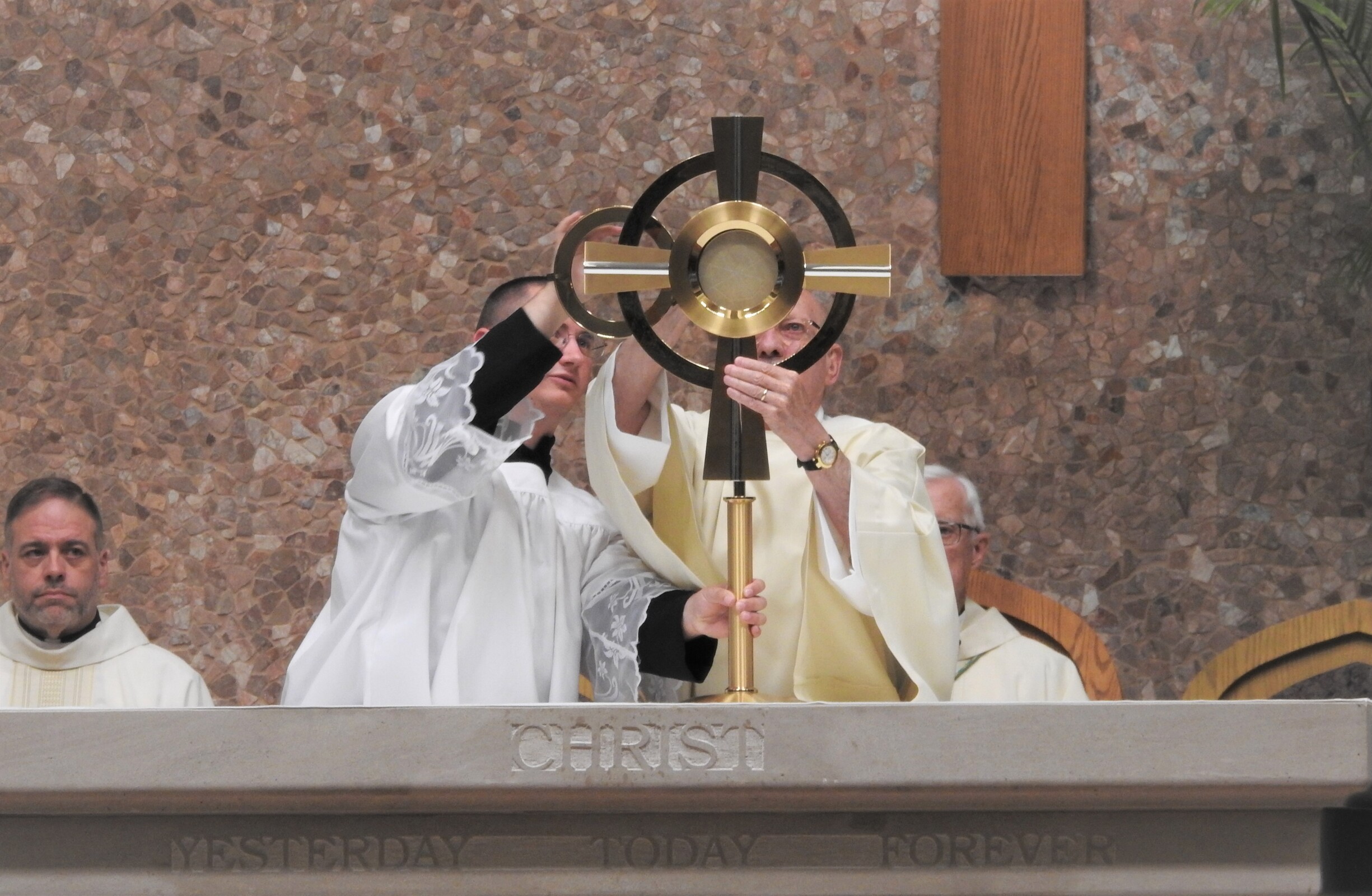Bishop Martin Amos, retired bishop of Davenport, Iowa and a son of the diocese, was the celebrant. Homilist was Father Vince Hawk, pastor of Holy Trinity and St. Mary of the Immaculate Conception parishes in Avon. About a dozen priests from nearby parishes concelebrated the liturgy.