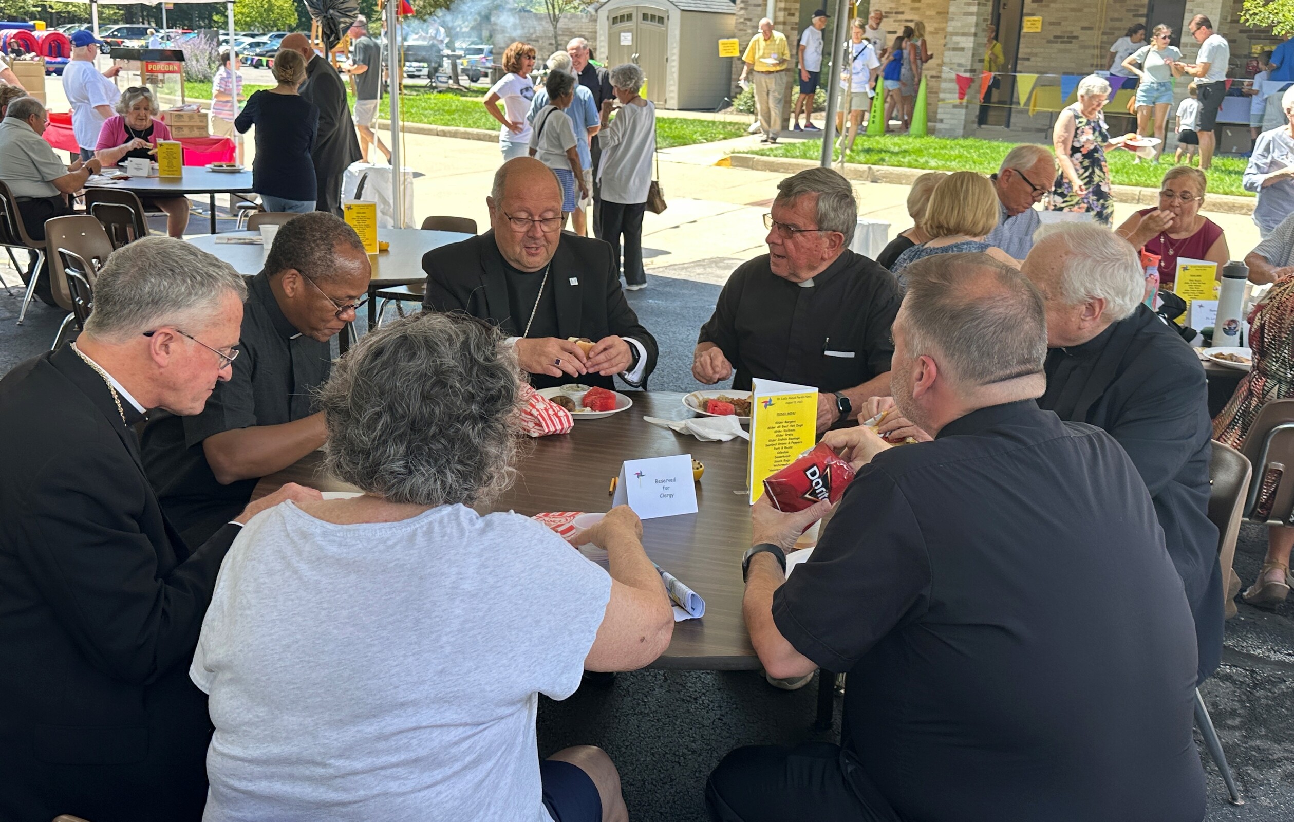 There was plenty to celebrate at St. Ladislas Parish in Westlake on Aug. 13 as Bishop Edward Malesic installed Father Mark Latcovich as the parish’s third pastor. It also marked the 50th anniversary of the parish, which was relocated from Cleveland to Westlake in 1973. Parishioners and guests celebrated both events with a picnic lunch under large tents in the parking lot or in Cullen Hall. The festivities also included music, games and of course, birthday cake.