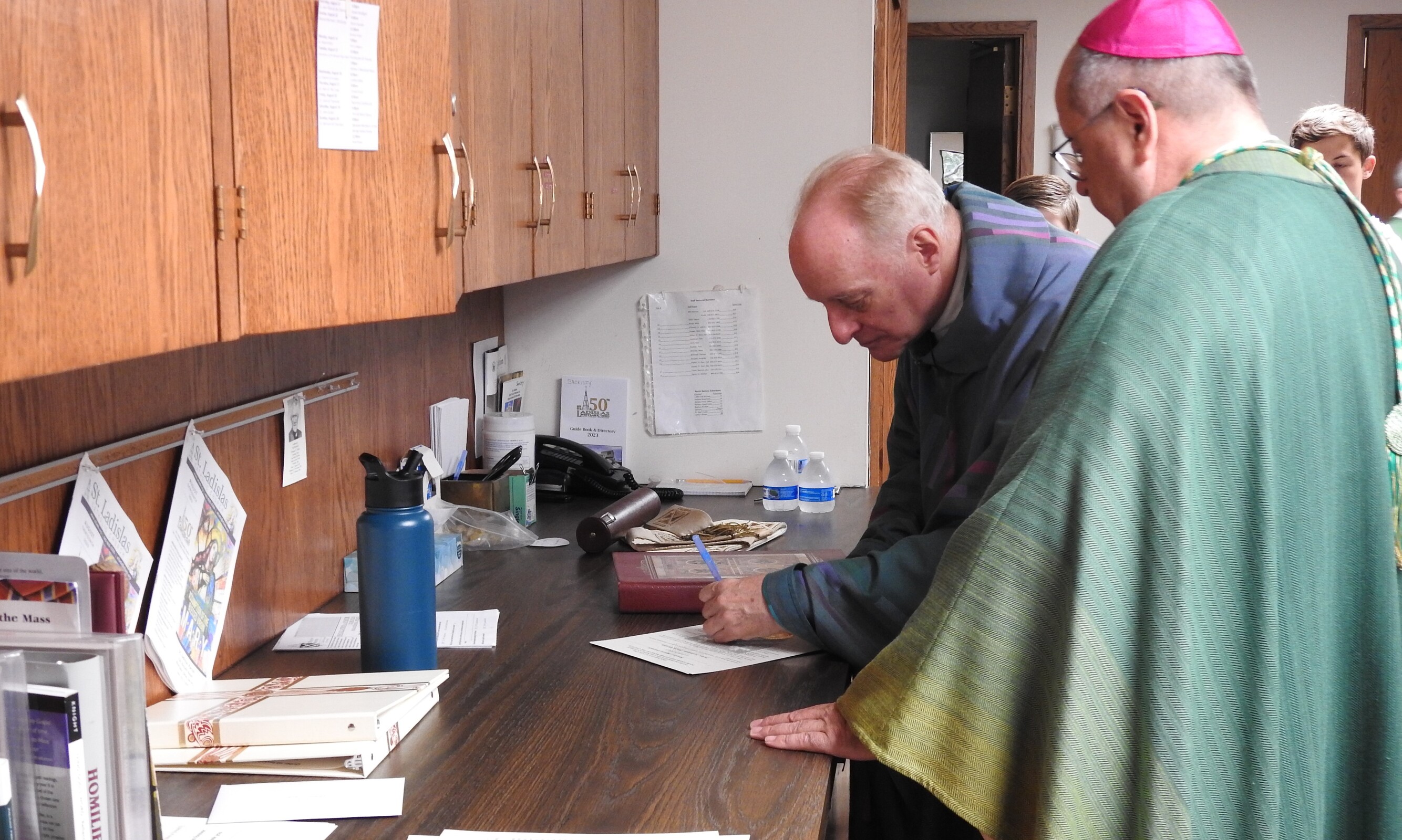 After introducing Father Latcovich as the new pastor, Bishop Malesic asked members of the parish staff, parish council and finance council to stand. Father Latcovich greeted them and promised to seek and follow their counsel and advice in his pastoral work. He signed the paperwork making his new position official prior to Mass.