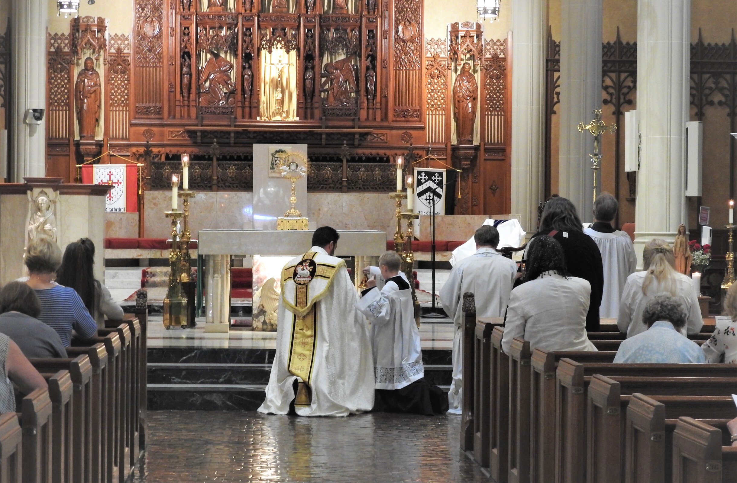 After Mass, the faithful followed Father Estabrook, who was carrying the Blessed Sacrament in a monstrance, Father Petkosek and the servers from the cathedral onto East Ninth Street, Lakeside Avenue, East Sixth Street, Superior Avenue and East Ninth back to the cathedral. Throughout the procession, the group prayed and sang.