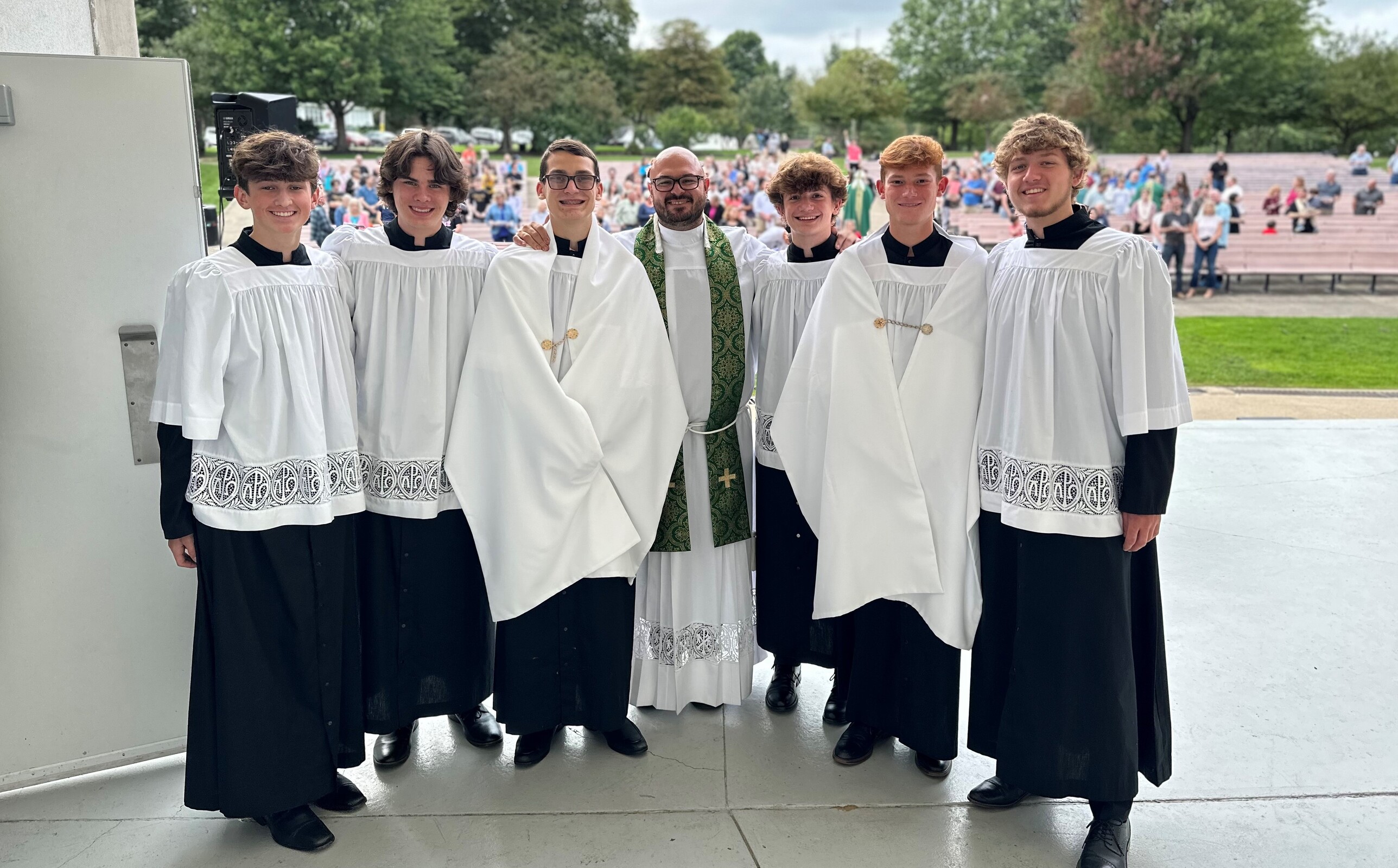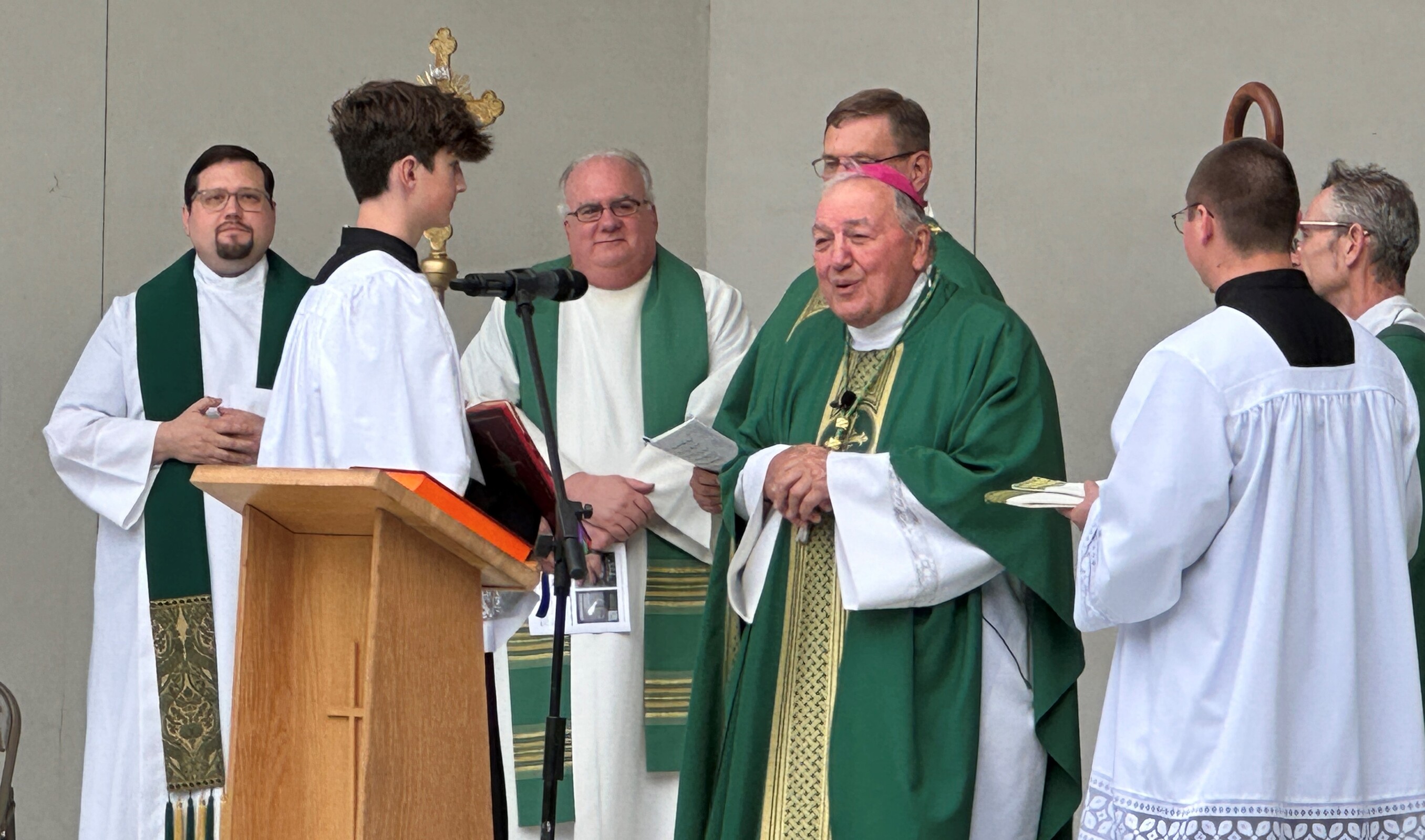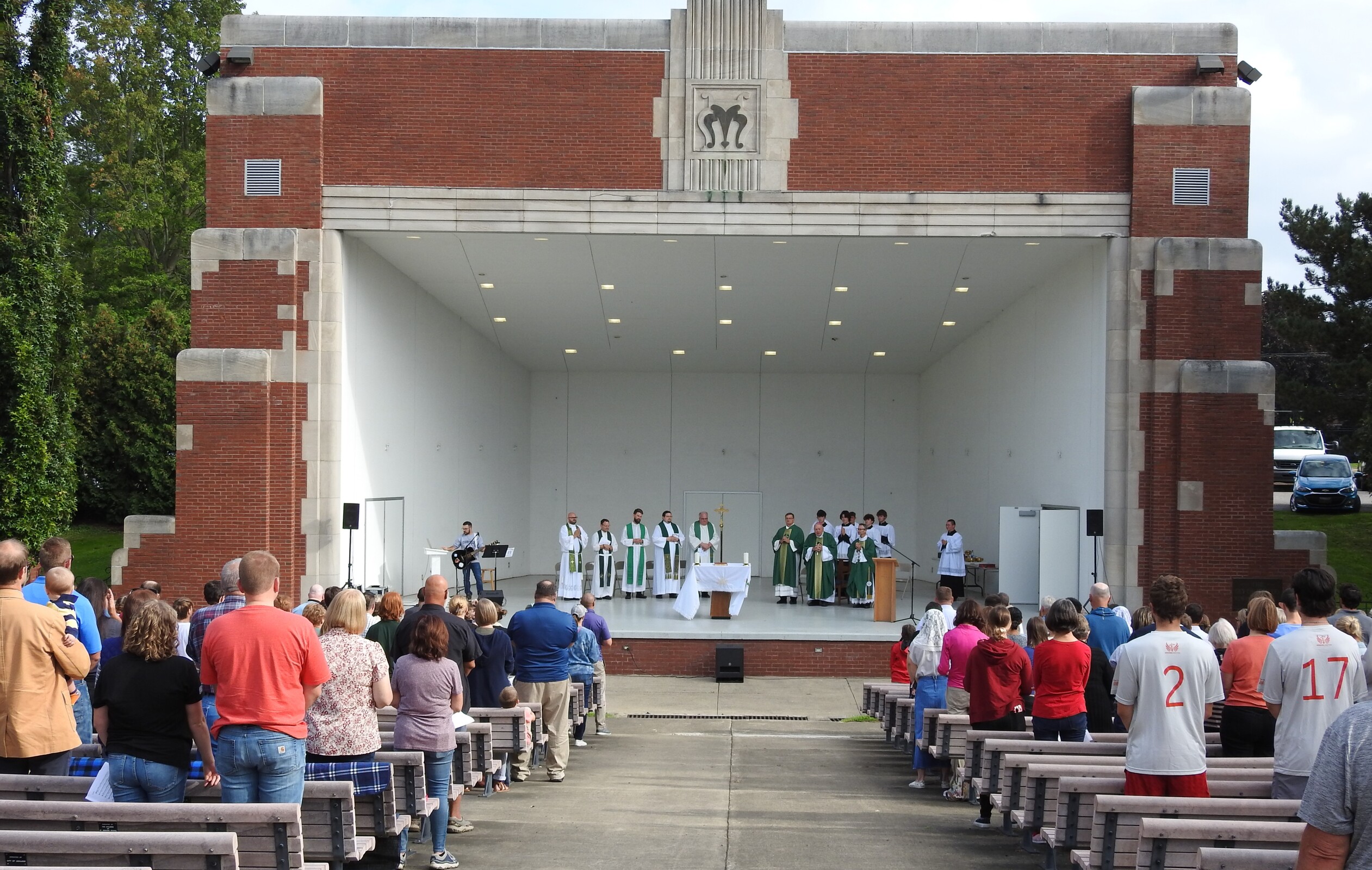 After celebrating their victory, the players and fans joined others around the corner from the baseball field as they gathered for Mass at the Guy Chase Myers Memorial Band Shell. About 250 people, including some from nearby parishes, attended the liturgy. Students from Ashland University’s Newman Ministry served as greeters and distributed worship booklets.