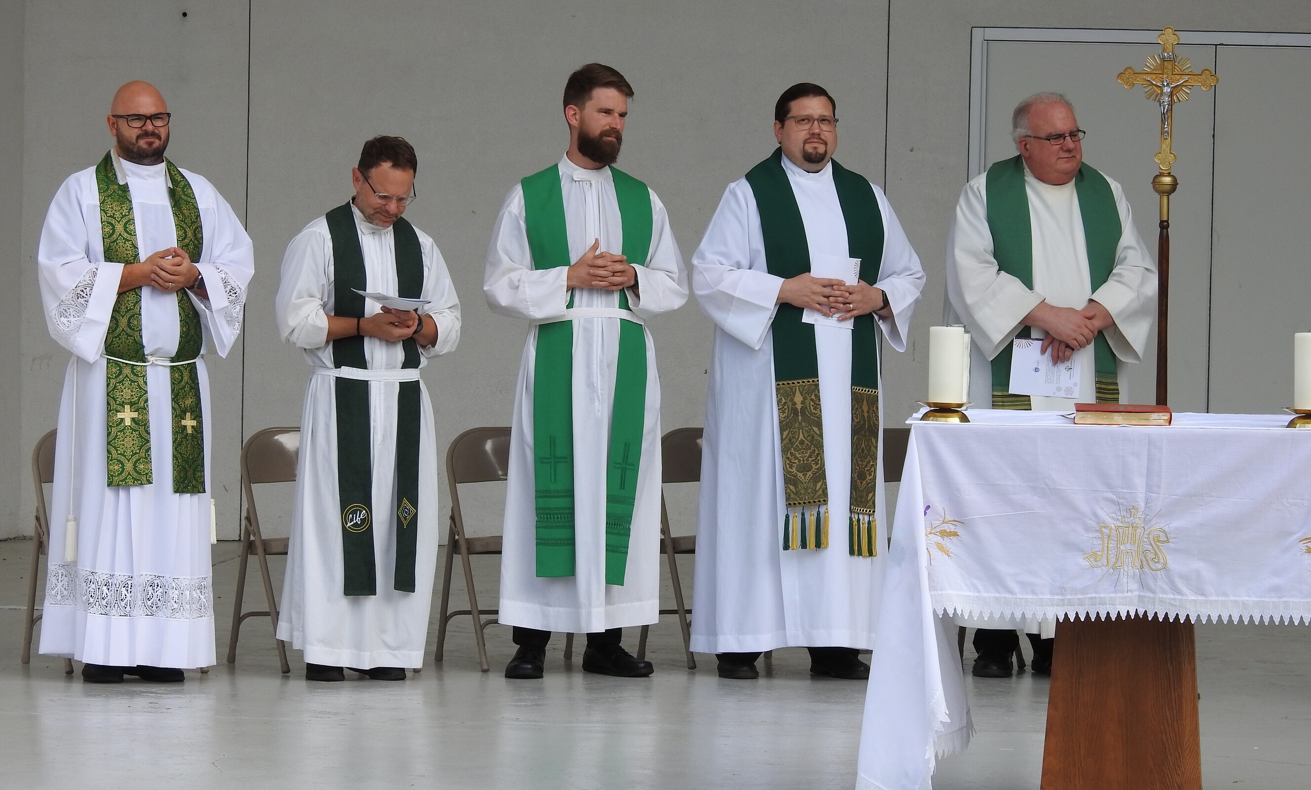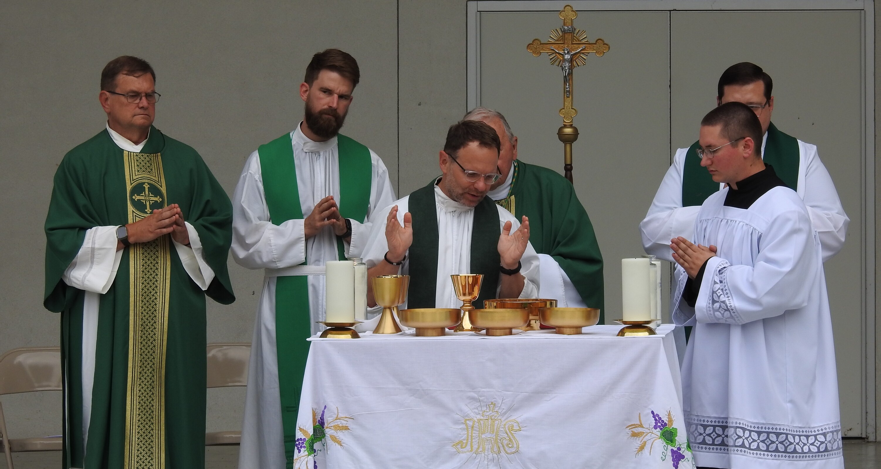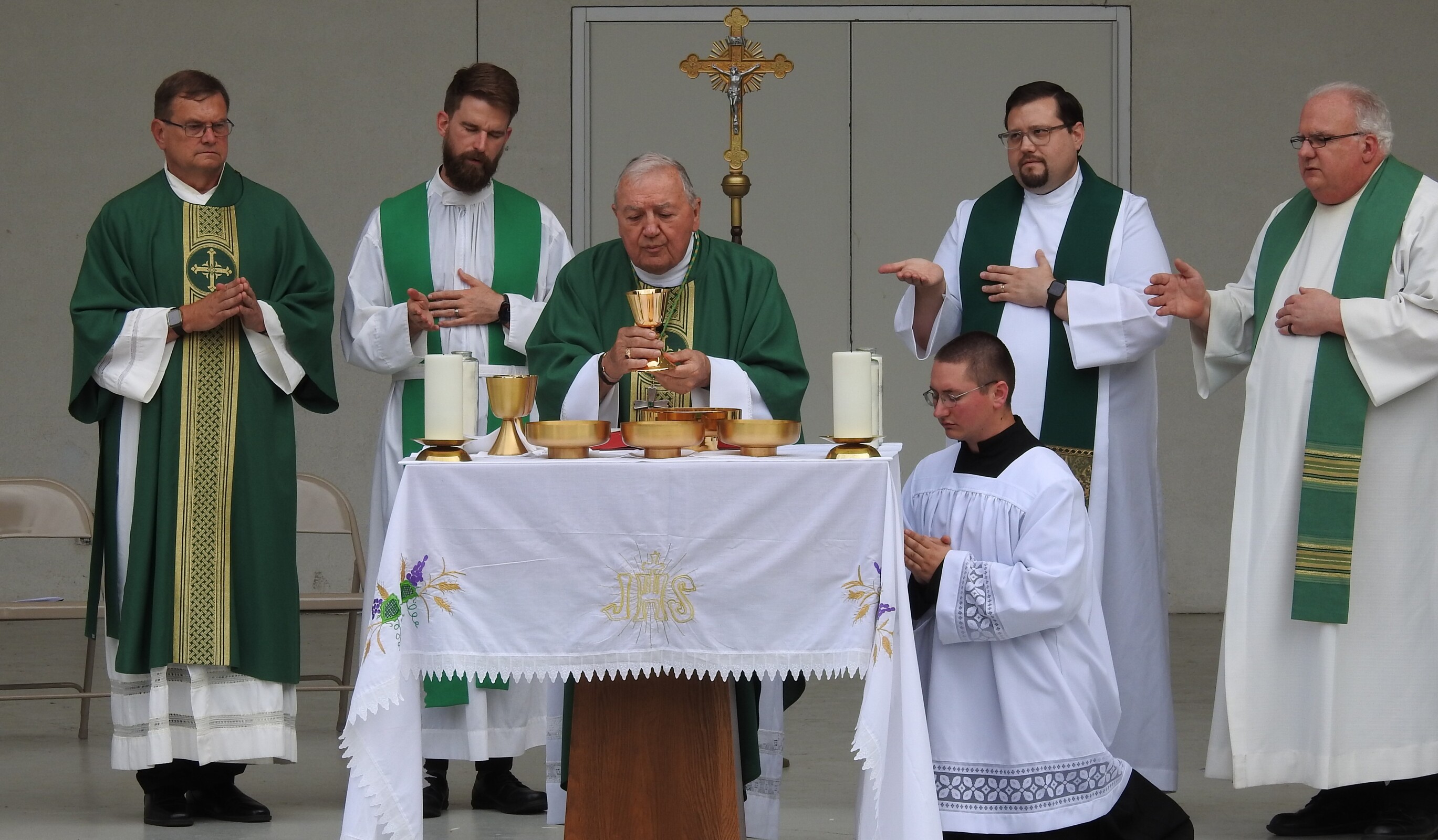 After celebrating their victory, the players and fans joined others around the corner from the baseball field as they gathered for Mass at the Guy Chase Myers Memorial Band Shell. About 250 people, including some from nearby parishes, attended the liturgy. Students from Ashland University’s Newman Ministry served as greeters and distributed worship booklets.