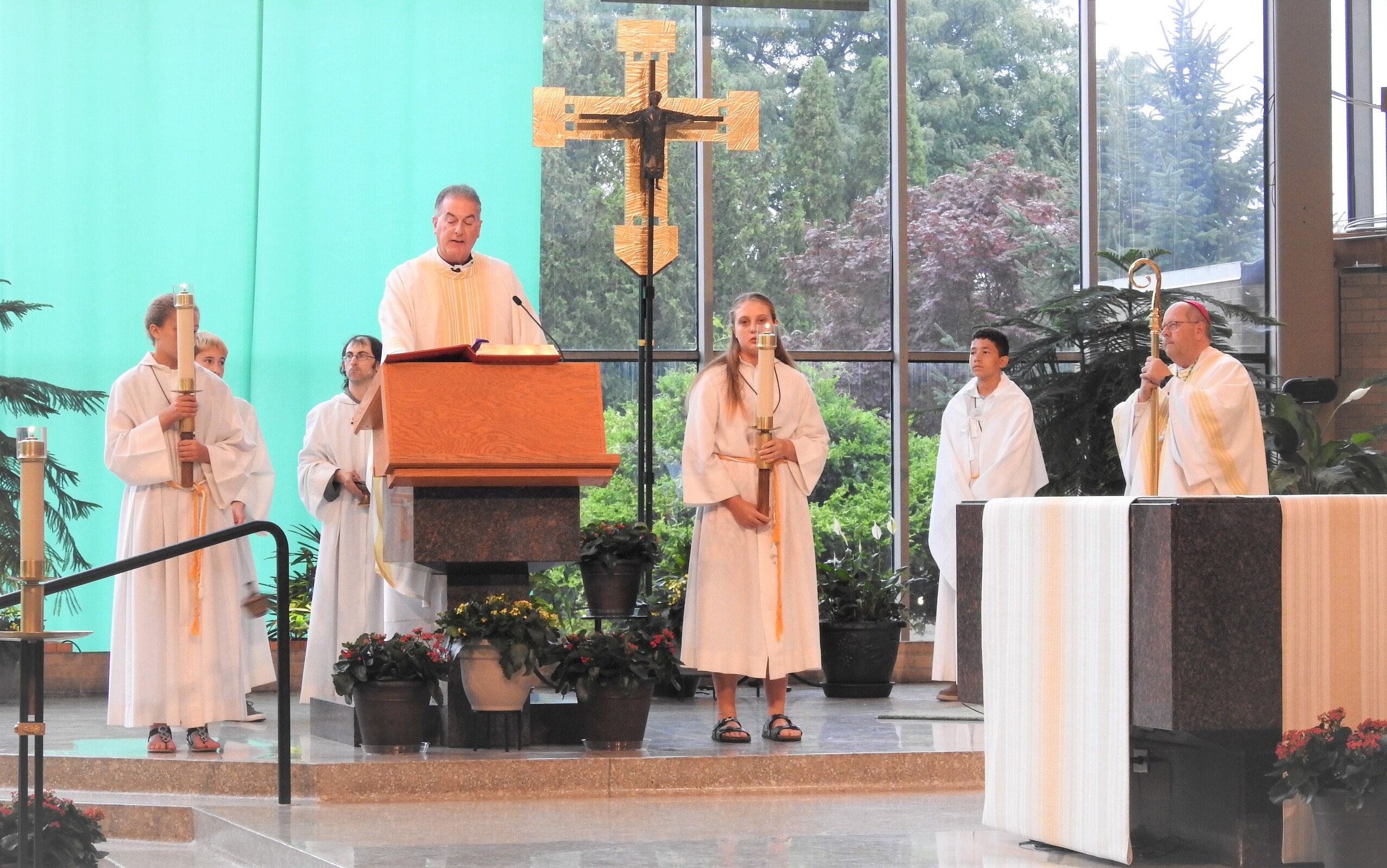 The bishop was joined by concelebrants Father John Thomas Lane, SSS, who is provincial superior, the parish pastor and a son of the parish, and two Blessed Sacrament priests. He offered a brief history of the parish, which was established Sept. 2, 1953 by Archbishop Edward Hoban. The archbishop purchased several acres of what had been farmland, used primarily strawberries and raspberries. He asked the Congregation of the Blessed Sacrament, which had been in the Diocese of Cleveland since 1931 and had a seminary nearby on Euclid Avenue in Cleveland, to administer the parish.