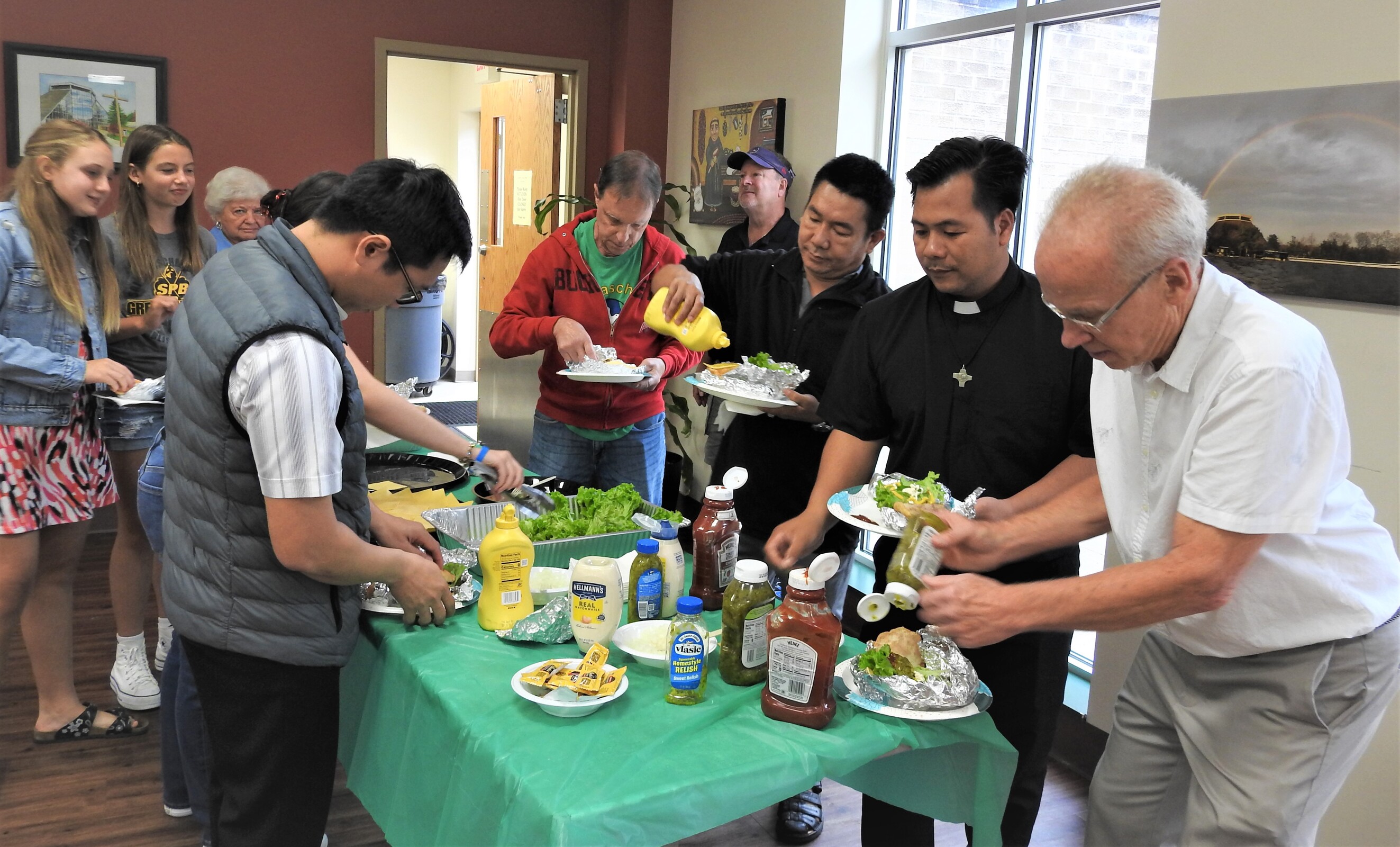 After Mass, the bishop spent some time visiting with parishioners at the parish picnic that was moved indoors by the rainy weather. Members of the Knights of Columbus staffed the grill and kitchen, providing burgers for the hungry crowd.
