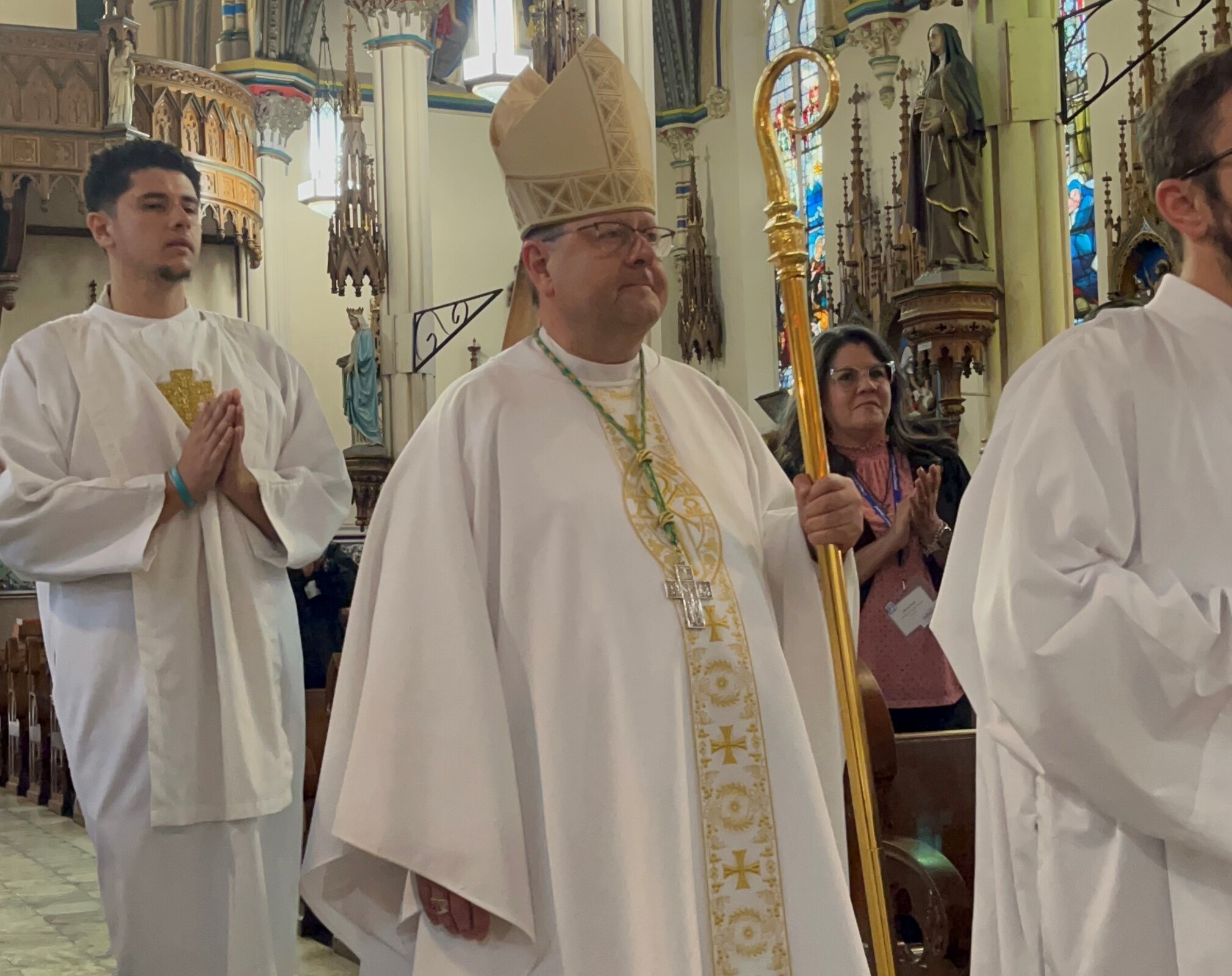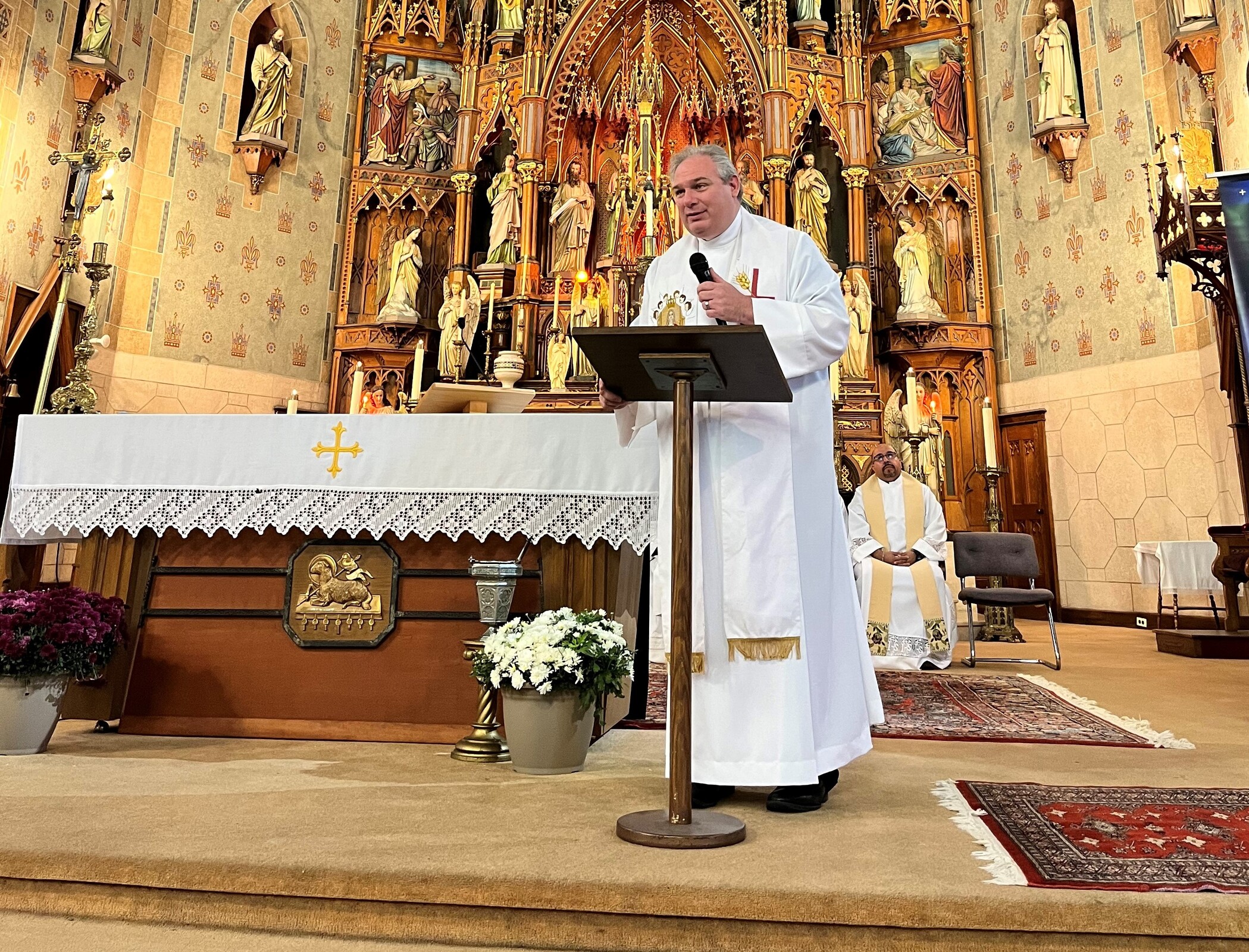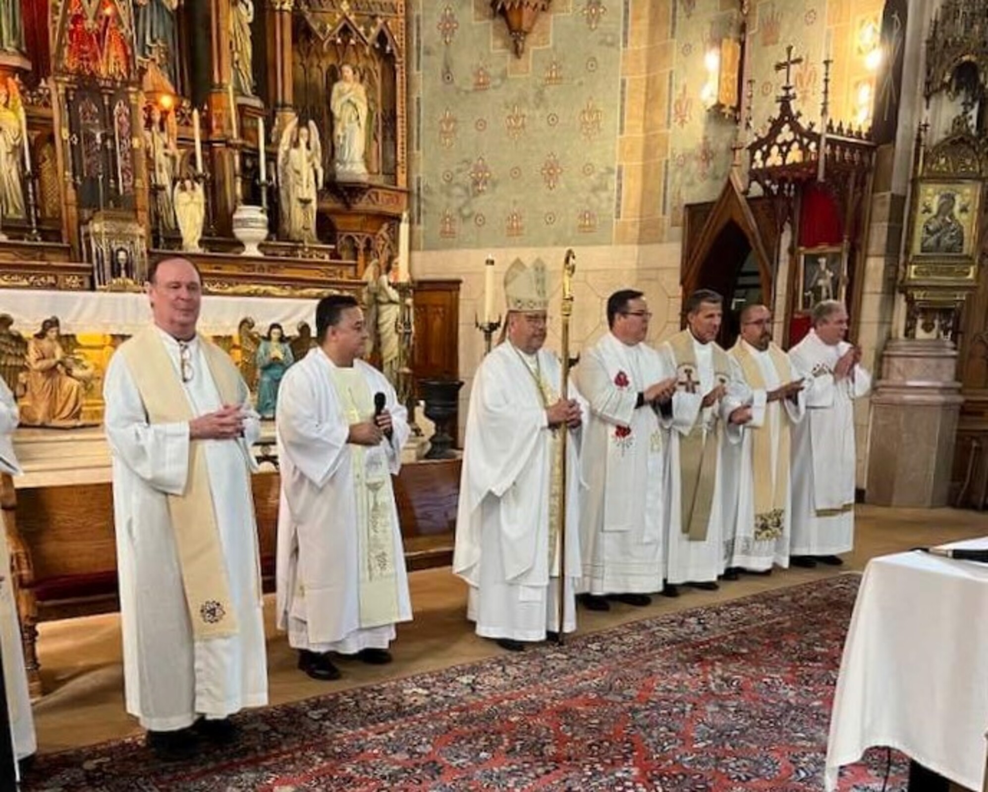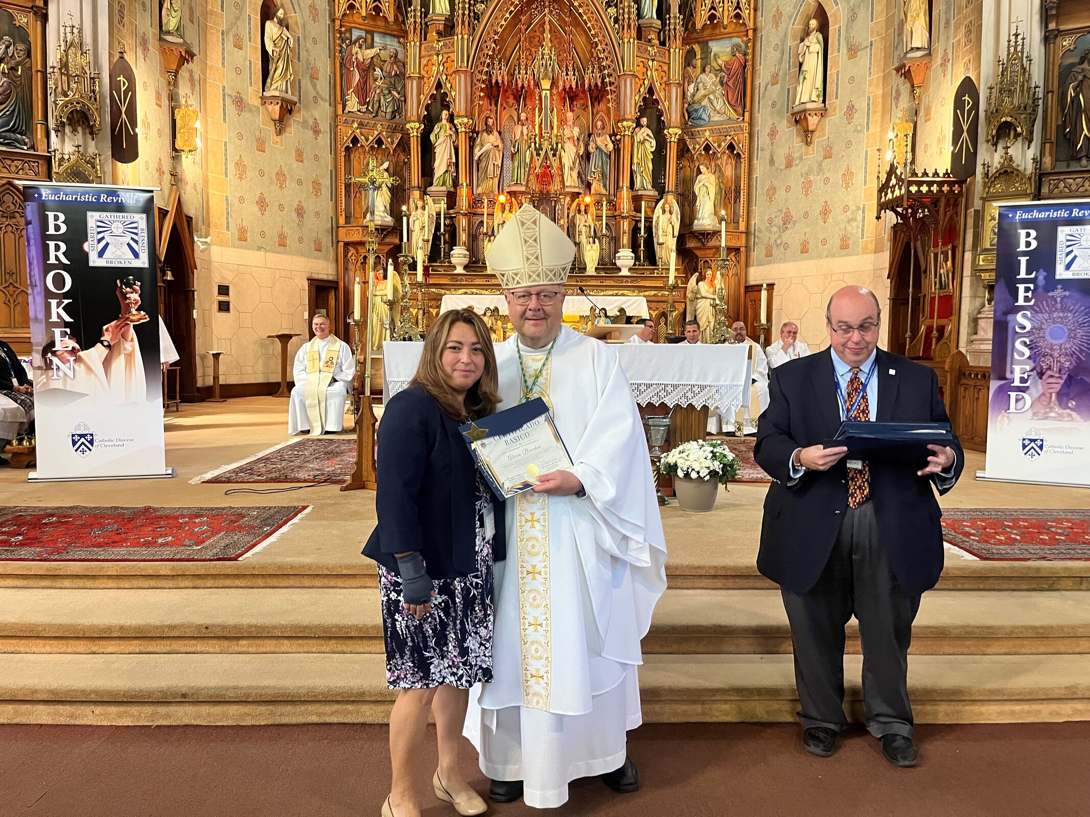 Bishop Edward Malesic was the celebrant and clergy from the seven Hispanic parishes in the eight-county diocese concelebrated, including Father Steve Vellenga, pastor of St. Mary Parish in Painesville; Father Joe Callahan, pastor, Our Lady of Lourdes Parish, Cleveland; Father Mark Riley, pastor, St. Michael the Archangel; Father Bill Thaden, pastor, Sacred Heart Chapel, Lorain and Father Francisco Garnica, pastor, Sagrada Familia Parish, Cleveland. Father Mike Stalla, coordinator for pastoral formation at Borromeo and Saint Mary seminaries, who also served at the diocesan mission in El Salvador, also concelebrated.