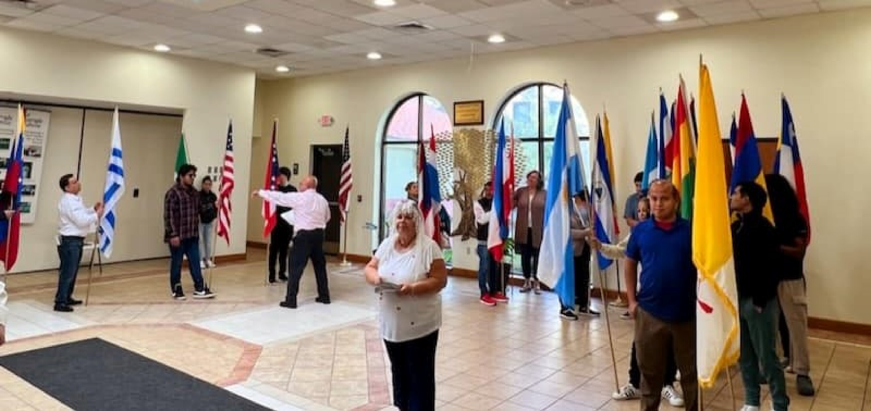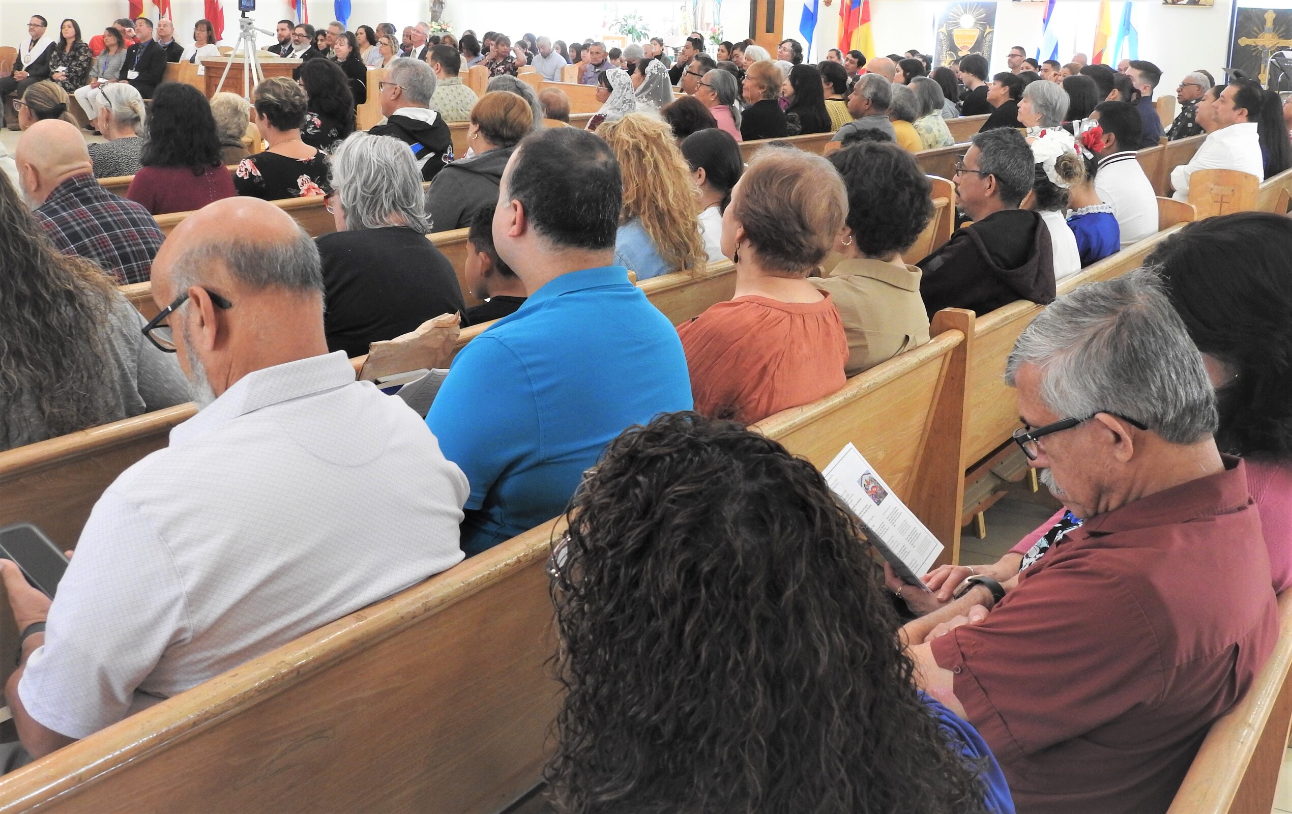 The event began with the traditional procession of flags. Members of the congregation carried about two dozen flags representing nations such as Mexico, Brazil, Nicaragua, Puerto Rico, El Salvador and other Hispanic countries, which were placed into flag holders lining the walls in the church sanctuary.