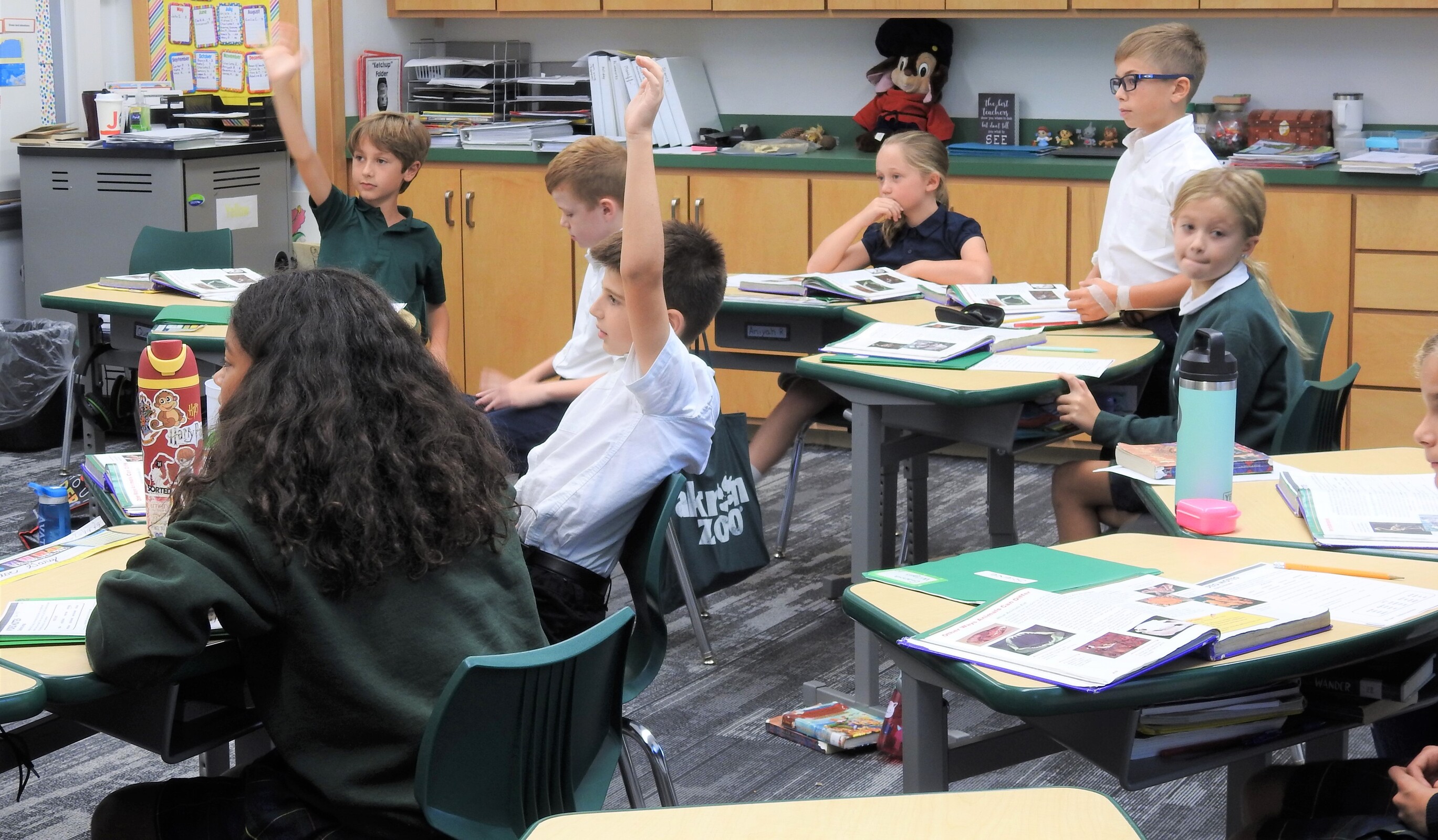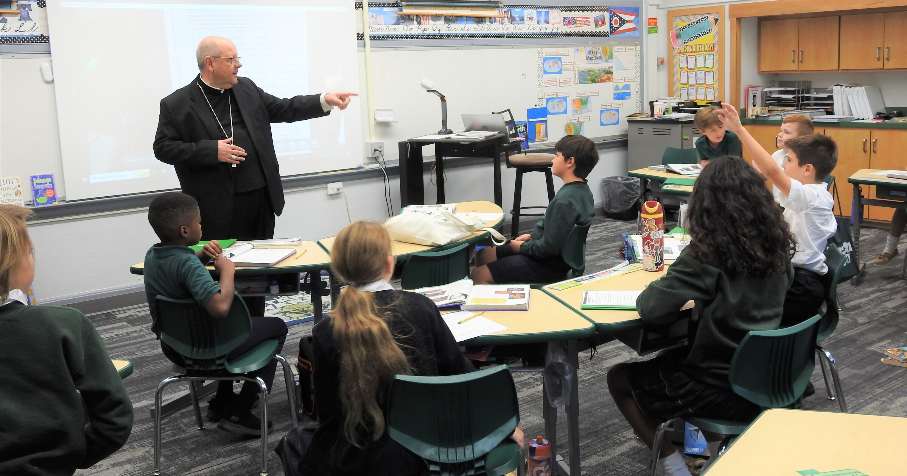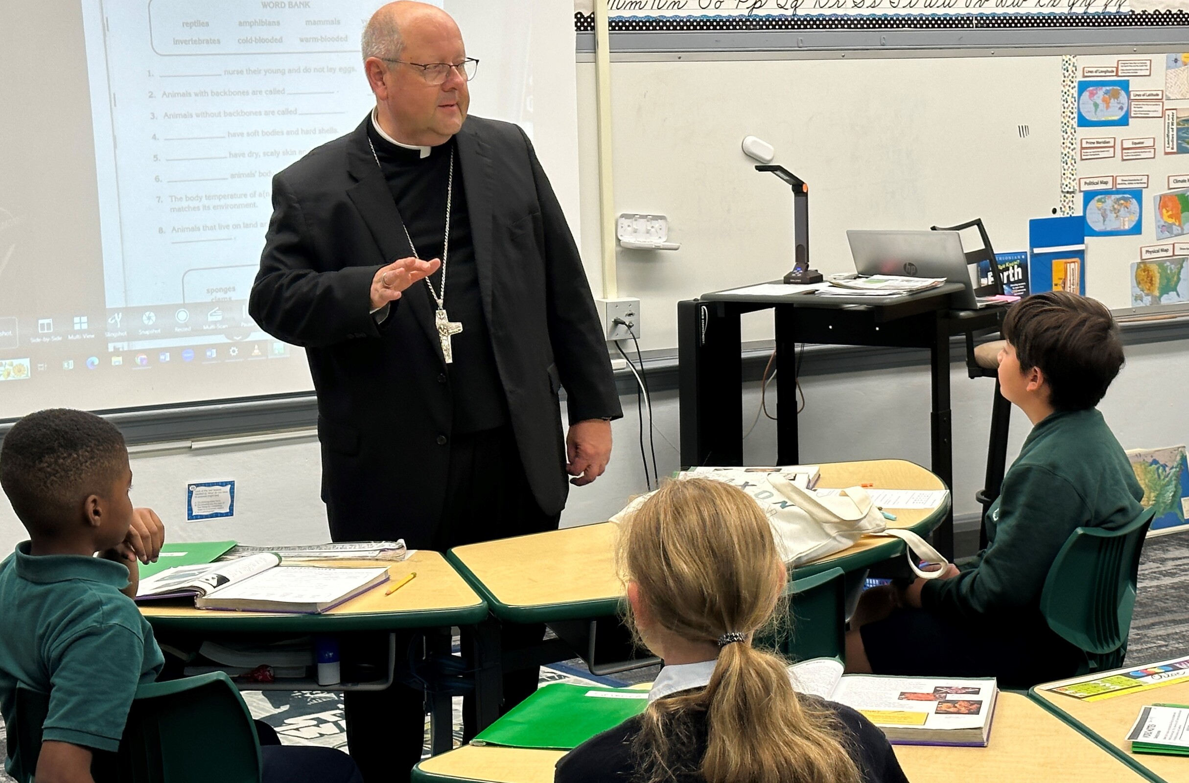 During the classroom visits, the bishop chatted with students about their favorite subjects, what they liked about school, prayer, the sacraments and other topics. He prayed with each classroom and offered a blessing before leaving.