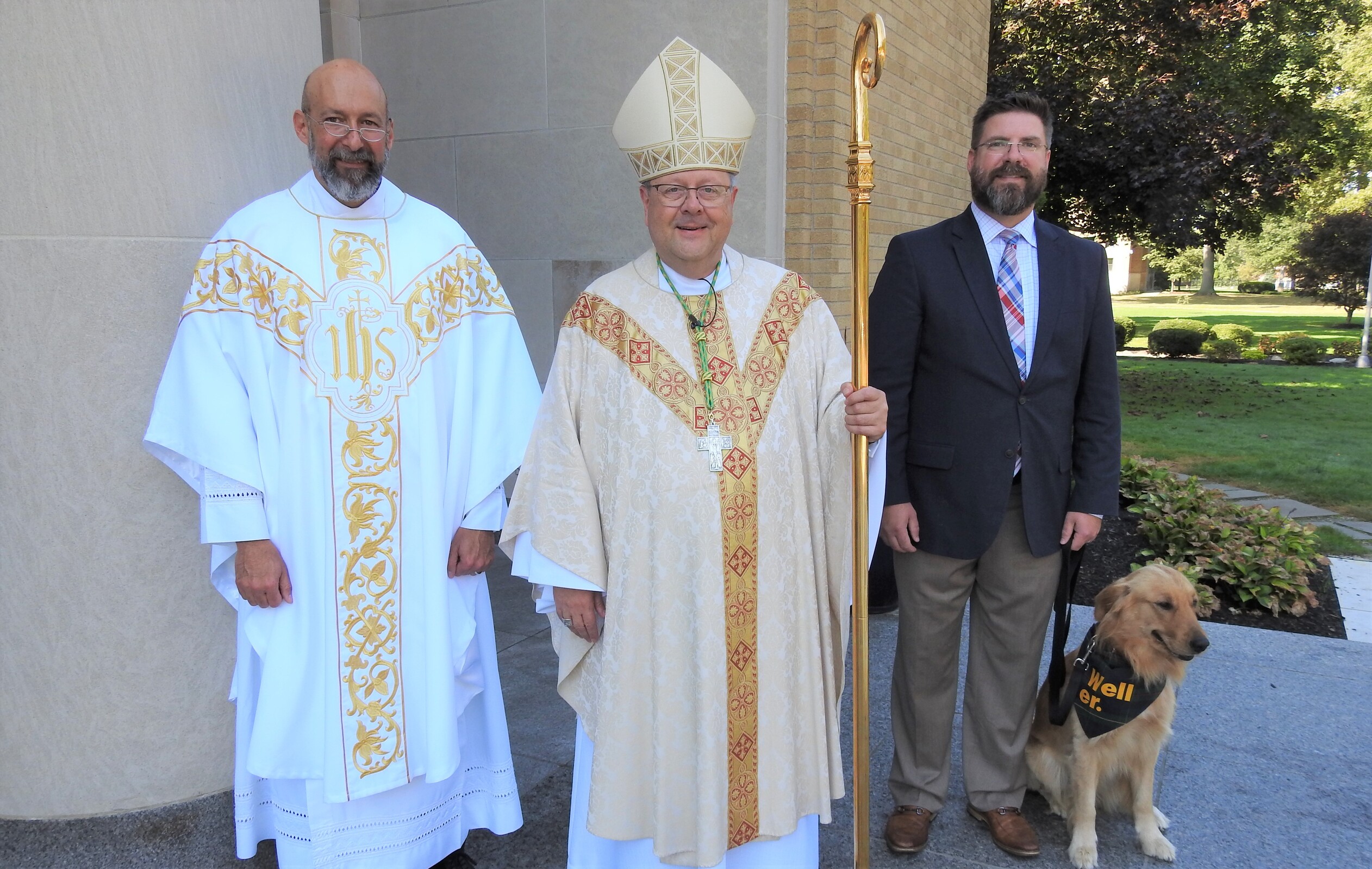 After Mass, the bishop greeted students, teachers, parents and others who attended the liturgy. He posed for photos with some, including Weller, the school’s therapy dog and family pet of Principal Anthony Rohr.