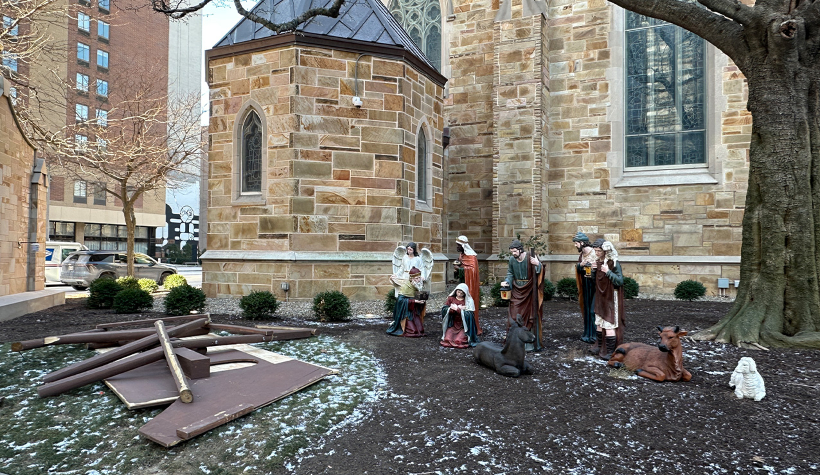 Another group helped assemble the historic creche on the Superior Avenue side of the cathedral. The creche, a gift from Bishop Joseph Schrembs, the fifth bishop of Cleveland who served 1921-1945, was blessed during a Mass on Christmas Day in 1928. The bishop ordered it from a craftsman in his native Germany. St. Francis of Assisi is credited with originating the Christmas creche in 1223.
