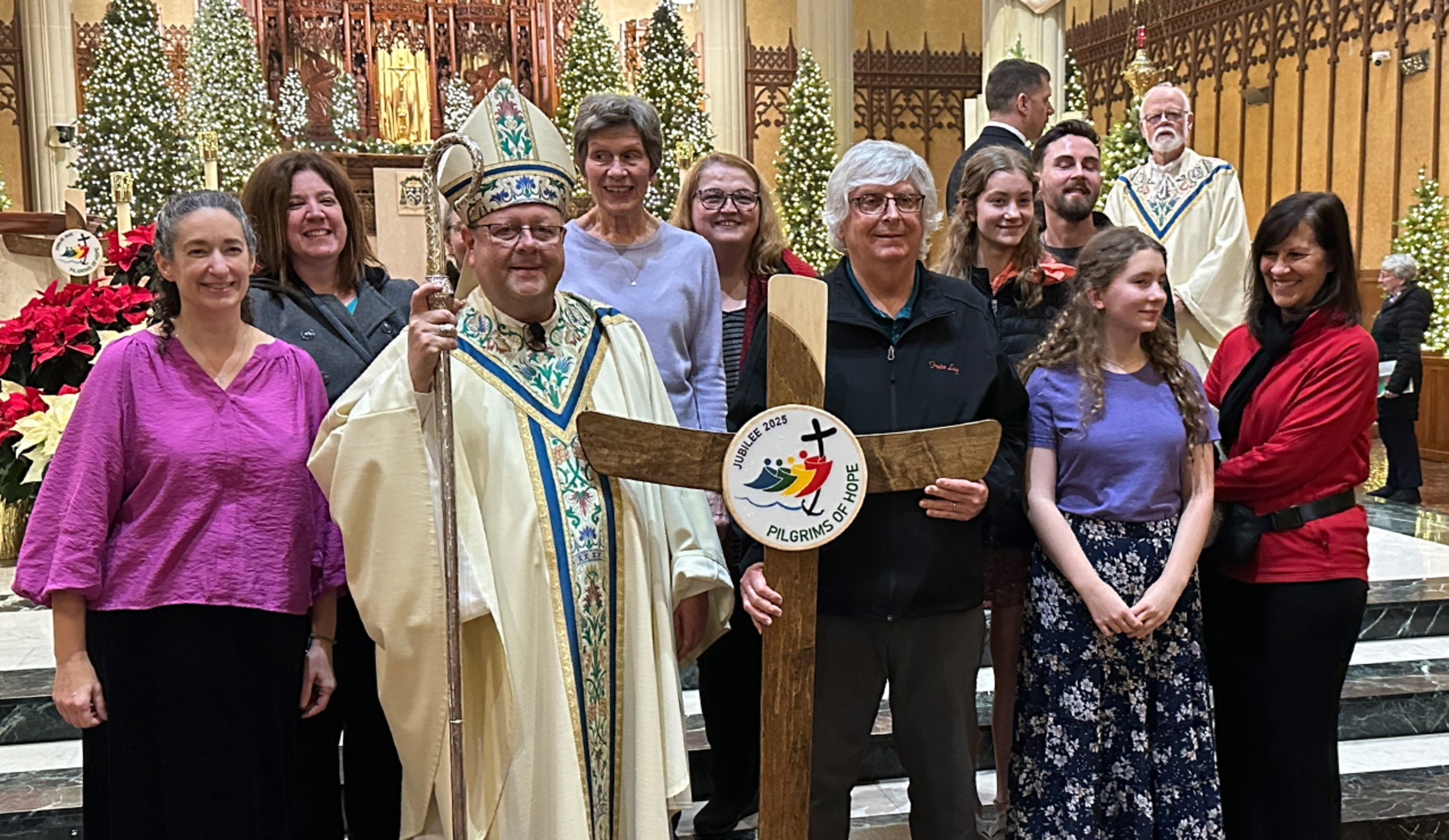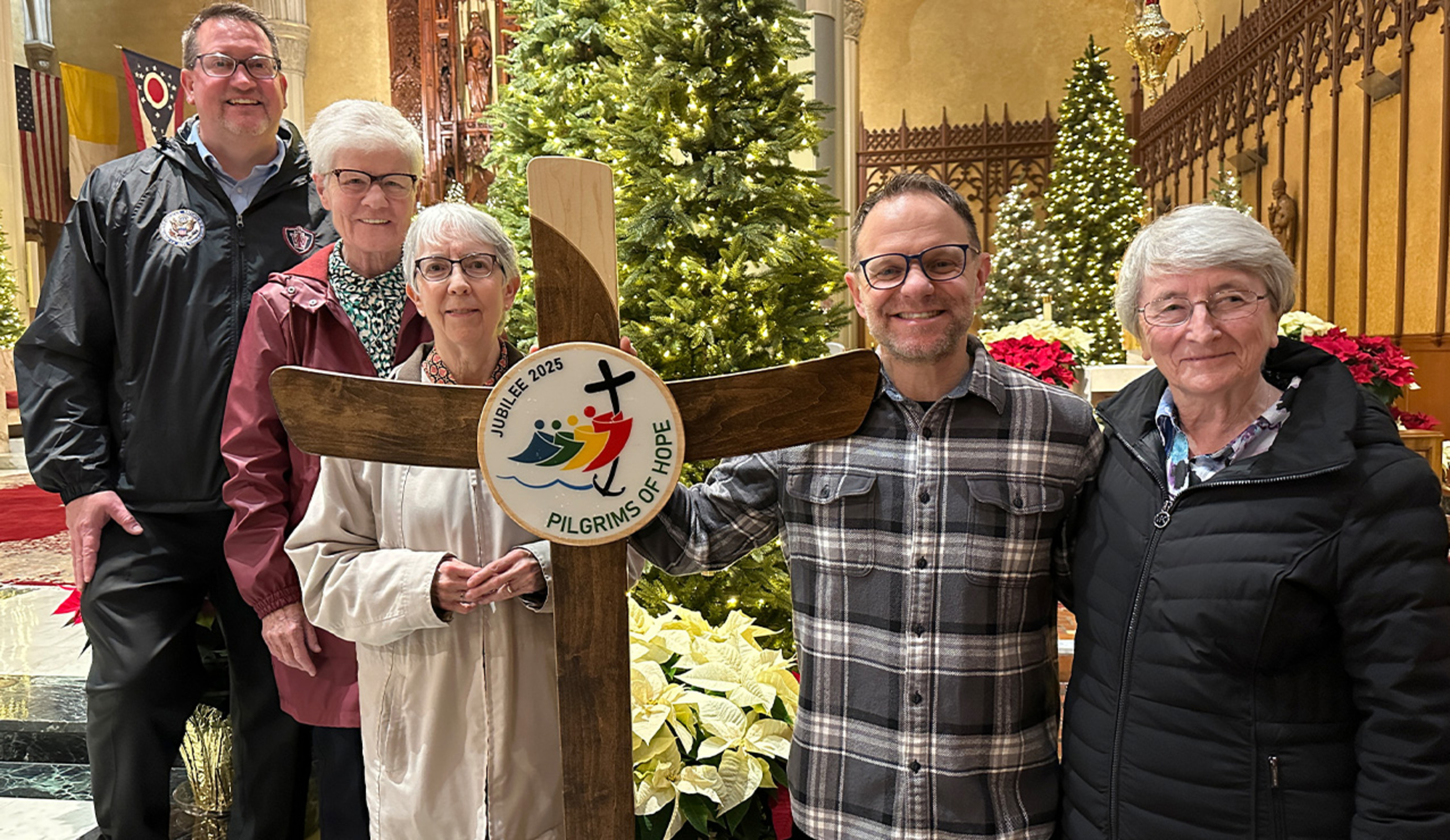 Each representative carried a special cross marking the site as a sacred place for the jubilee. The cross features an emblem with the jubilee logo, four stylized figures representing all of humanity coming from the four corners of the earth. They embrace each other to indicate the solidarity and fraternity that should unite all. The figure at the front is holding a cross as a sign of the faith. There are rough waves under the figures to symbolize that life’s pilgrimage does not always go smoothly in calm waters. The lower part of the cross is an anchor, a symbol of hope. At the bottom of the logo is the motto for the 2025 jubilee year: “Peregrinages in Spem,” which translated from Latin to English means “Pilgrims of Hope.”