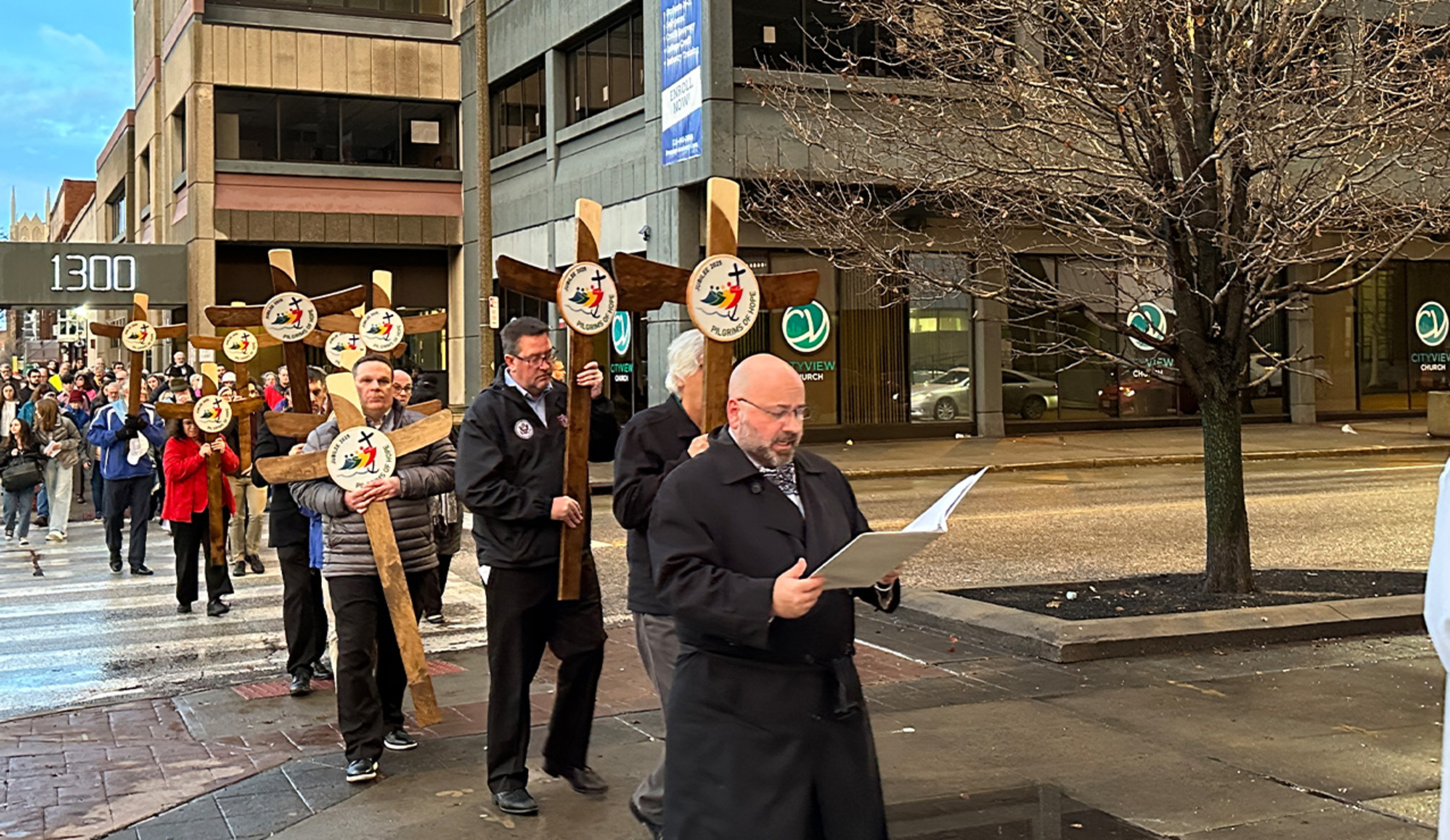 The opening prayer service included song, a Gospel reading and a brief homily before those assembled began processing along Superior Avenue to the cathedral, about eight blocks west. Leading the procession were members of the clergy and representatives of the eight parishes and three shrines that Bishop Malesic designated as sacred sites for the jubilee year.