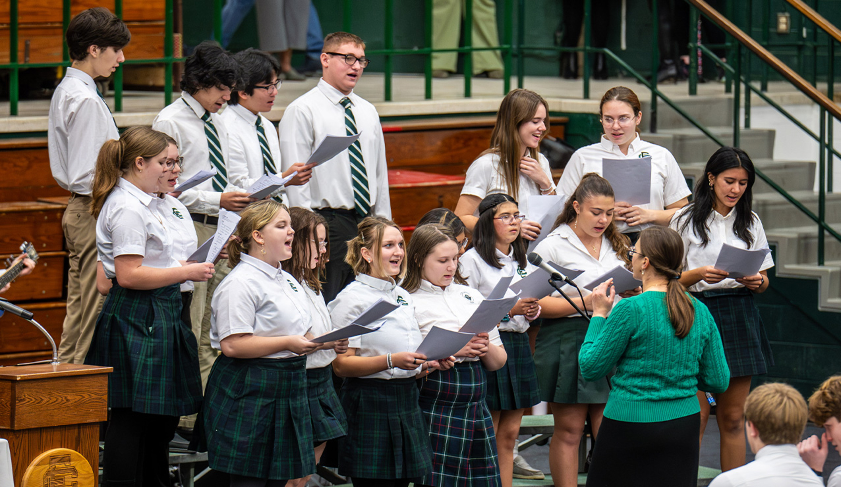 “This is the first time in a long time that all nine schools were able to attend,” said Annie Cunningham, director of communications and marketing. Students sat in groups by school with signs indicating their school name.