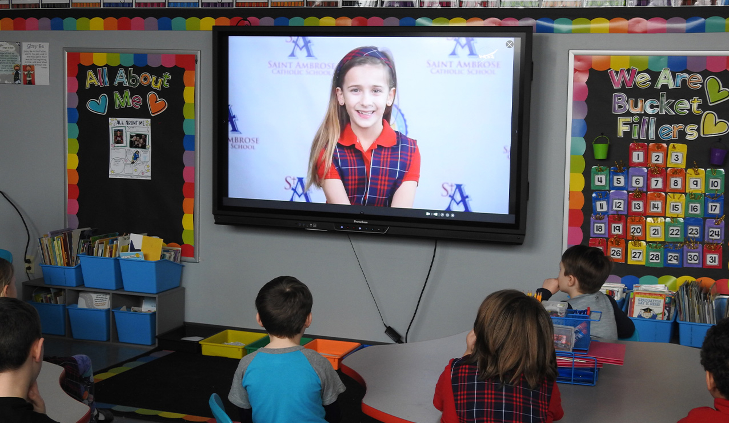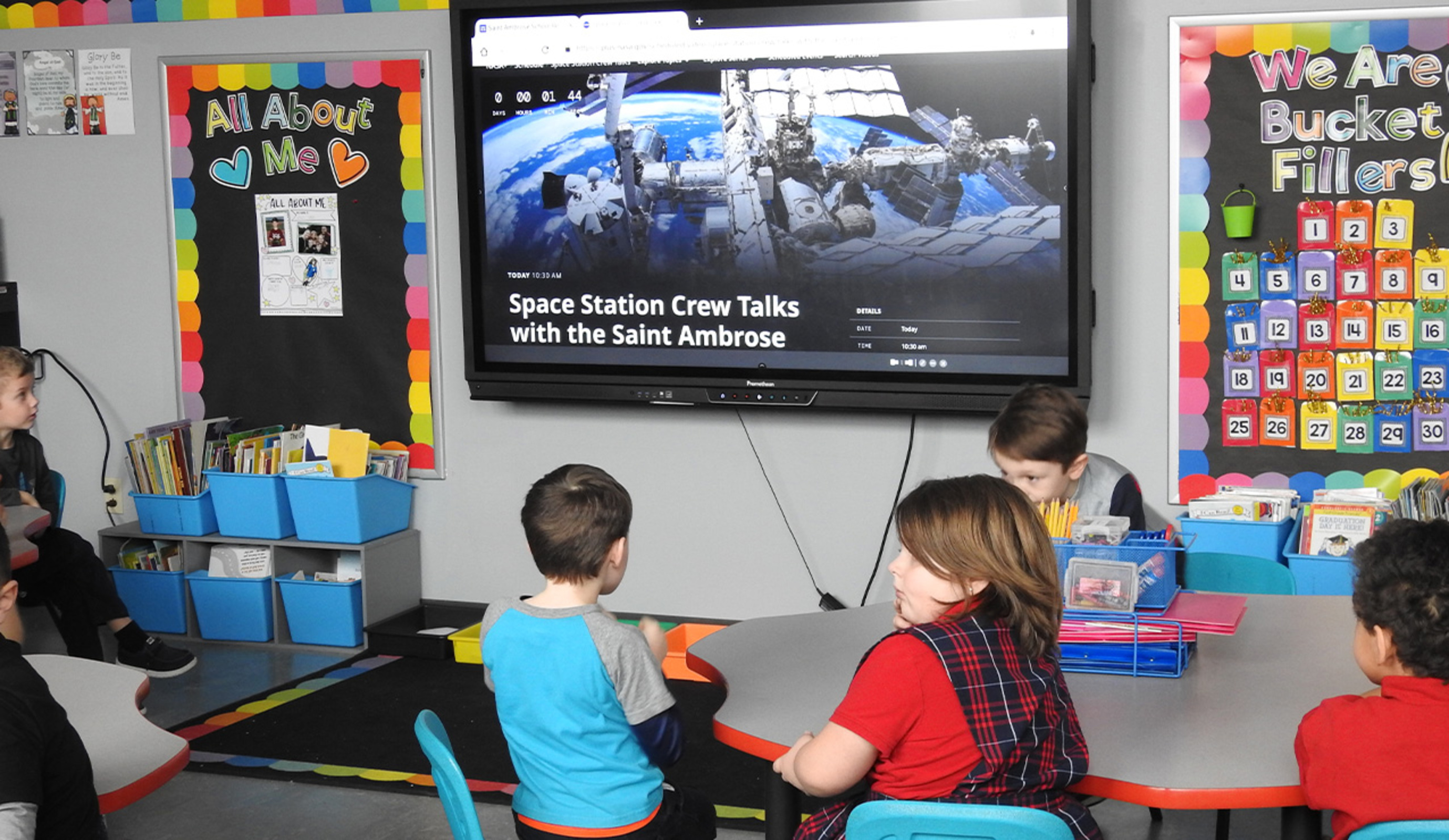 The live broadcast was shared through NASA’s live link. Students and others across the state and the world could join the broadcast to hear and learn from the astronauts. St. Ambrose students in grades preschool through eight tuned in on the large screens in their classrooms to watch and listen to fellow students ask questions of the astronauts and to hear their responses.