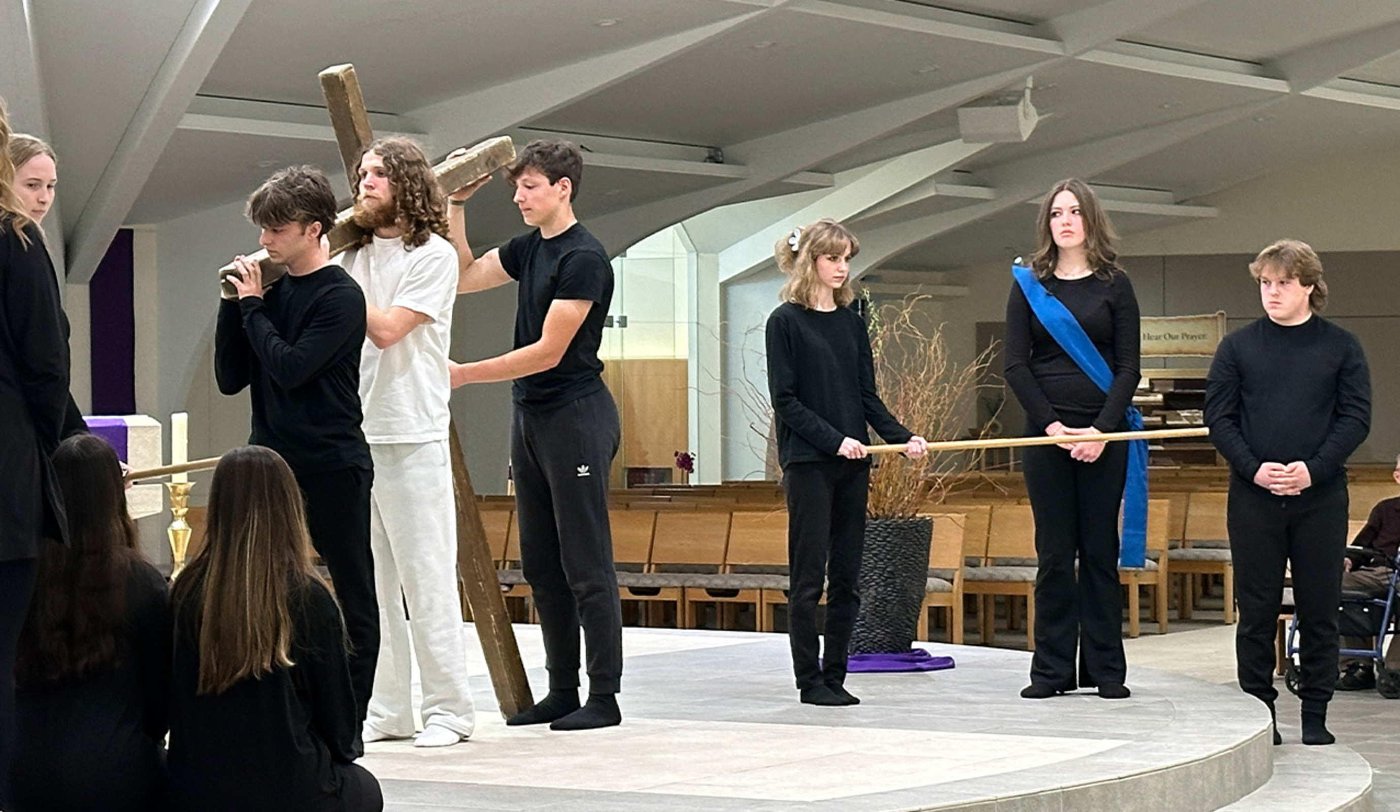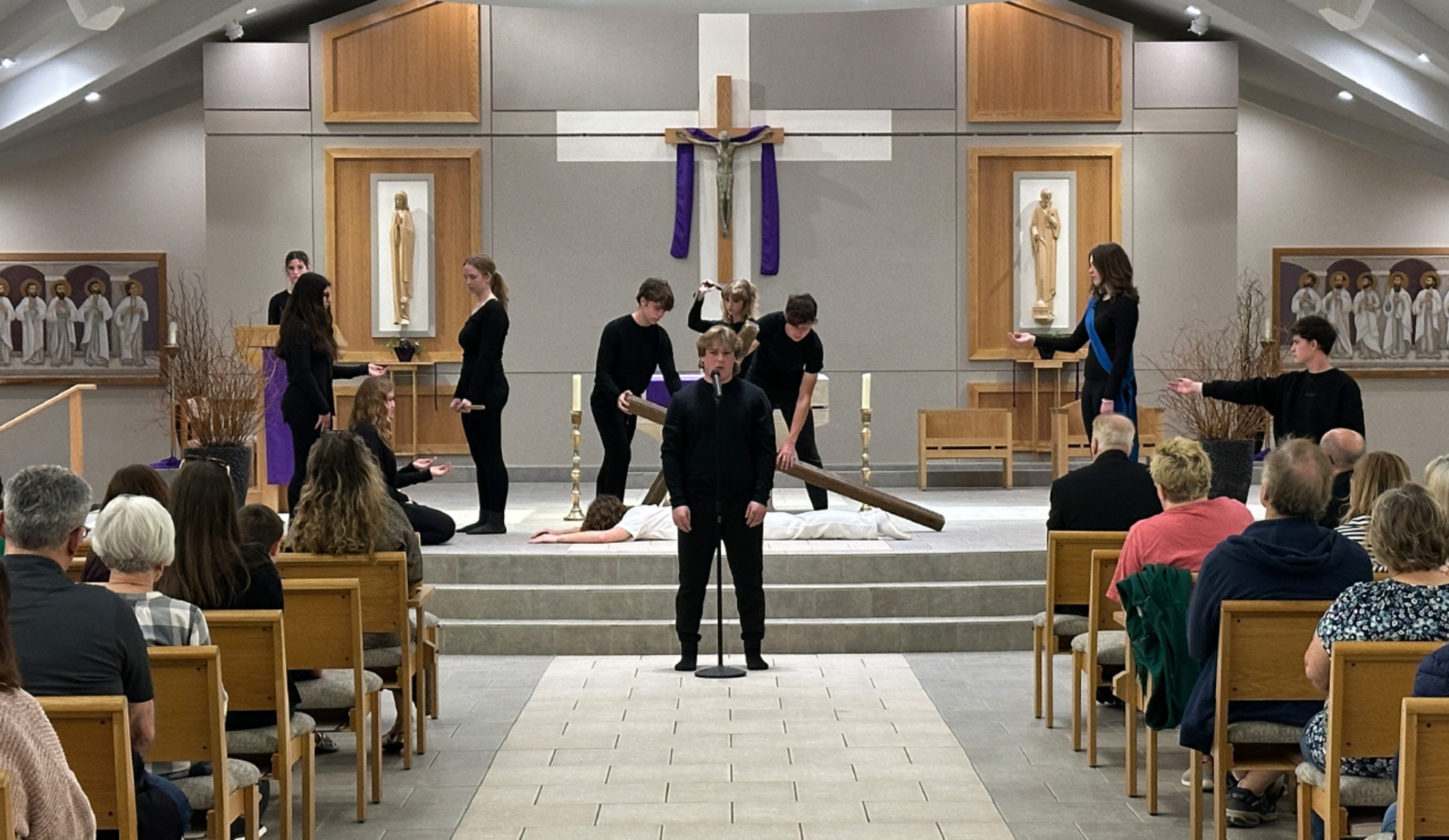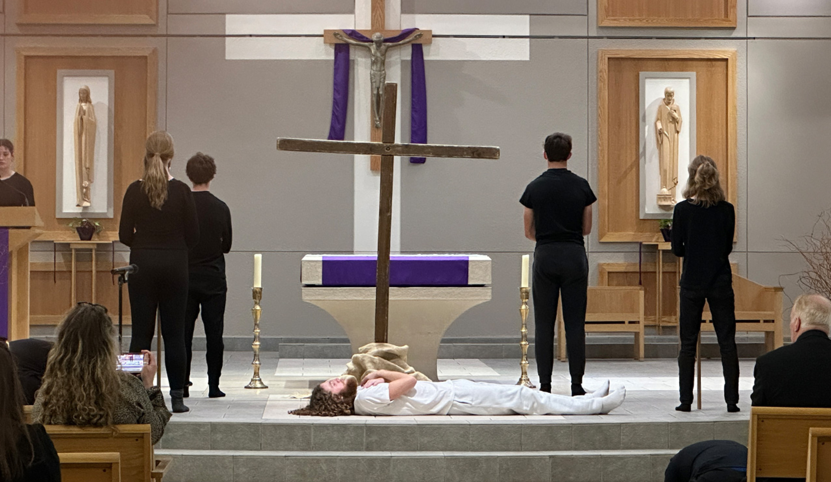 Sara Lanzola, EC director of campus ministry, said the script has been essentially unchanged throughout the years. Fifteen seniors are featured in this year’s cast: Trevor McMahon (Jesus); Courtney Hoplard and Dakota Jones (Mary); Mark Boehm (Simon); Kayla Linden (Veronica); Andrew Post (Peter); Christian Soltis (Pilate); Brace Dillinger (Guard 1); Natalia Dyson (Guard 2); Avery Collins (Guard 3); Connor Soltis (Guard 4); Veronica Duffy (Woman 1); Nicole DeLuca (Woman 2) and Maegen Kundrik and Macie Wakefield (Narrators).