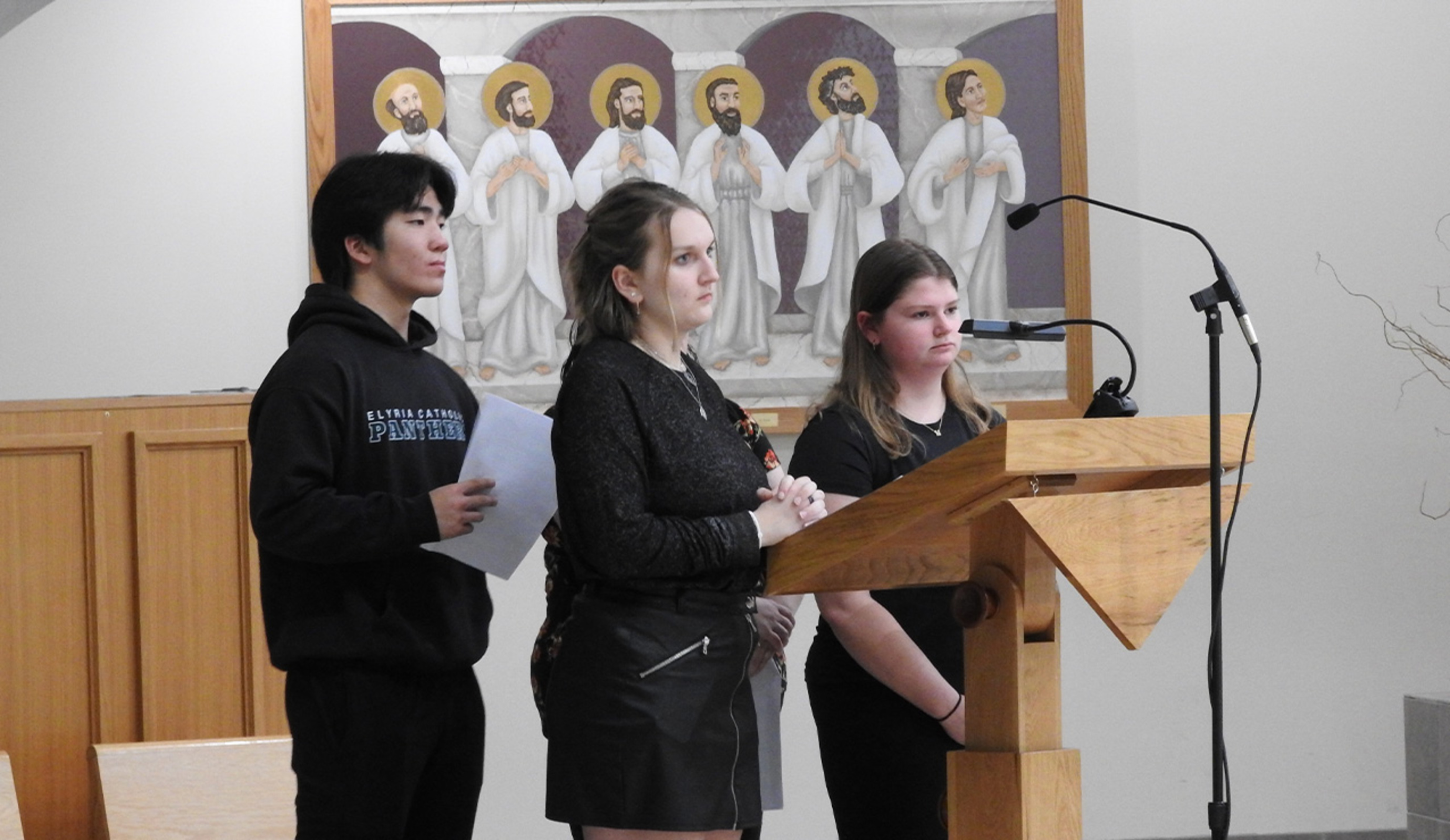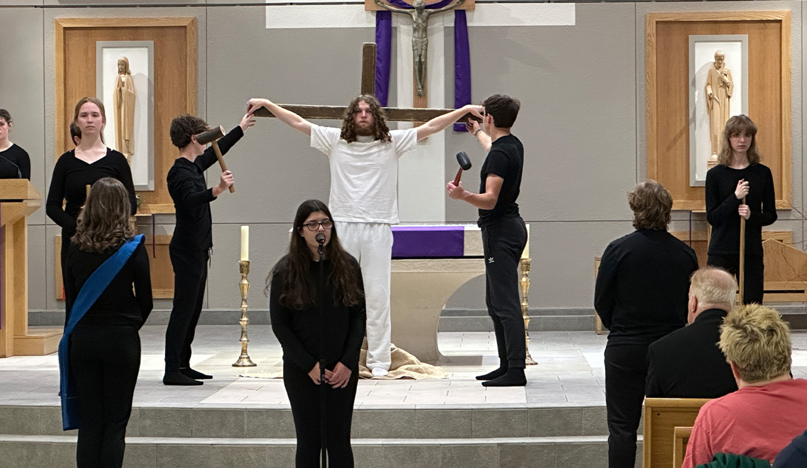 Then, instead of praying the Stations of the Cross in the church, Bishop Malesic attended the Living Stations of the Cross presented by students from Elyria Catholic High School. EC has offered the stations during Lent for nearly 30 years at various location in the Diocese of Cleveland. Lisa Belza, St. Ladislas director of faith formation, introduced the production. She noted that her children attended EC.