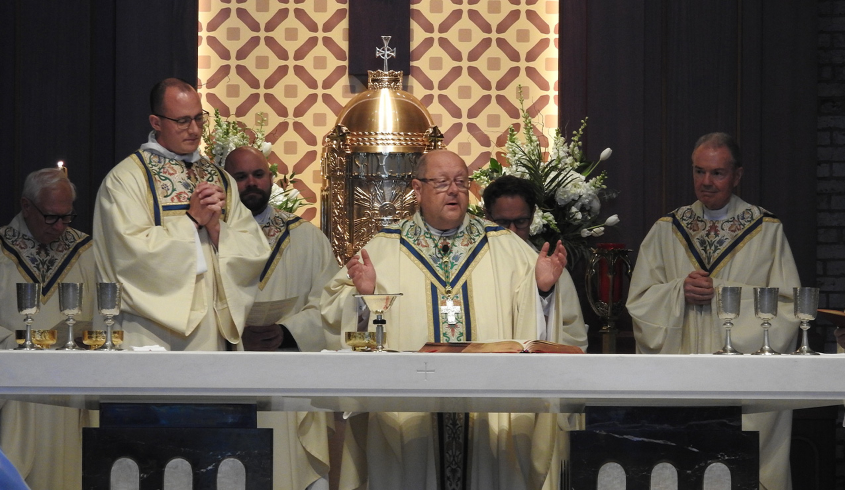 Principal celebrant of the Mass was Bishop Edward Malesic, with Auxiliary Bishop Michael Woost, Auxiliary Bishop emeritus Roger Gries, OSB, Bishop Martin Amos, retired bishop of Davenport, Iowa, and several other priests concelebrating.