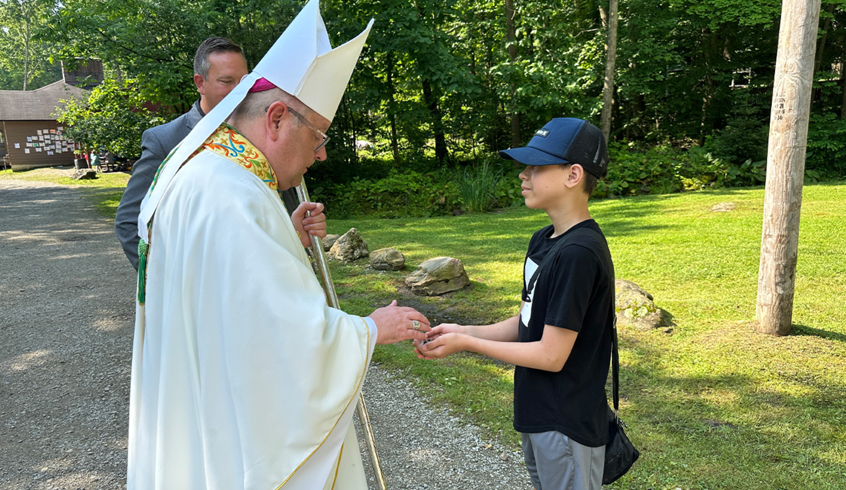 After Mass, he chatted with campers and blessed a rosary for one boy. He also spent some time talking with Jim Mullen, president and CEO of Catholic Charities, camp officials and others.