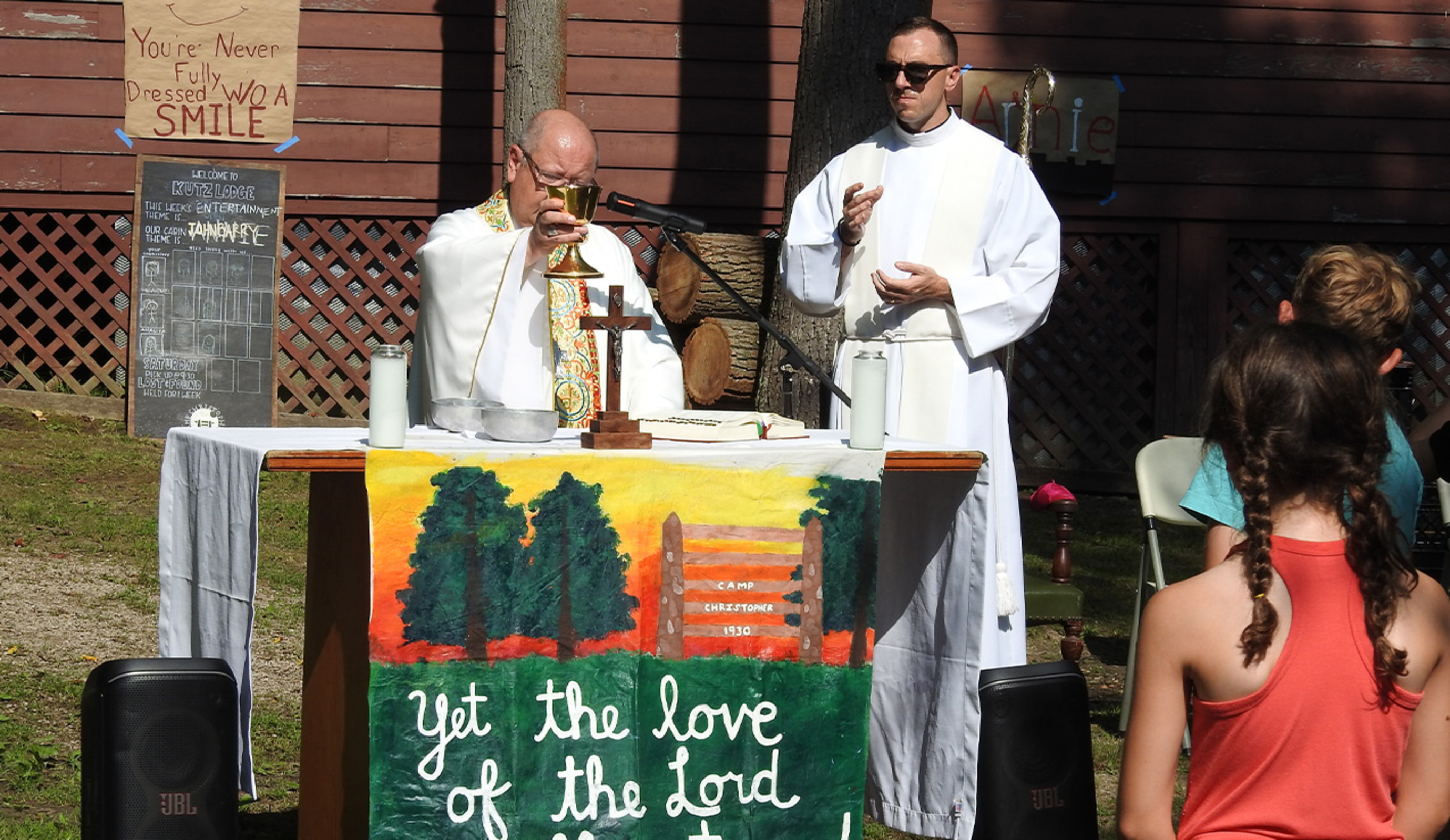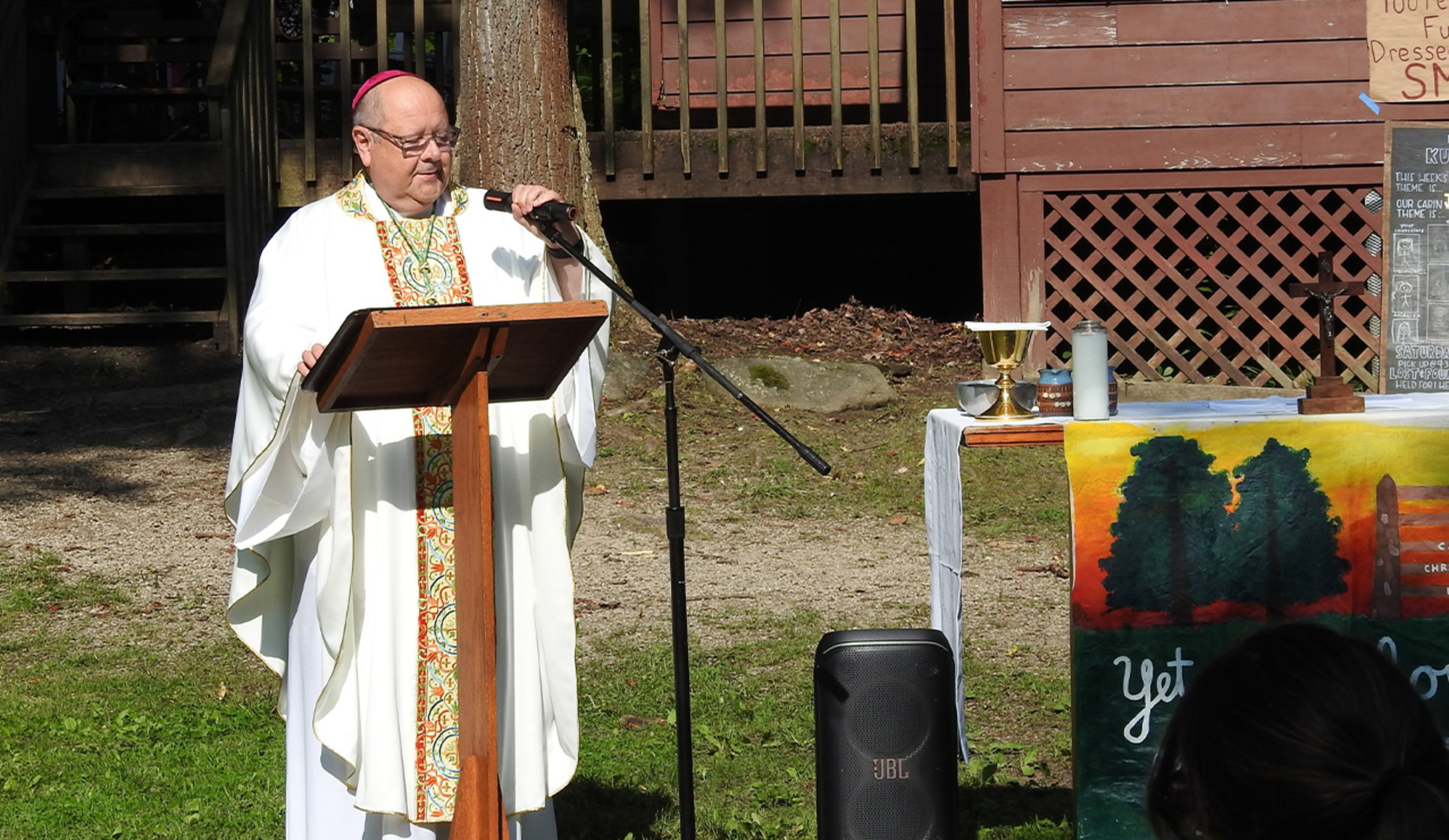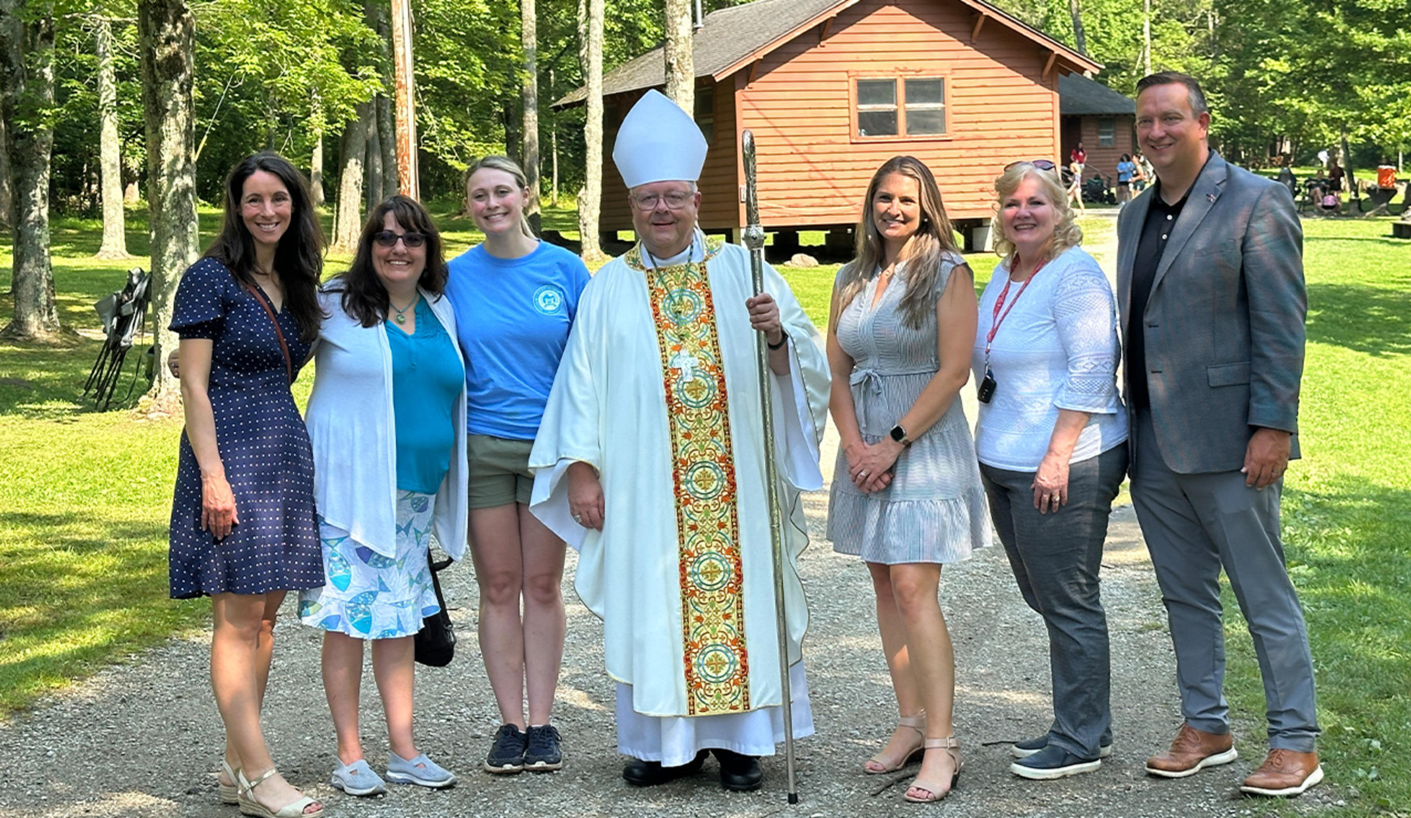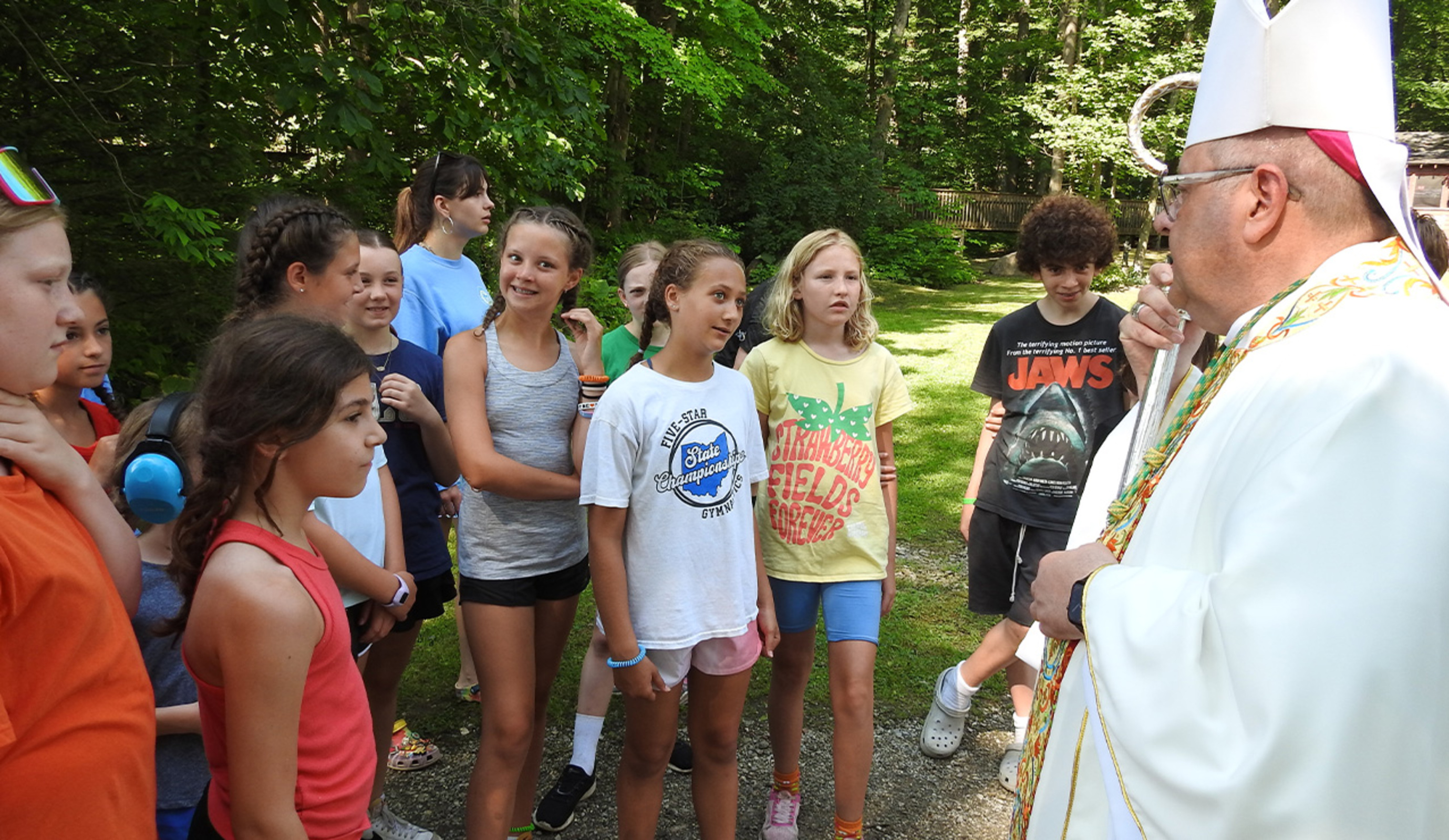 A group of campers, counselors, staff members and Catholic Charities, Diocese of Cleveland officials gathered outdoors at Camp Christopher for a Mass celebrated by Bishop Edward Malesic the morning of June 28, the Solemnity of the Most Sacred Heart of Jesus.