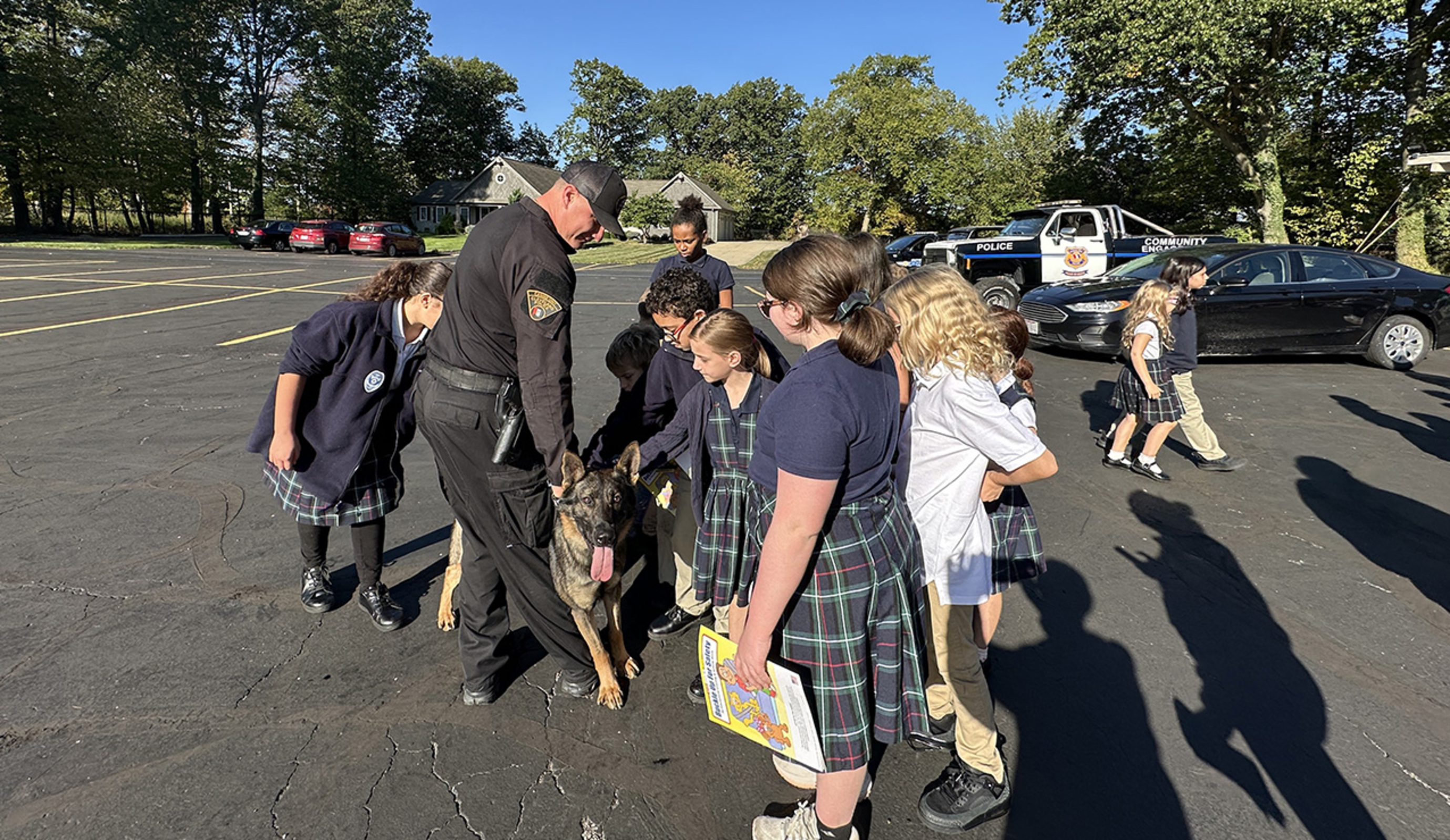 Older students paired up with their younger “buddies” to visit first responders and interact with Scout, a Cleveland Police Department K9.