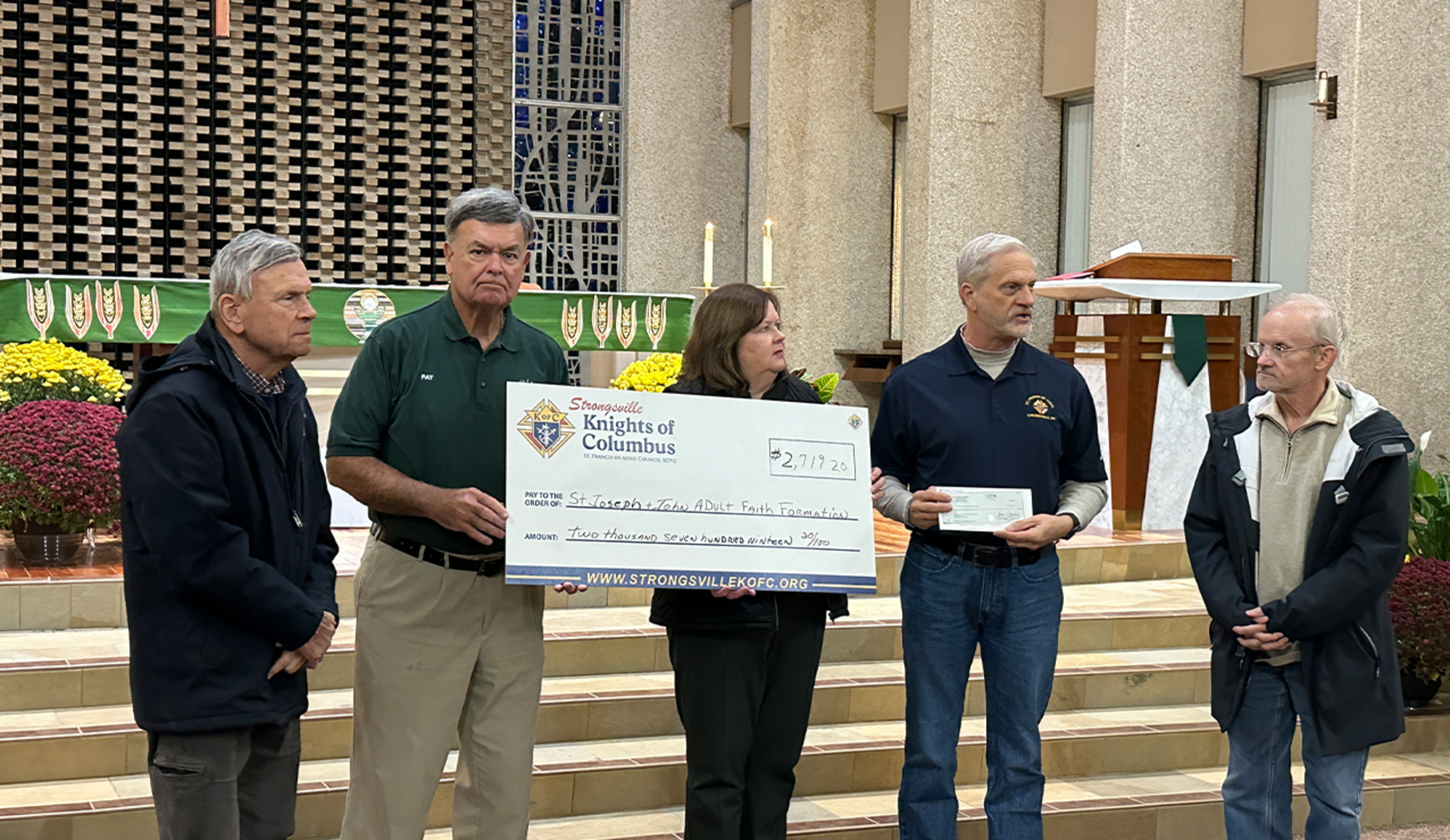 She credited the Strongsville Knights of Columbus, St. Francis of Assisi Council No. 10792 for their assistance. The Knights presented her with a $2,719.20 check to be used for the program’s meeds. The funds were raised during the Knights’ annual “Measure Up” Campaign conducted by at both St. Joseph and St. John Neumann parishes in Strongsville. They are used for a variety of things including the faith formation program, music and the Sensory Friendly Mass.