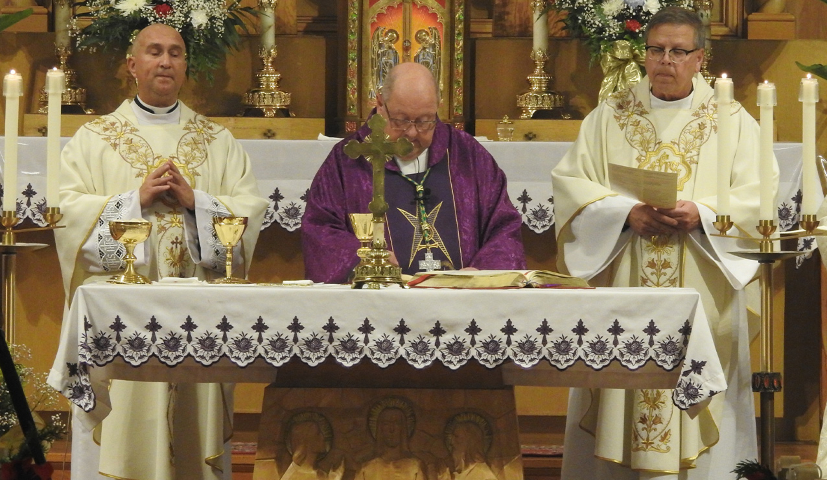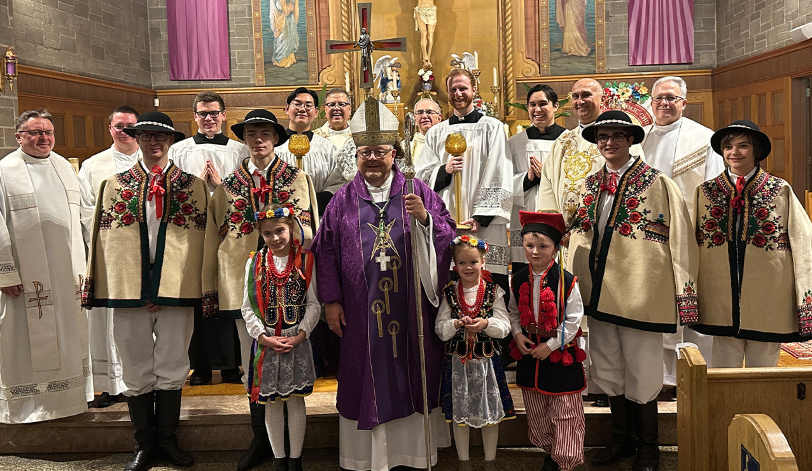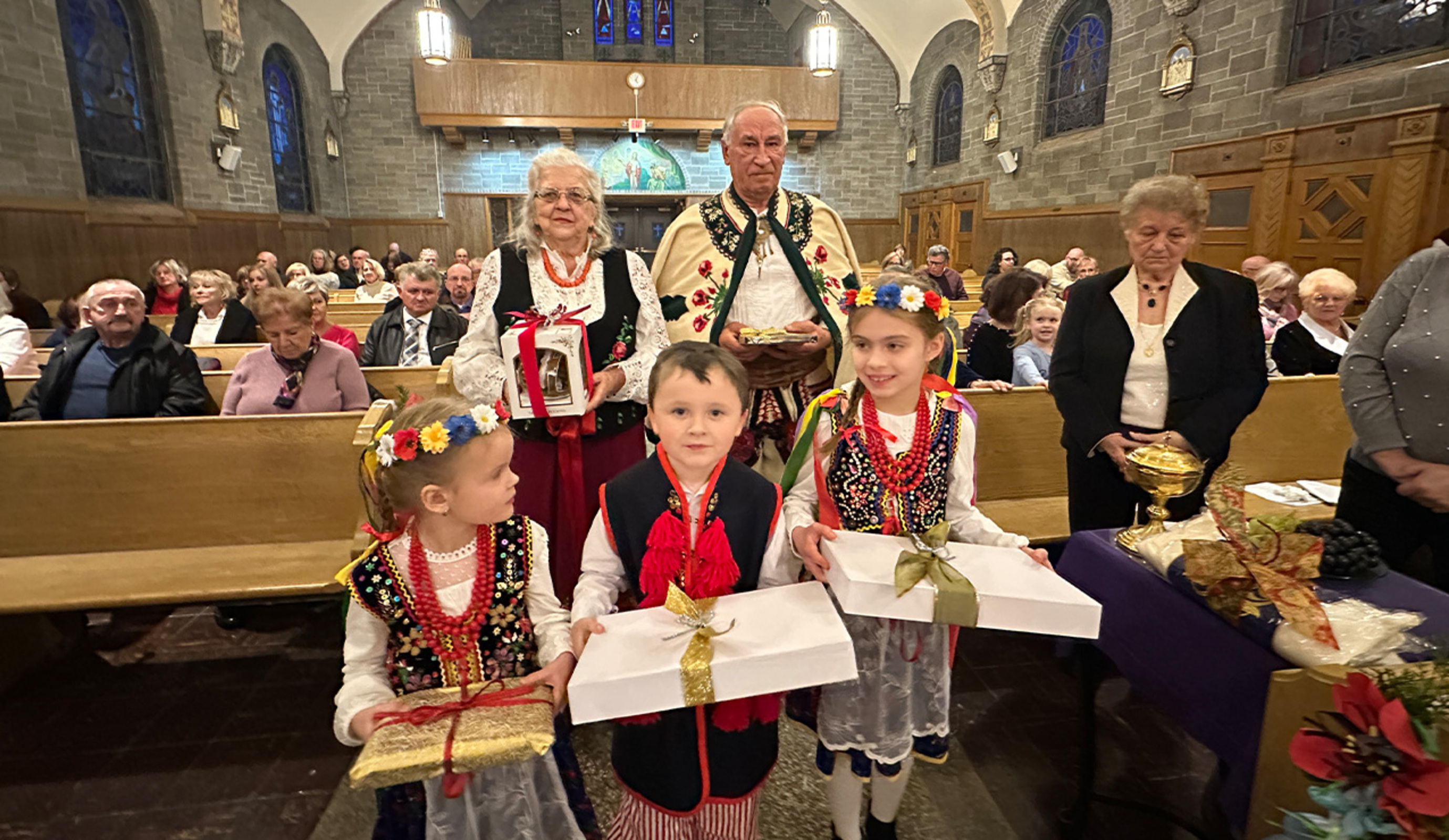As the Mass began, parishioners – some in traditional Polish garb – presented the bishop with gifts including bread and flowers.