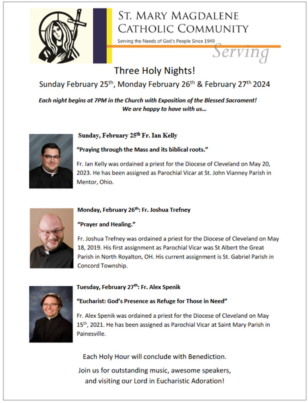 Tuesday (Feb 27): Fr. Alex Spenik "Eucharist: God’s Presence as Refuge for Those in Need” Fr. Alex Spenik was ordained a priest for the Diocese of Cleveland on May 15th, 2021. He has been assigned as Parochial Vicar at Saint Mary Parish in Painesville.