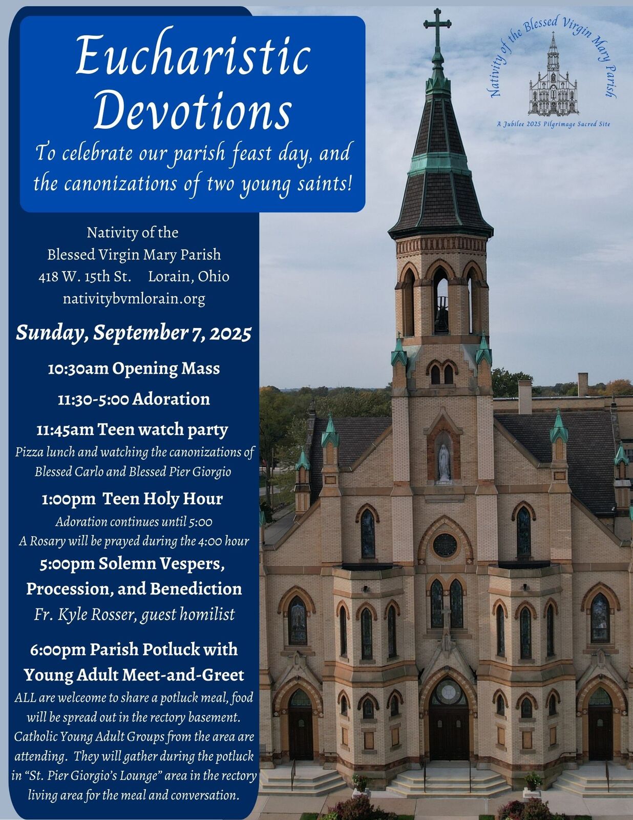 10:30 AM Mass followed by Eucharistic Devotions throughout the day will culminate in a Potluck dinner with a special "St. Pier Giorgio's Lounge" for young adults.